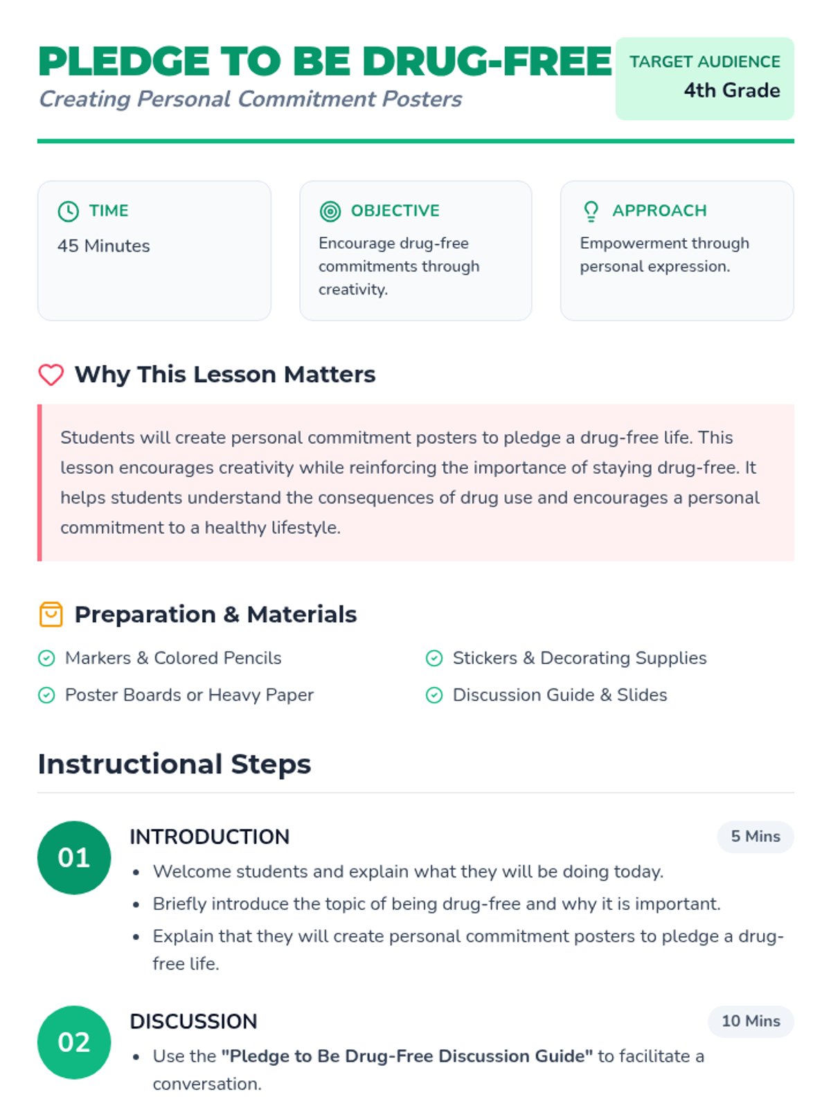 Students explore the importance of living a healthy, drug-free life and create personal commitment posters to solidify their pledge. This lesson focuses on positive decision-making and the long-term benefits of healthy choices.