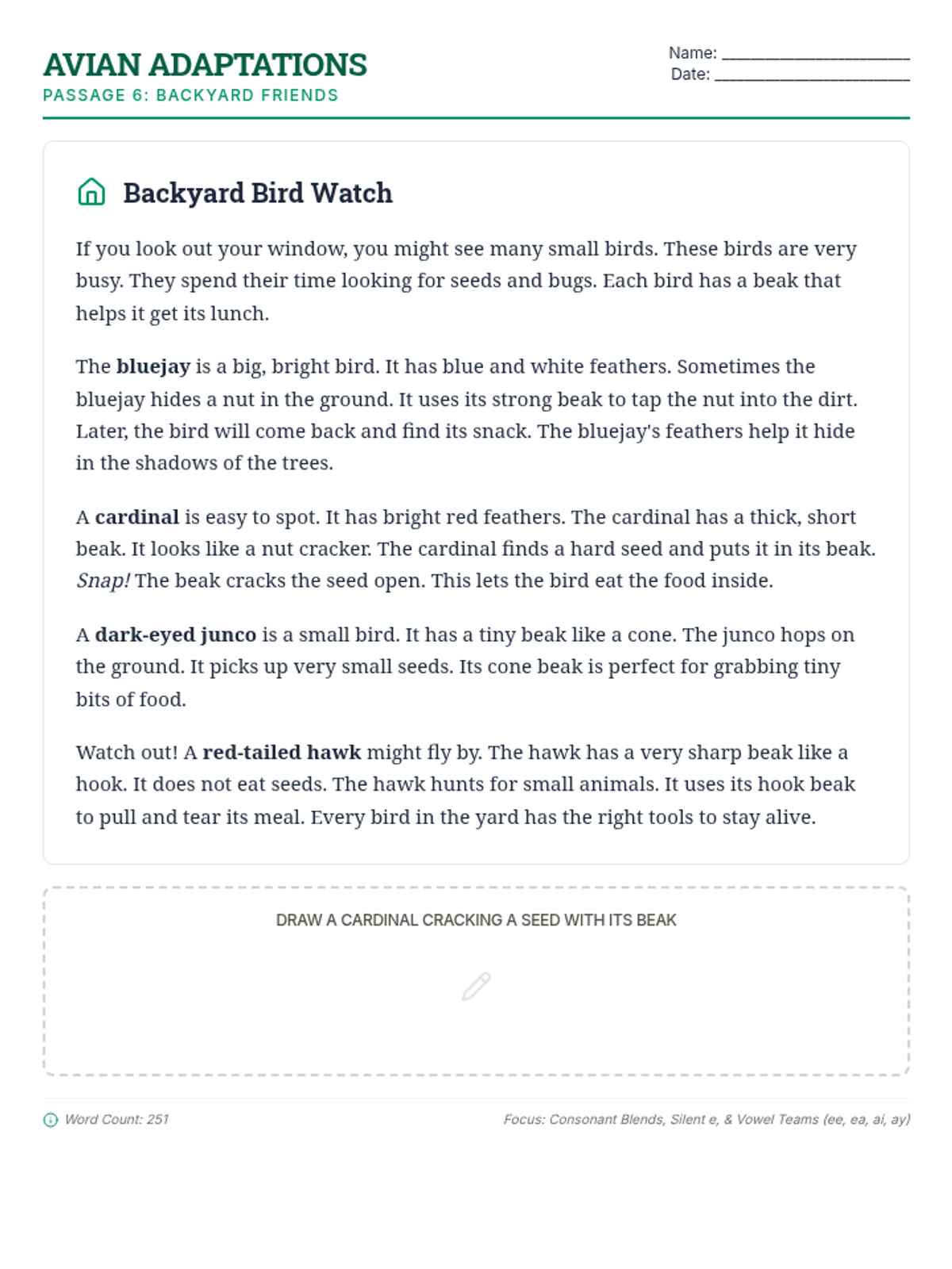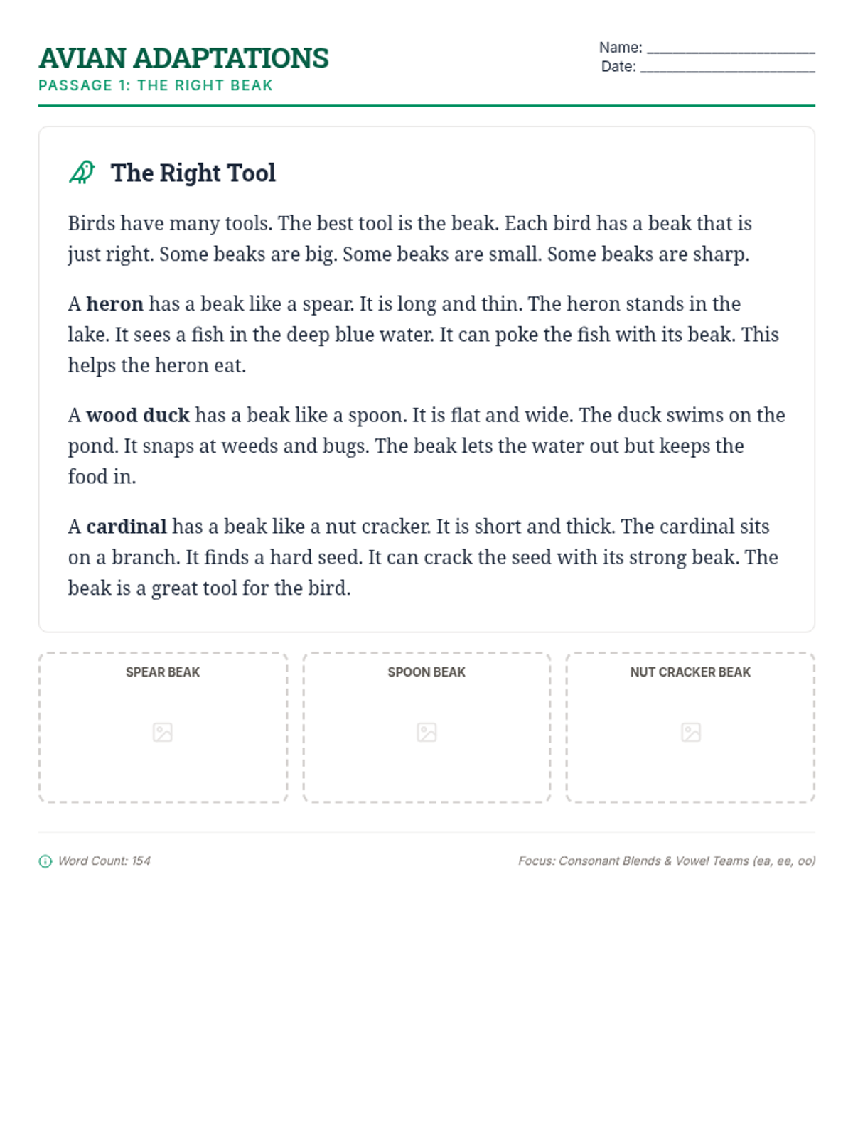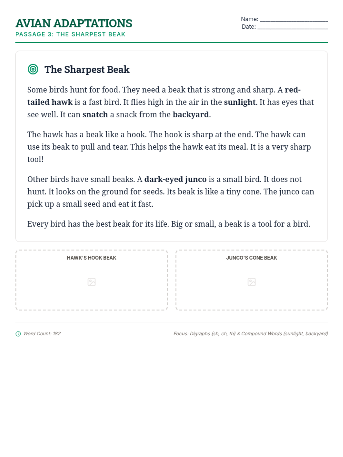 A collection of Grade 1 decodable passages focusing on bird adaptations, specifically beaks and feathers, featuring common North American and exotic birds.