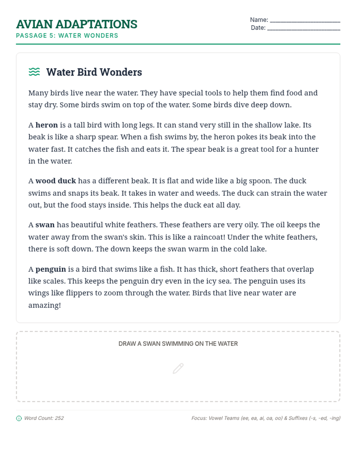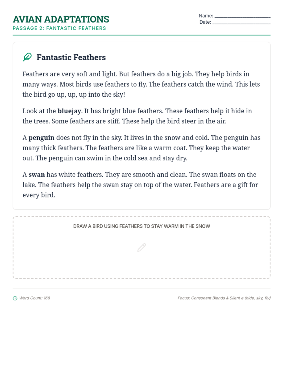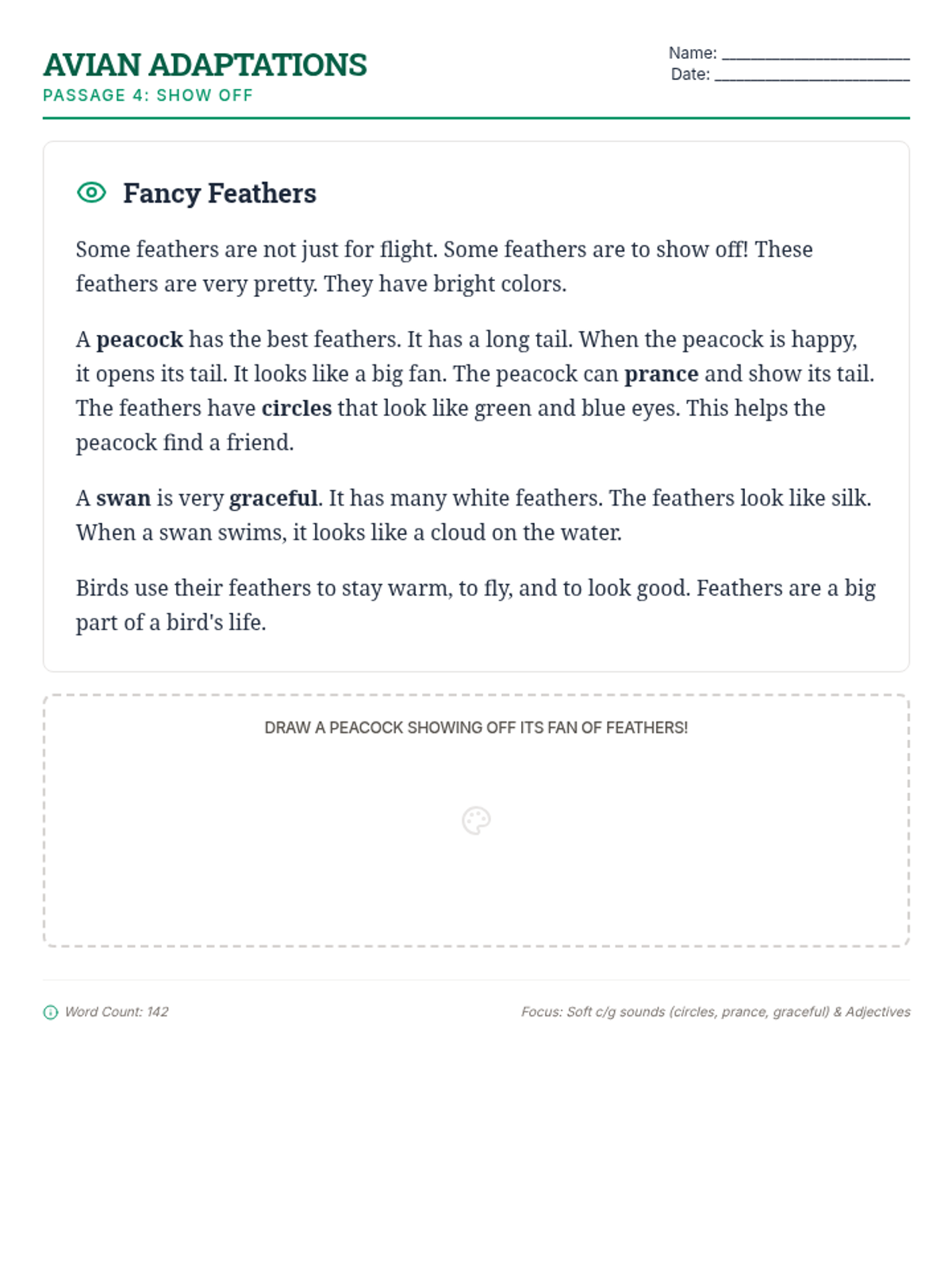 A collection of Grade 1 decodable passages focusing on bird adaptations, specifically beaks and feathers, featuring common North American and exotic birds.