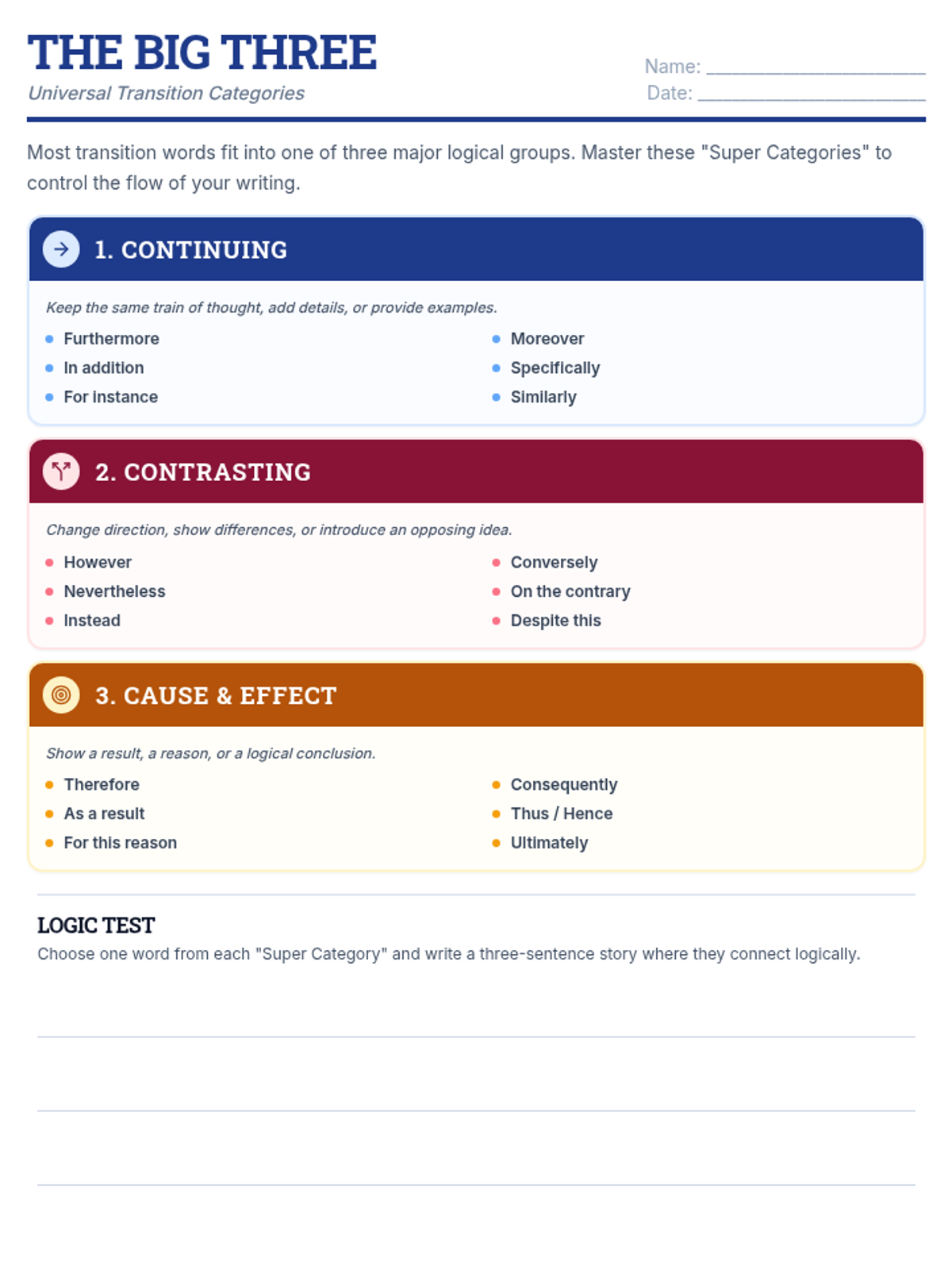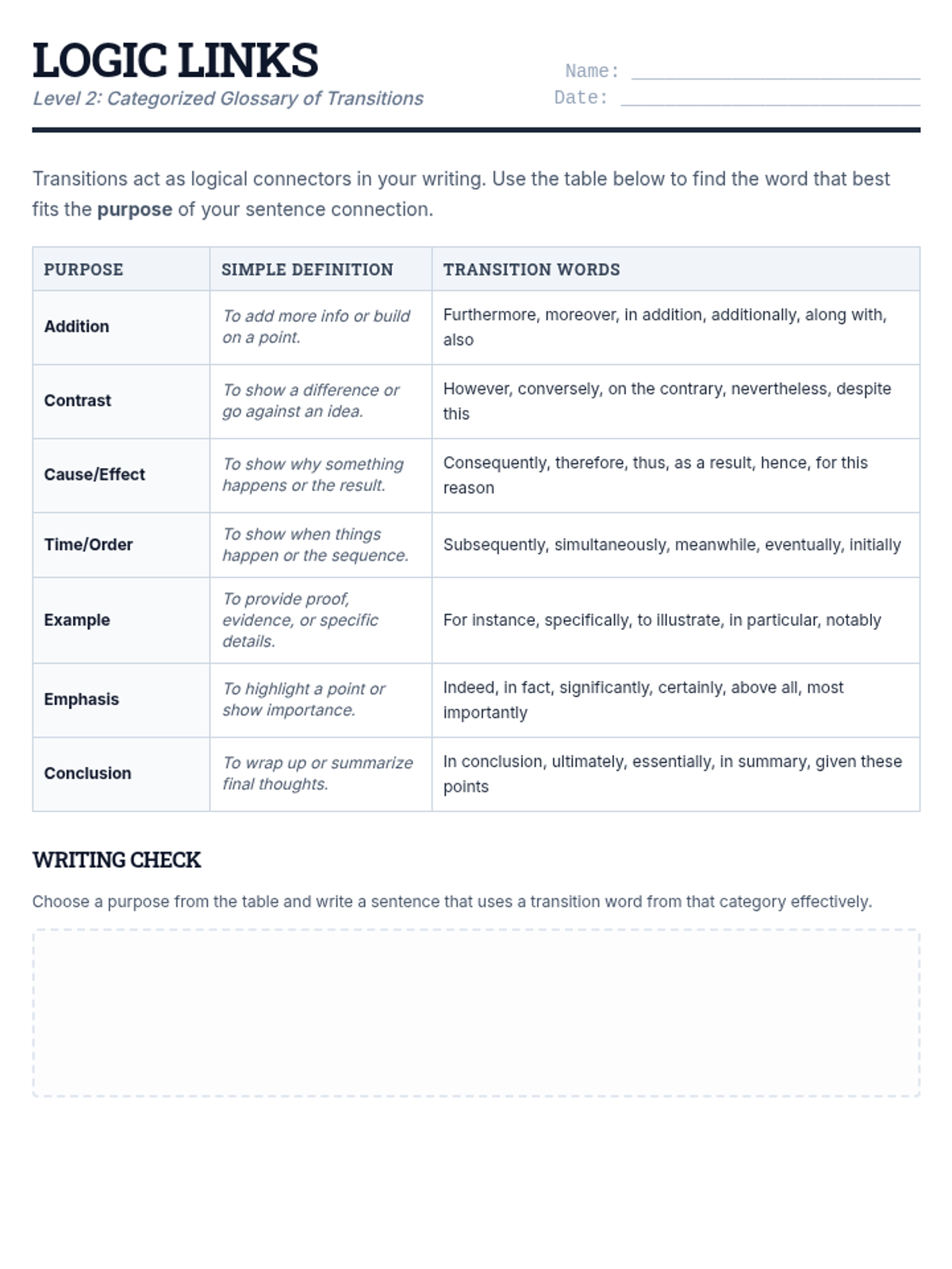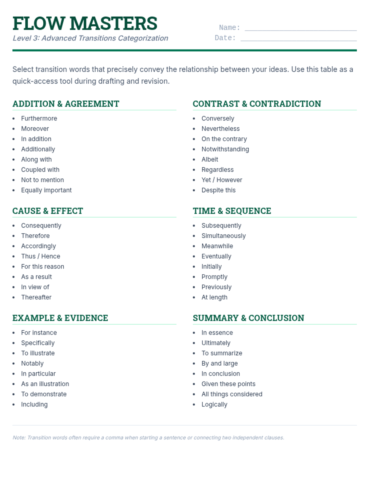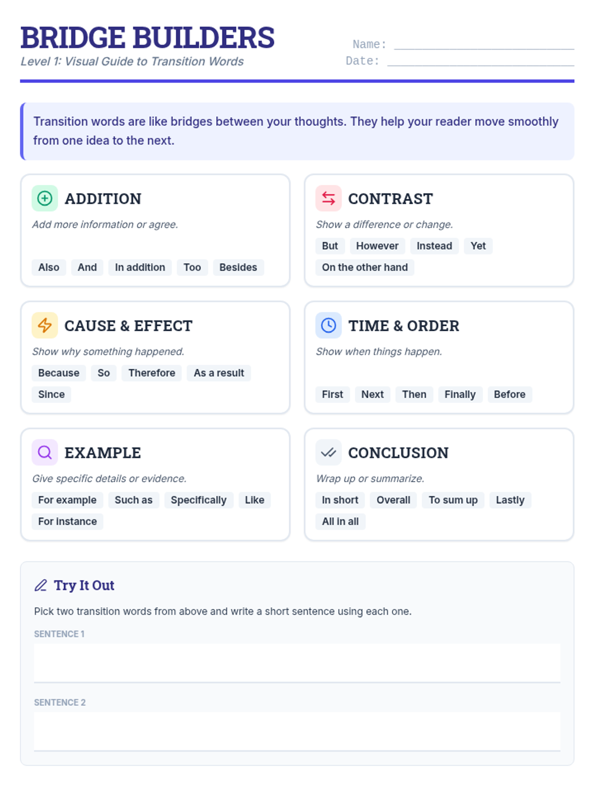 A lesson focused on helping 9th-grade students master writing flow and logic through transition words and parallel structure. This lesson provides differentiated reference sheets for both topics.