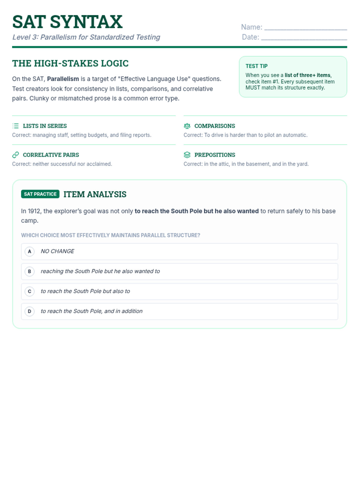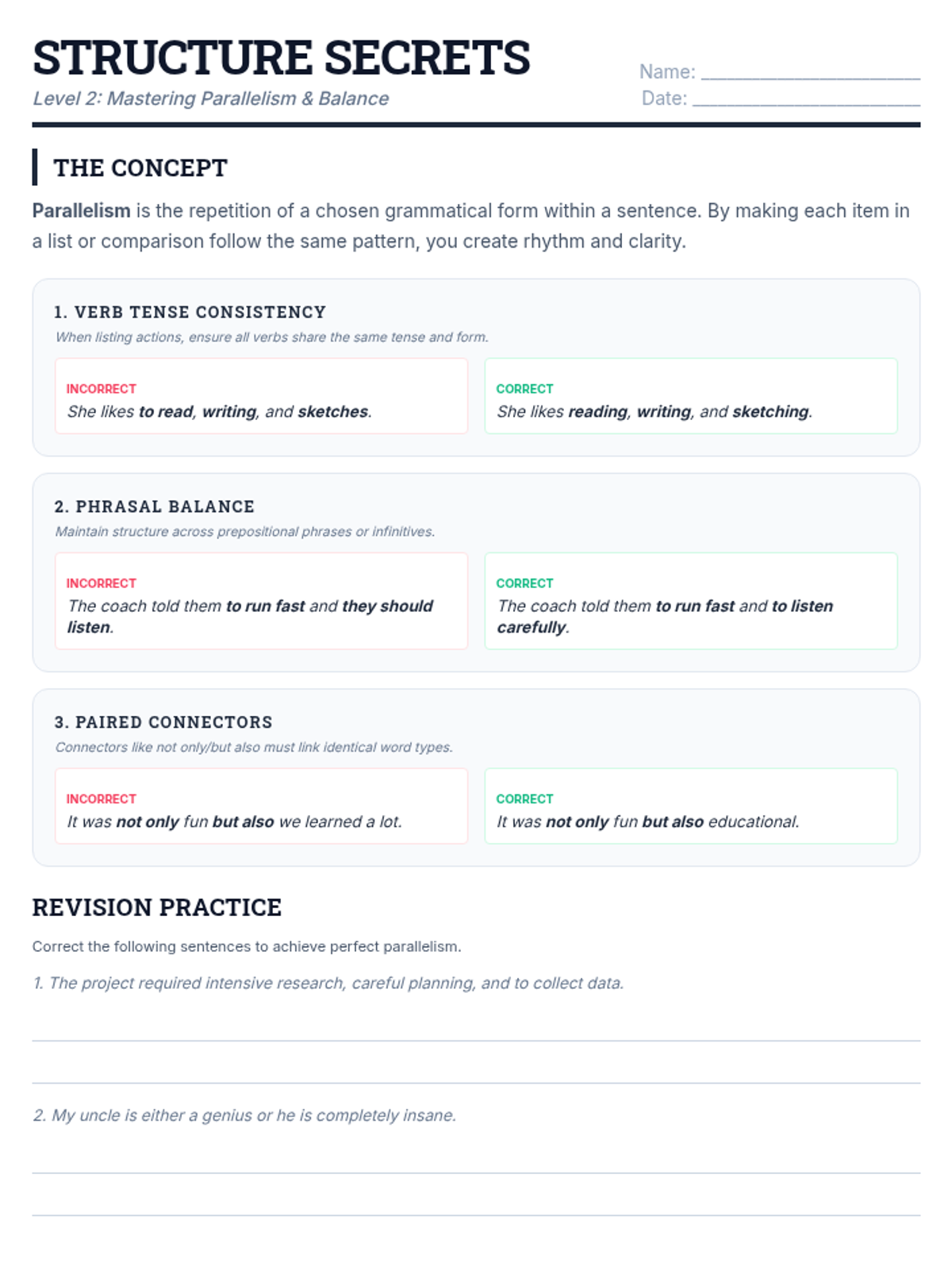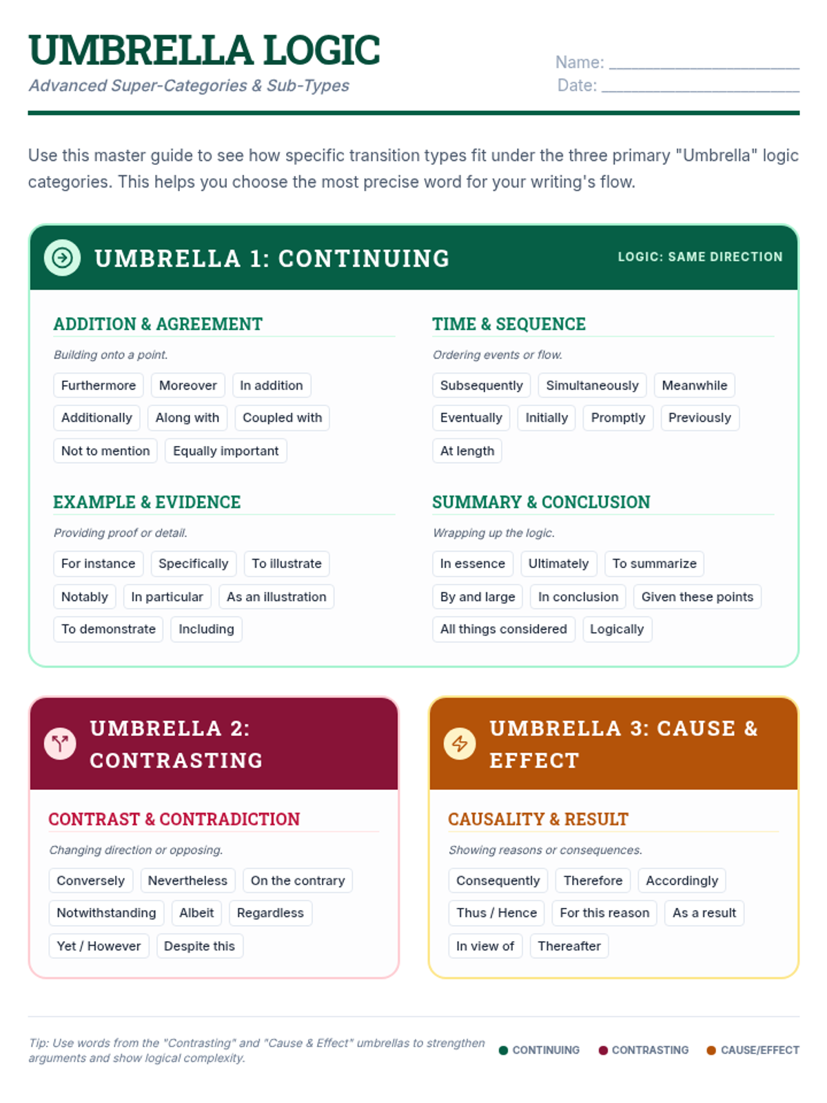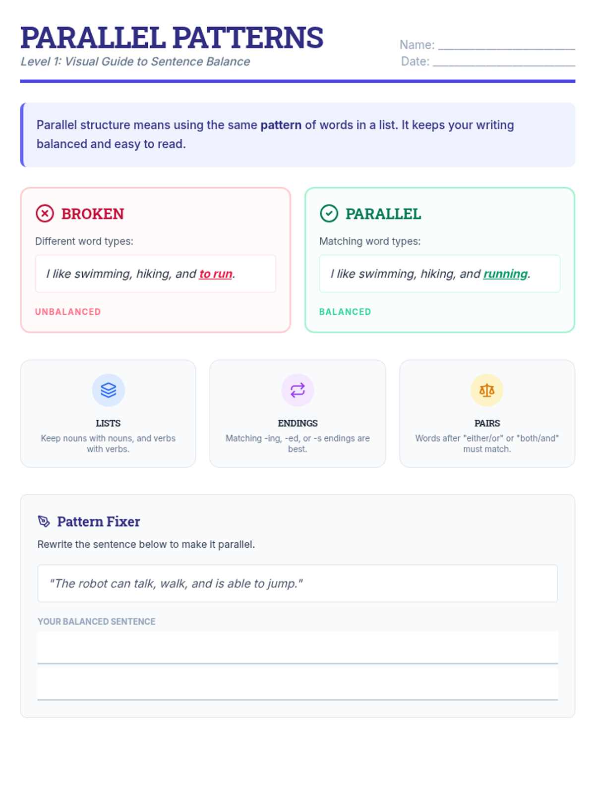 A lesson focused on helping 9th-grade students master writing flow and logic through transition words and parallel structure. This lesson provides differentiated reference sheets for both topics.