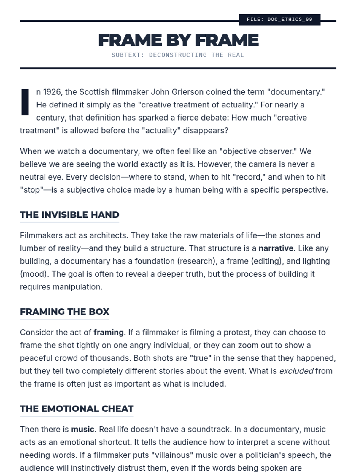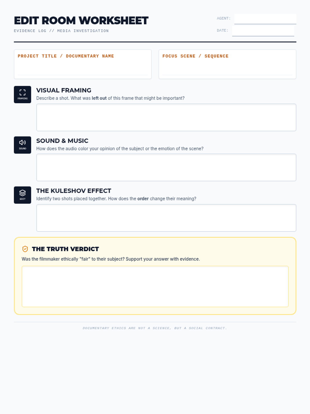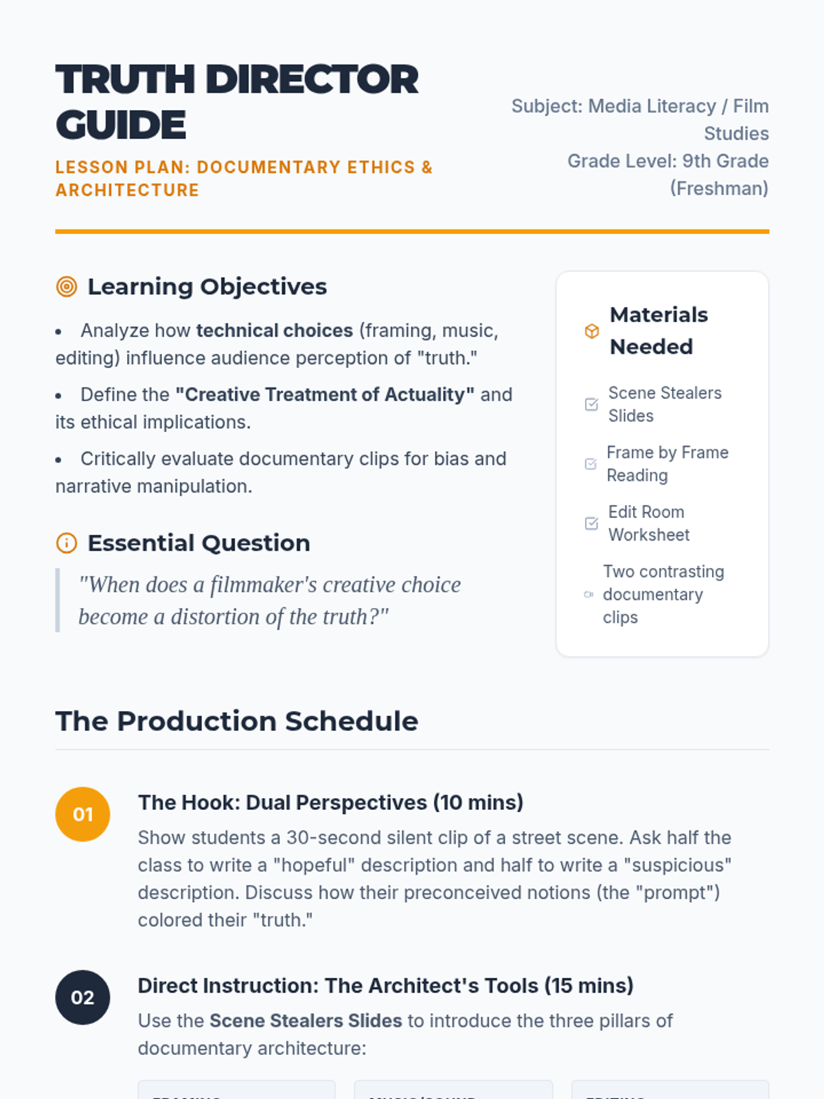 Students investigate the technical choices filmmakers make—including editing, music, and framing—to shape narrative truth. This lesson prepares freshmen to critically analyze documentary media and understand the ethical responsibilities of visual storytelling.