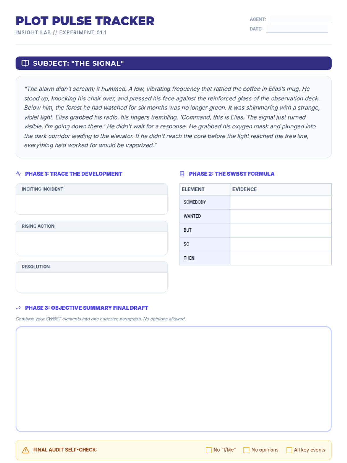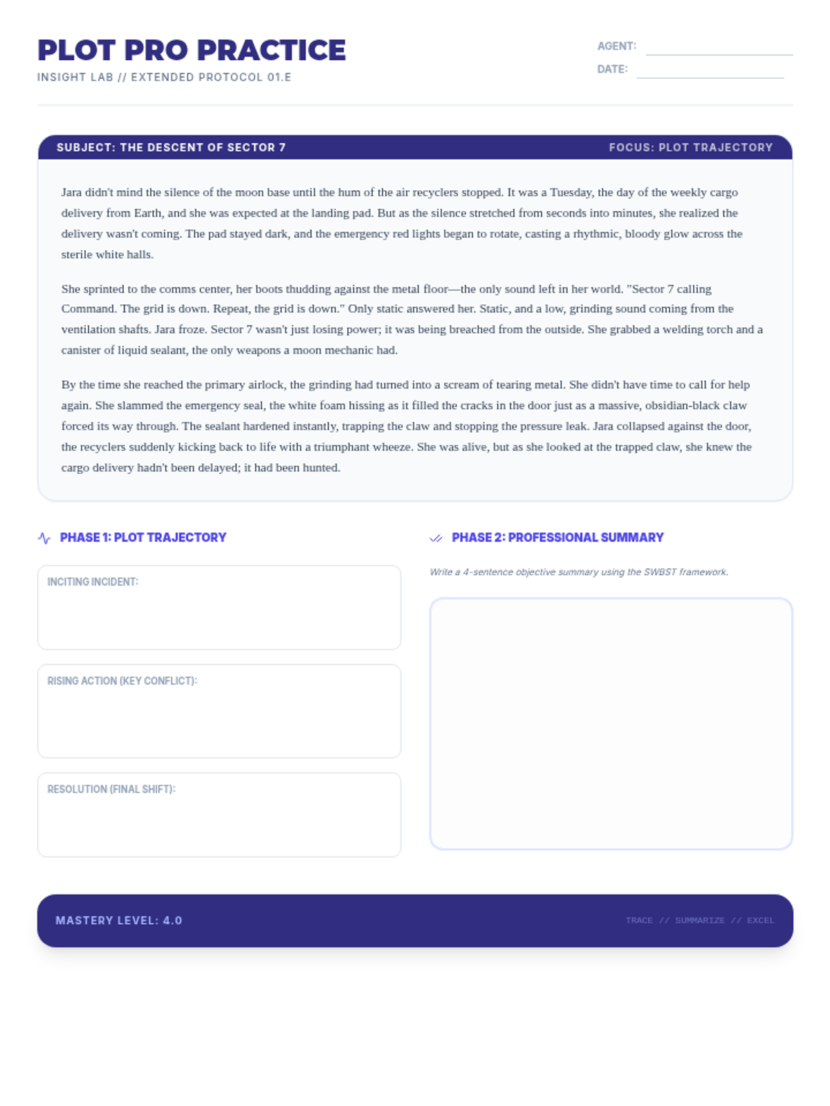 Focused on tracing plot development and providing objective summaries, aligning with Grade 8 Key Ideas and Details standards.