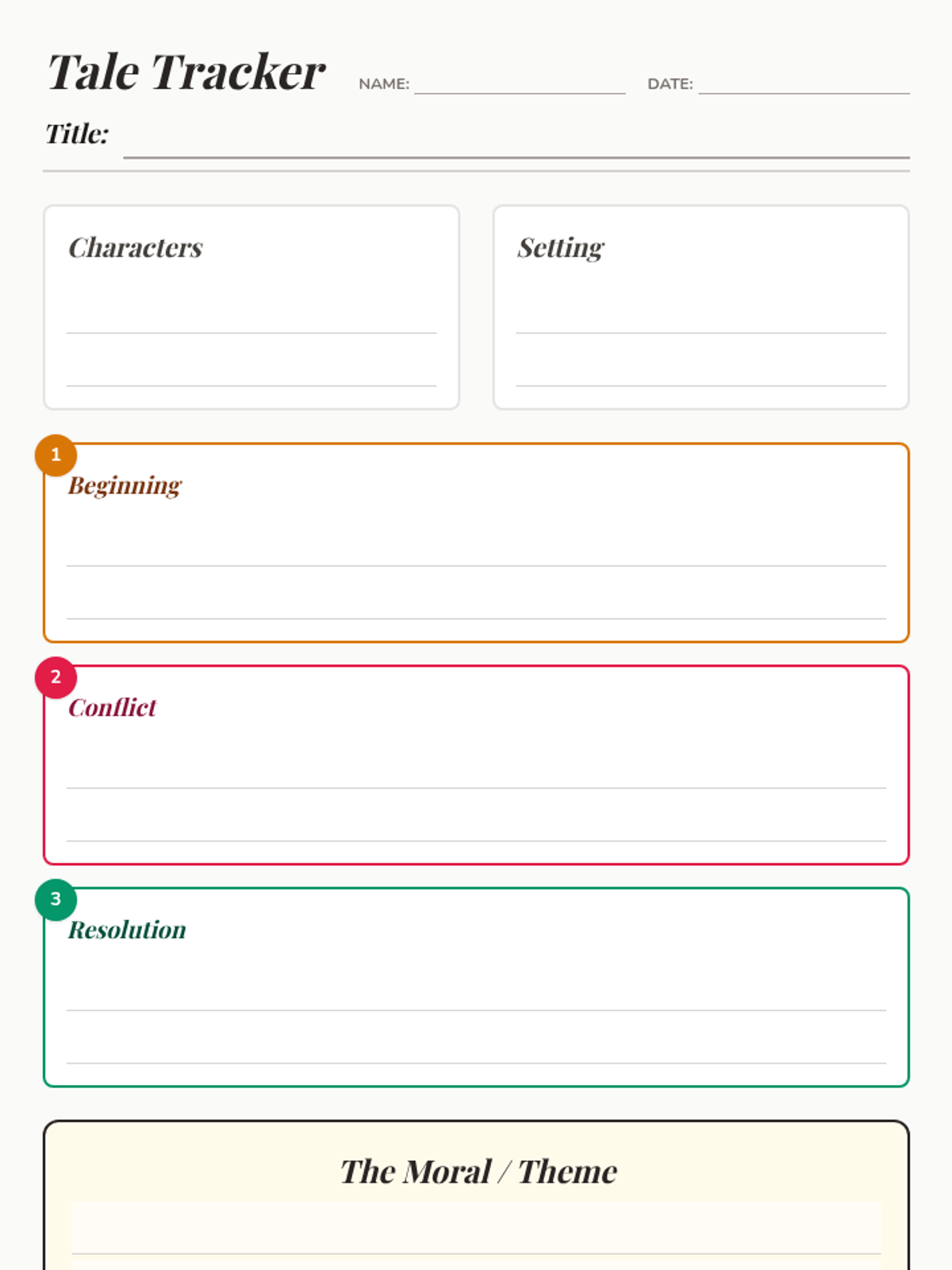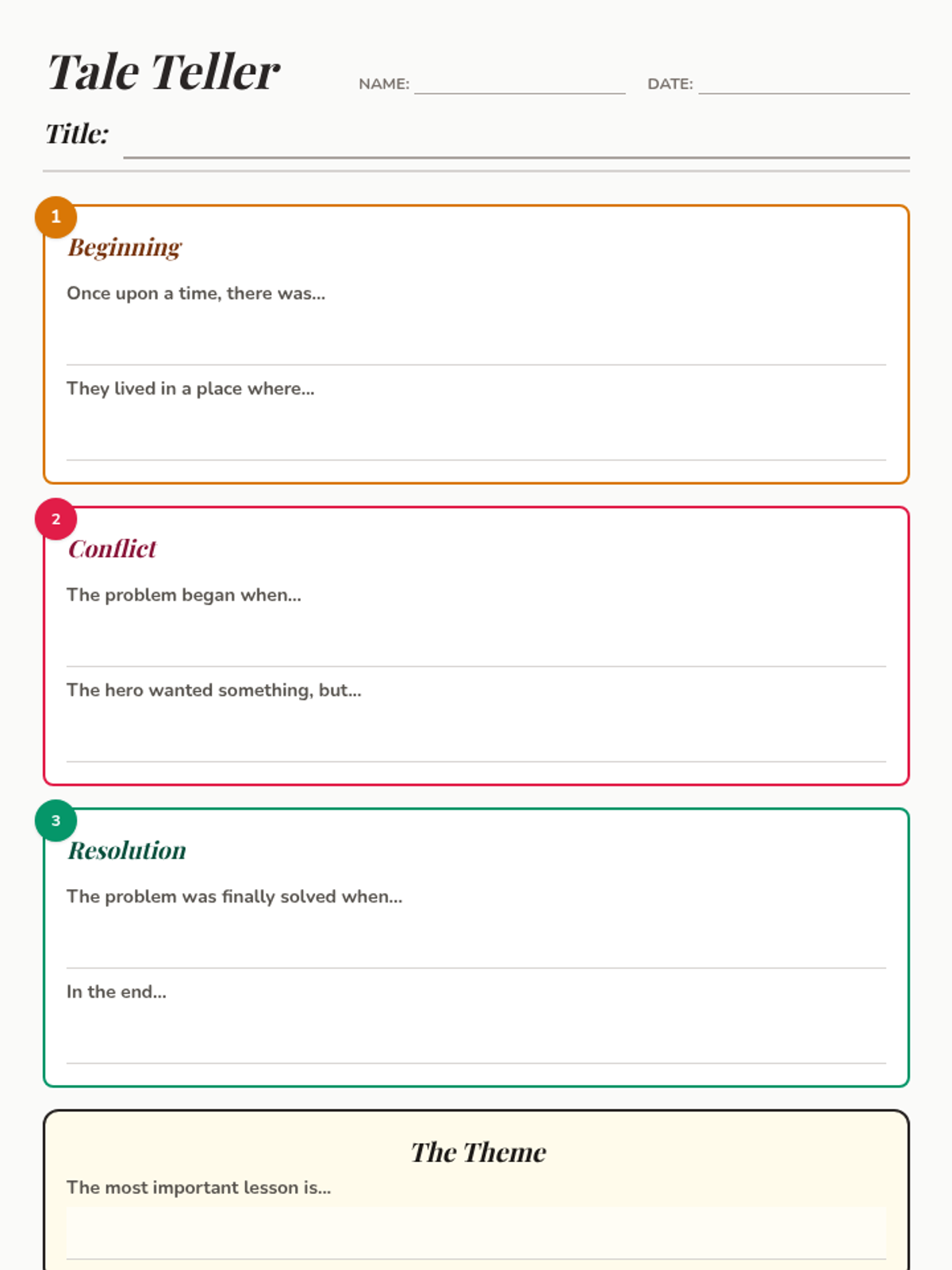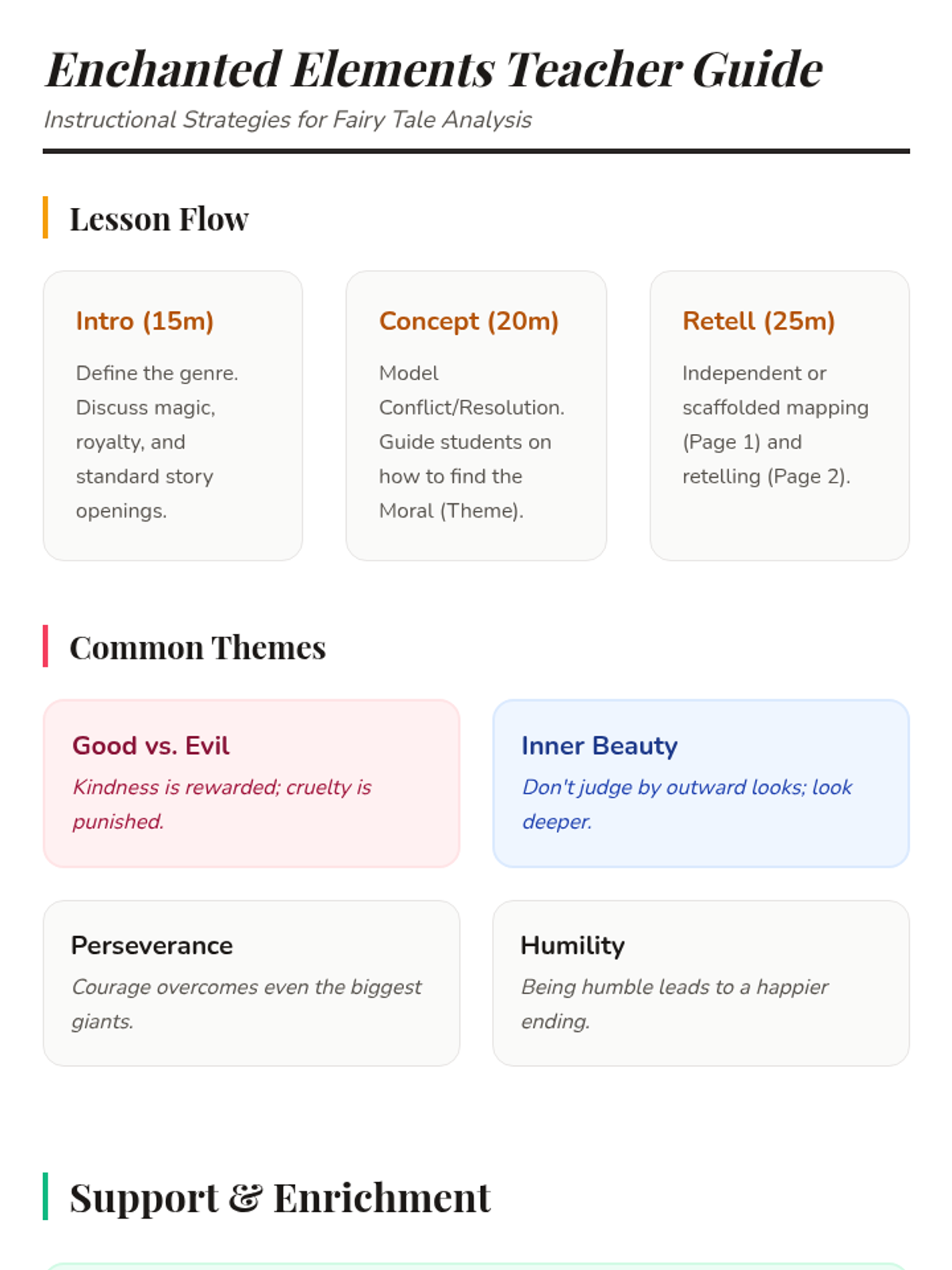 A lesson designed to help students analyze and sequence fairy tales, focusing on identifying the conflict, resolution, and underlying theme through structured graphic organizers.