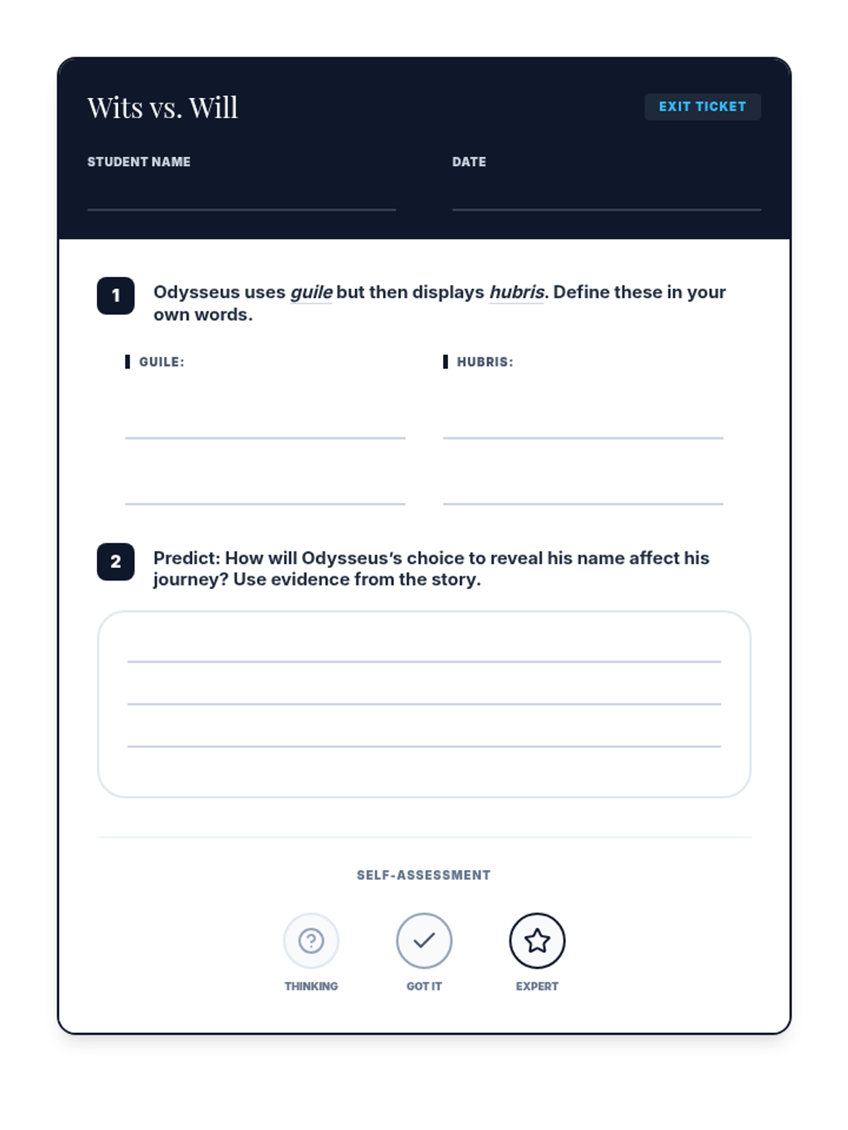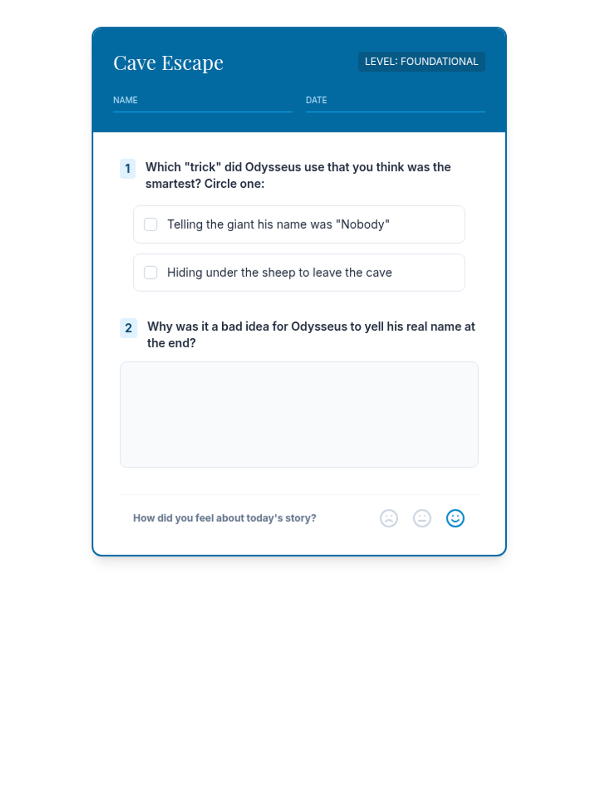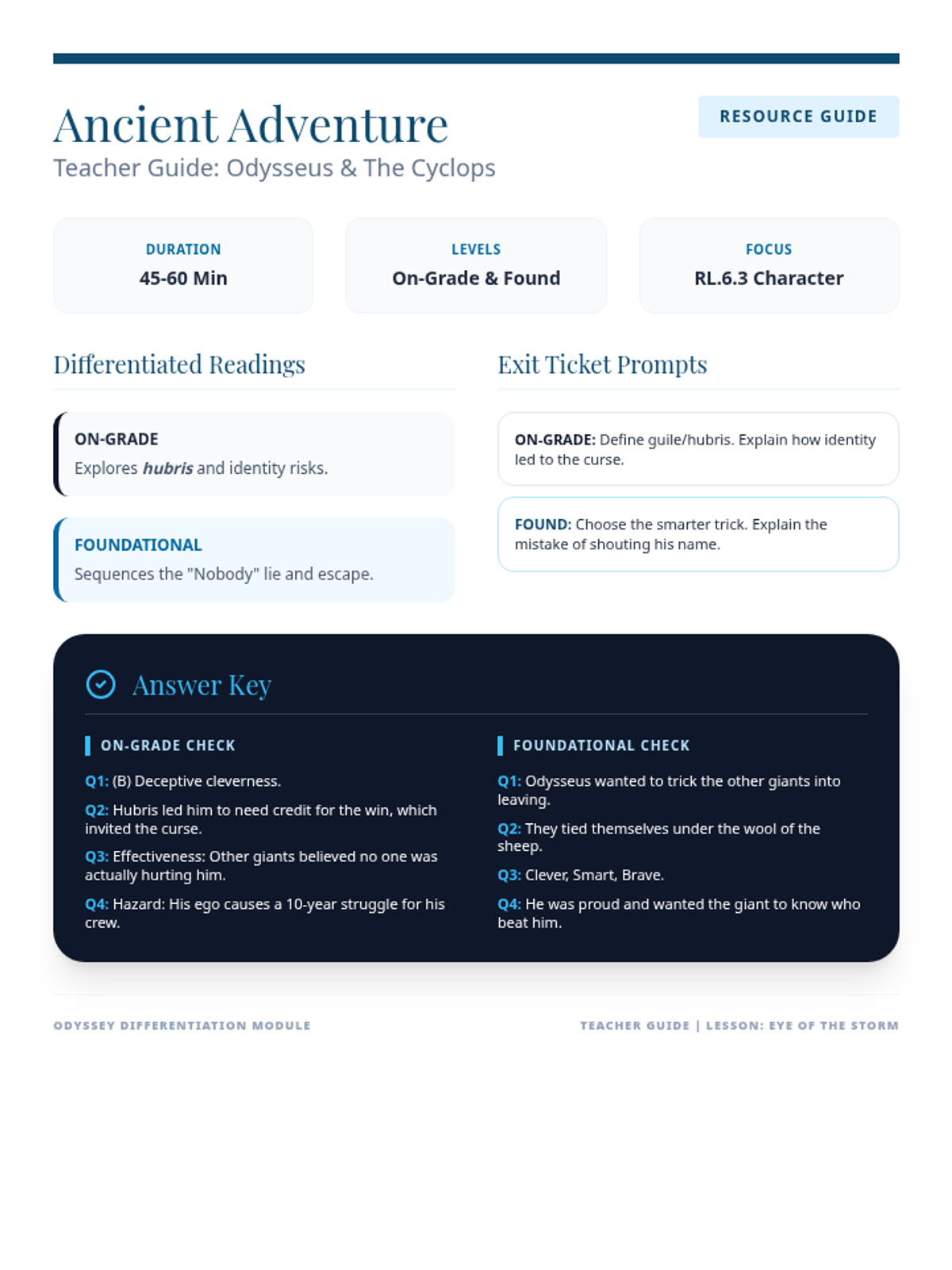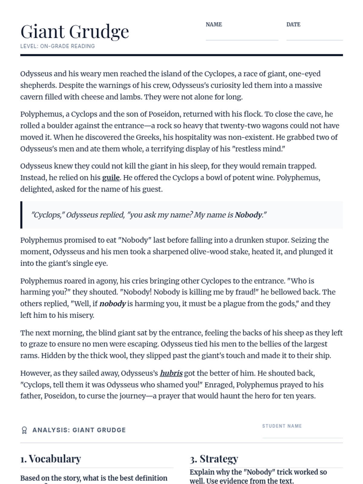 A lesson exploring the encounter between Odysseus and Polyphemus, focusing on character traits and cleverness through differentiated readings and assessments.
