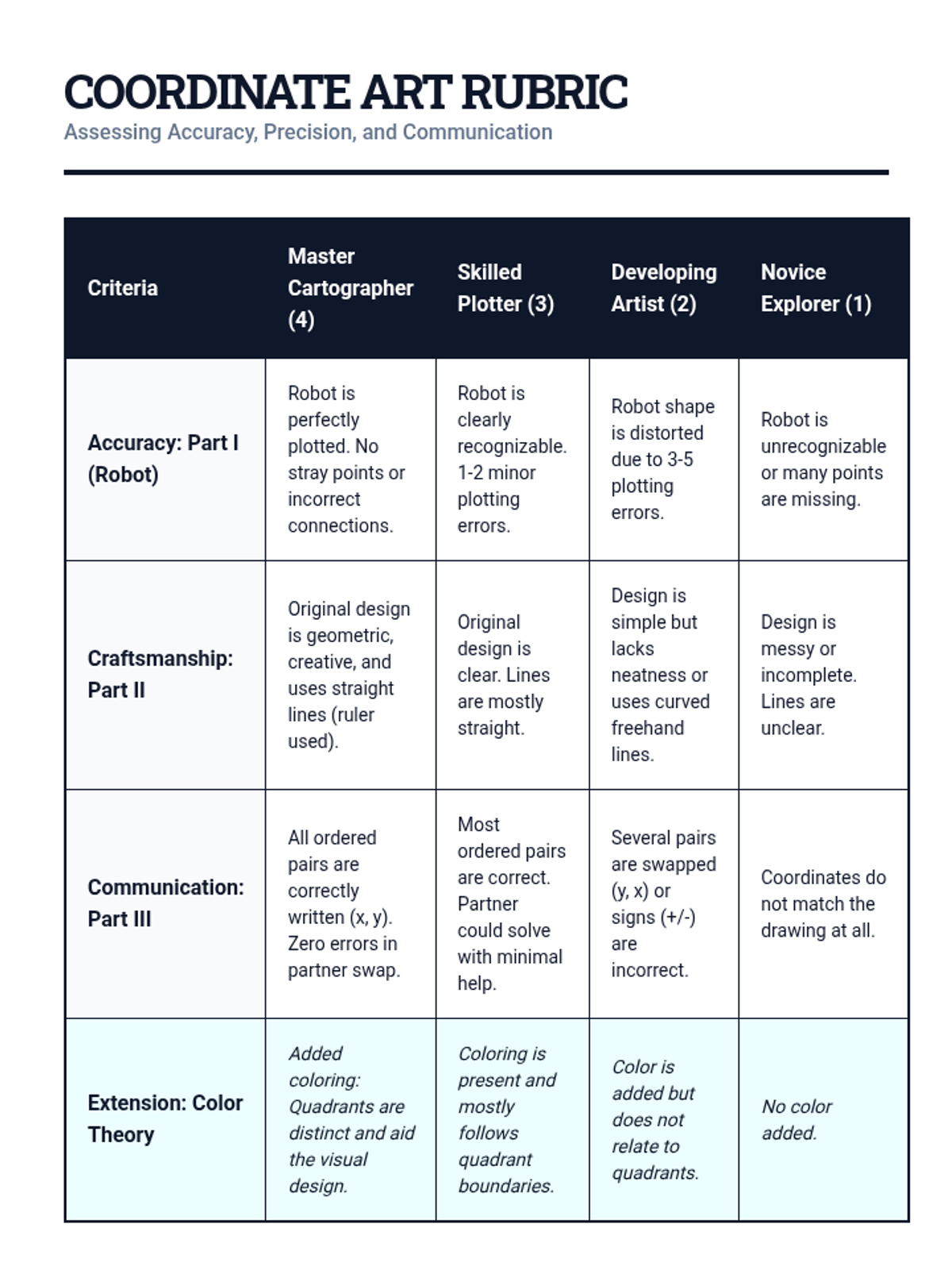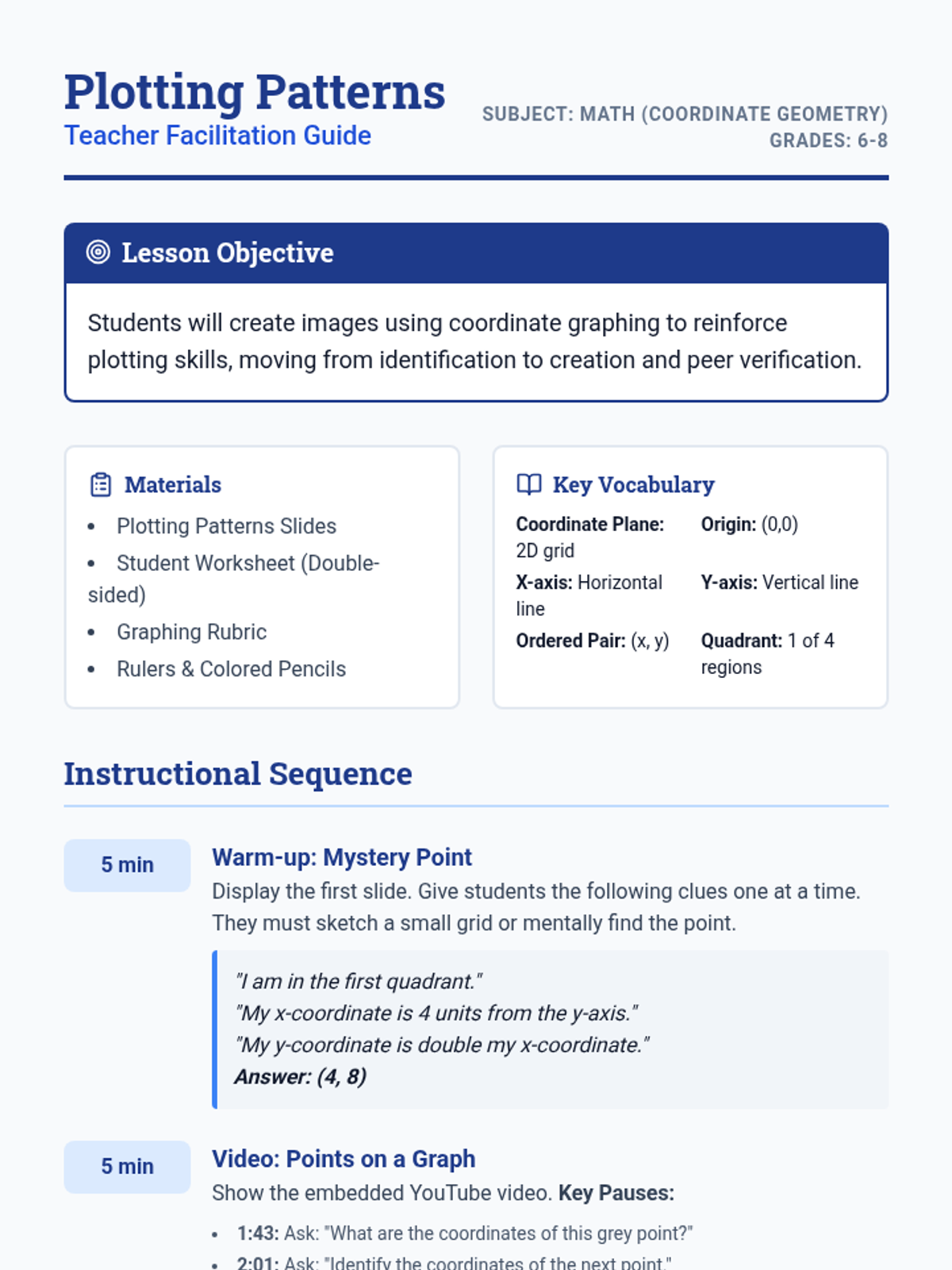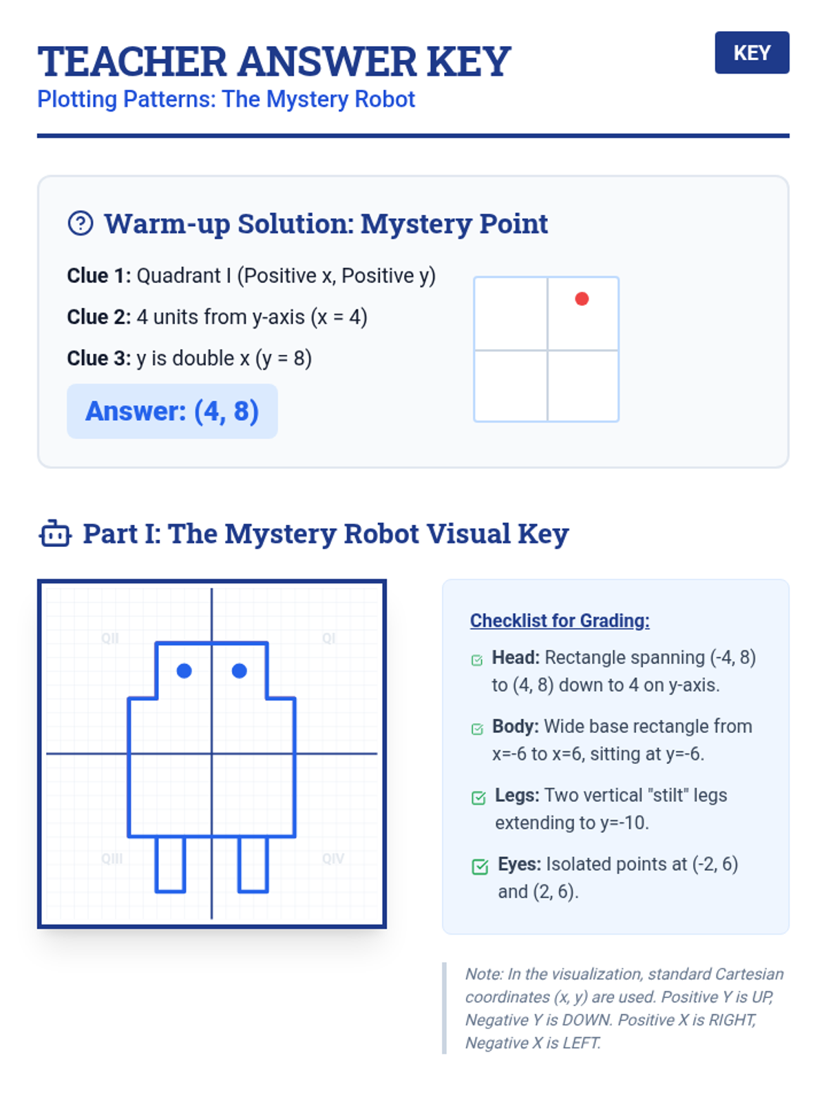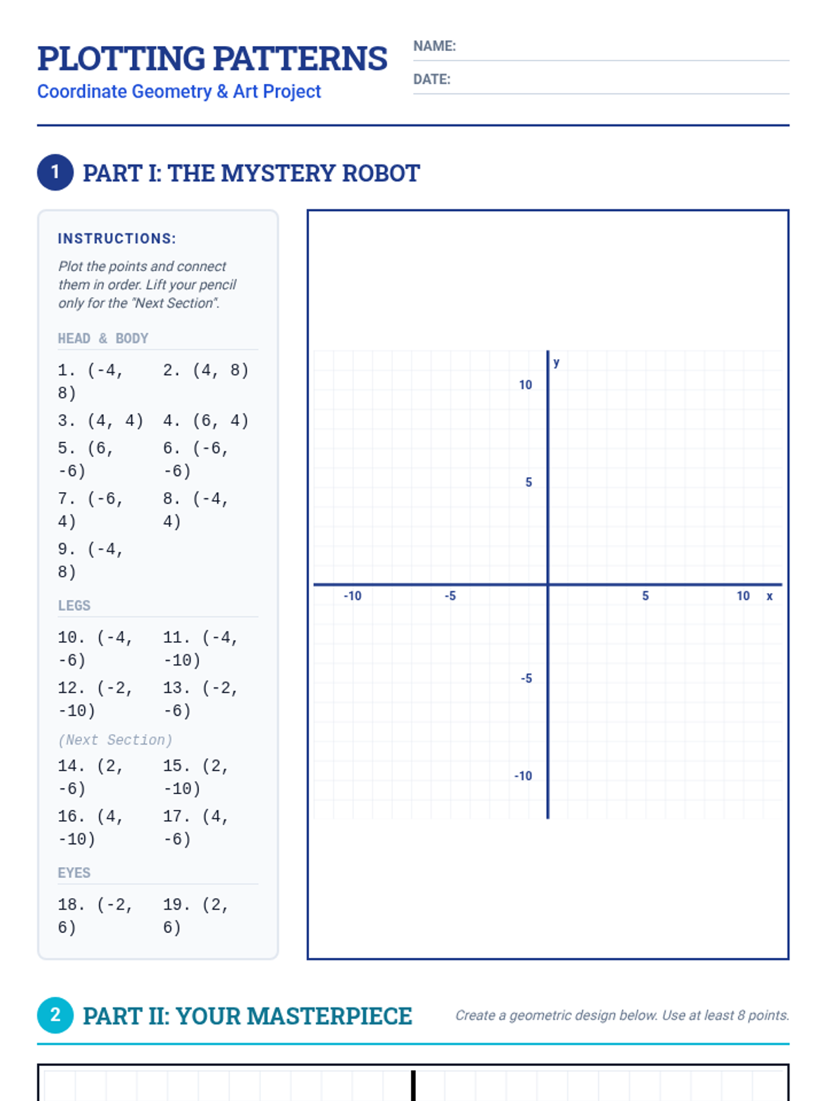 A middle school math lesson where students master coordinate graphing by plotting points to reveal a mystery robot and creating their own geometric art. Includes a video refresh on plotting basics and a partner challenge.