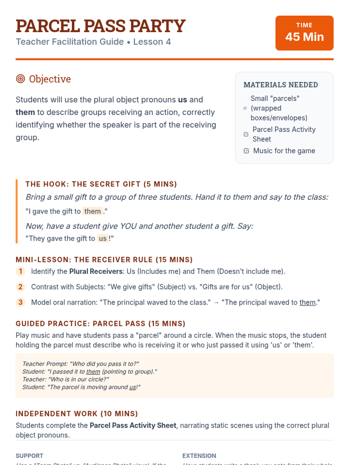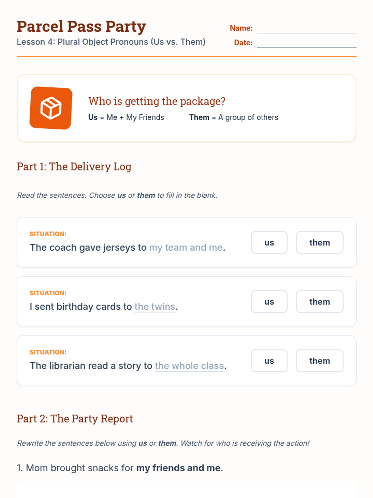 Students practice using 'us' and 'them' in the predicate of sentences. They engage in a role-playing game where they give and receive items, narrating the action using correct pronouns.