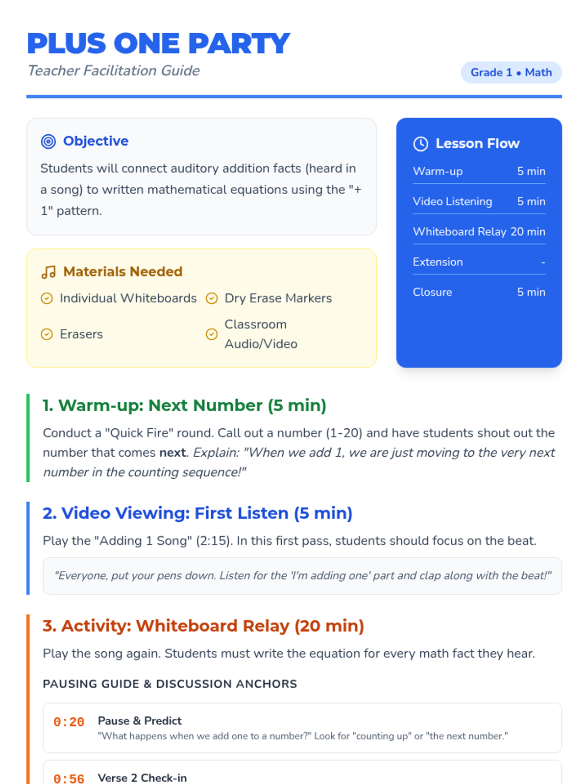 A high-energy math lesson where 1st graders listen to an upbeat song and translate auditory addition facts into written equations on whiteboards.