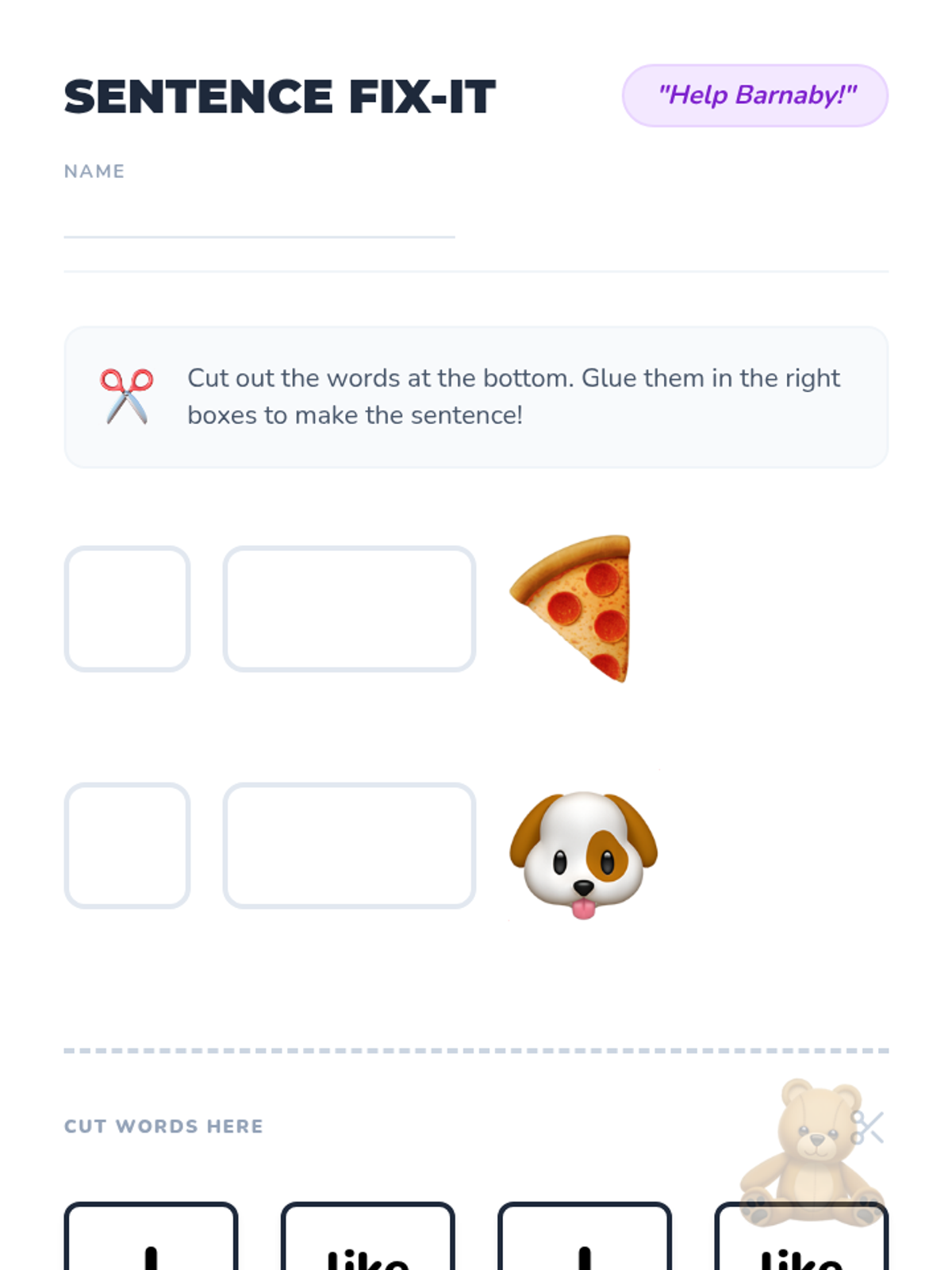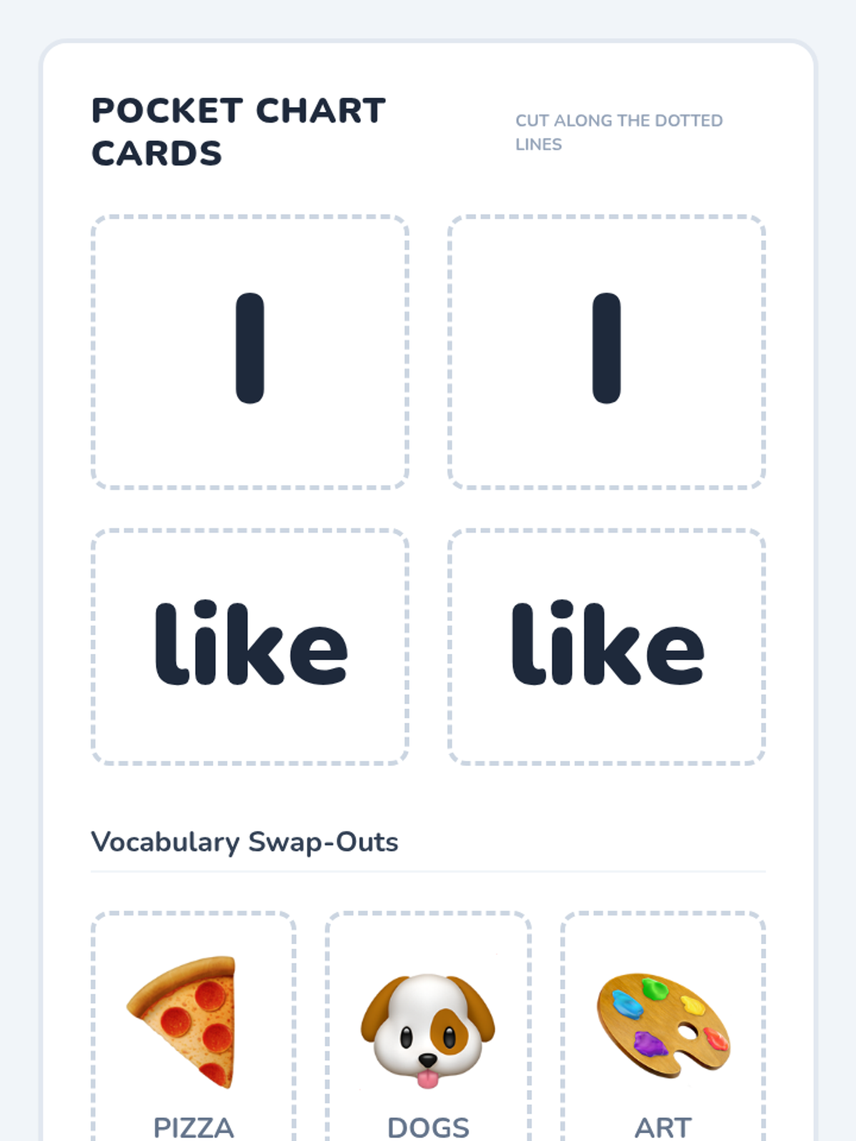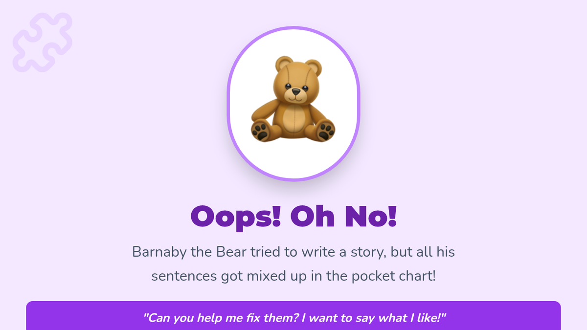 Students help a puppet fix mixed-up sentences using 'I' and 'like' in a pocket chart, reinforcing word stability.
