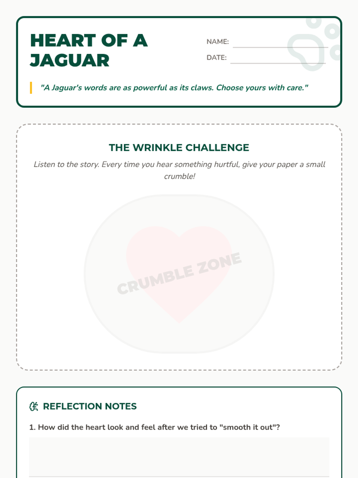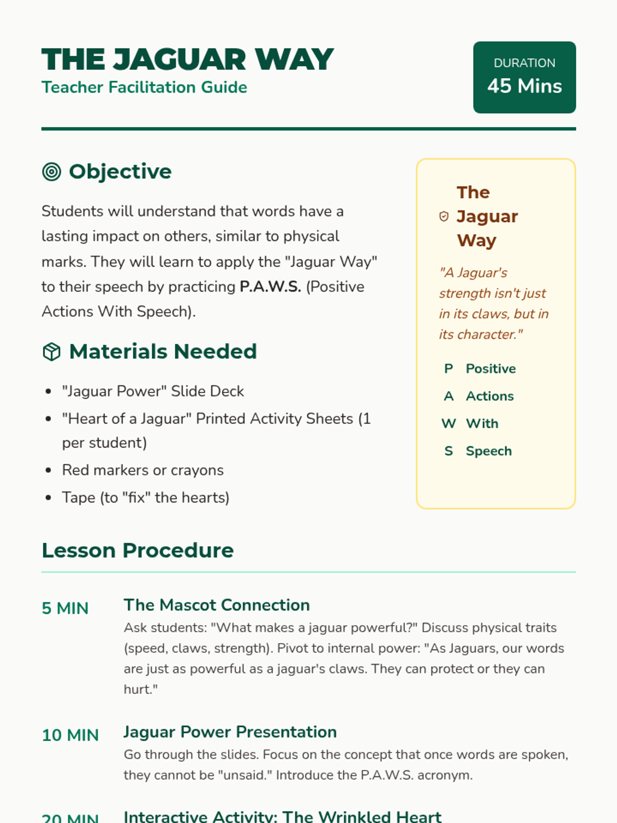A 45-minute social-emotional learning lesson for 4th graders focusing on the impact of hurtful words and the power of kind speech, using the school's jaguar mascot as a guide for character.