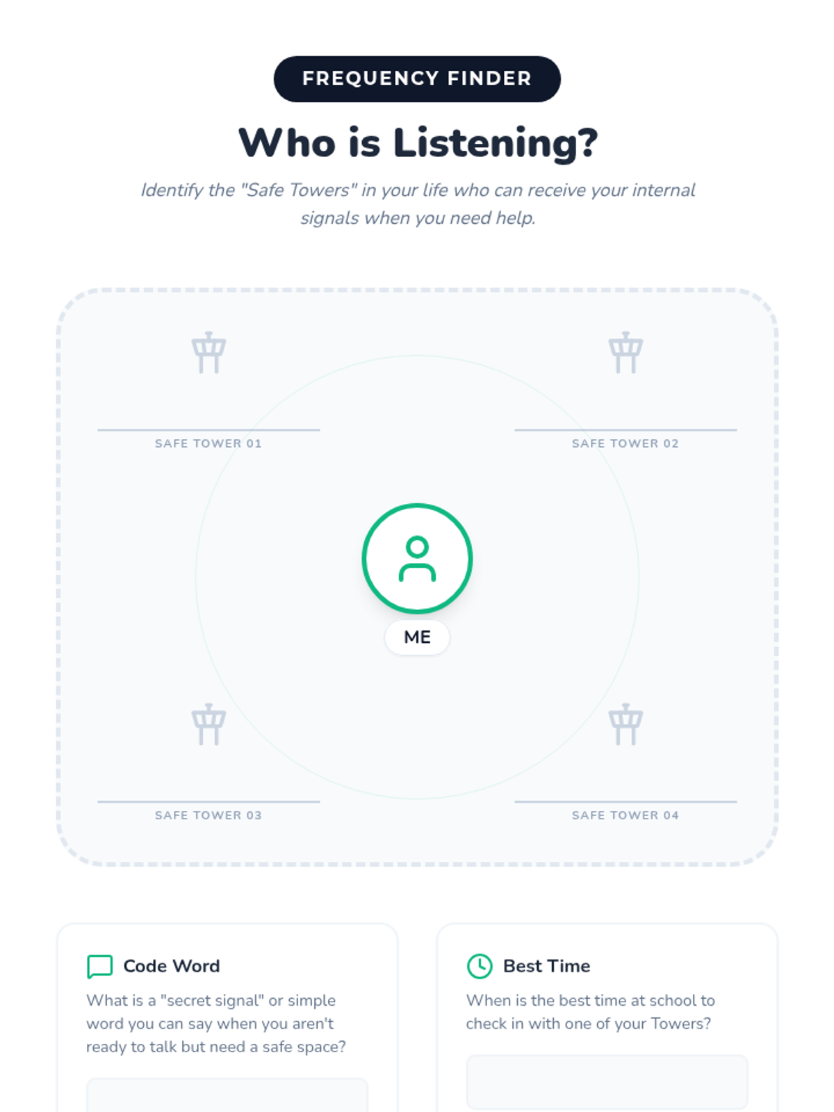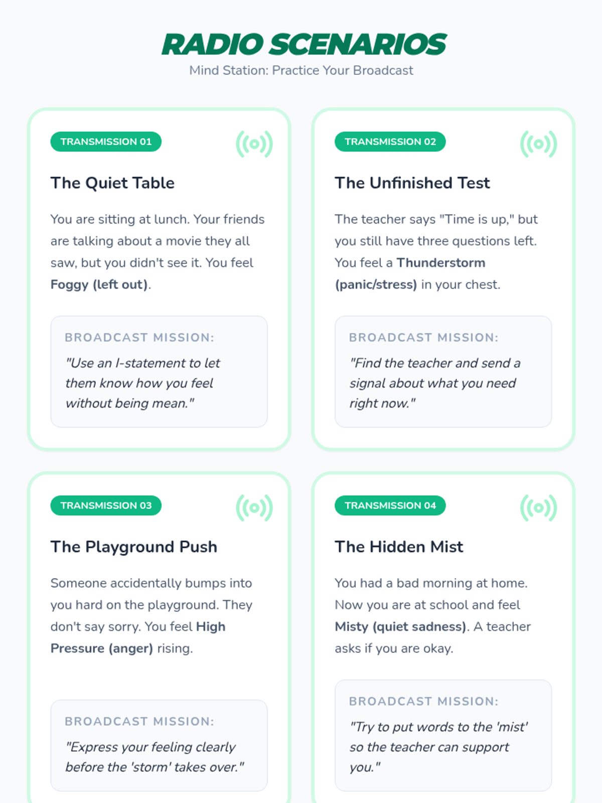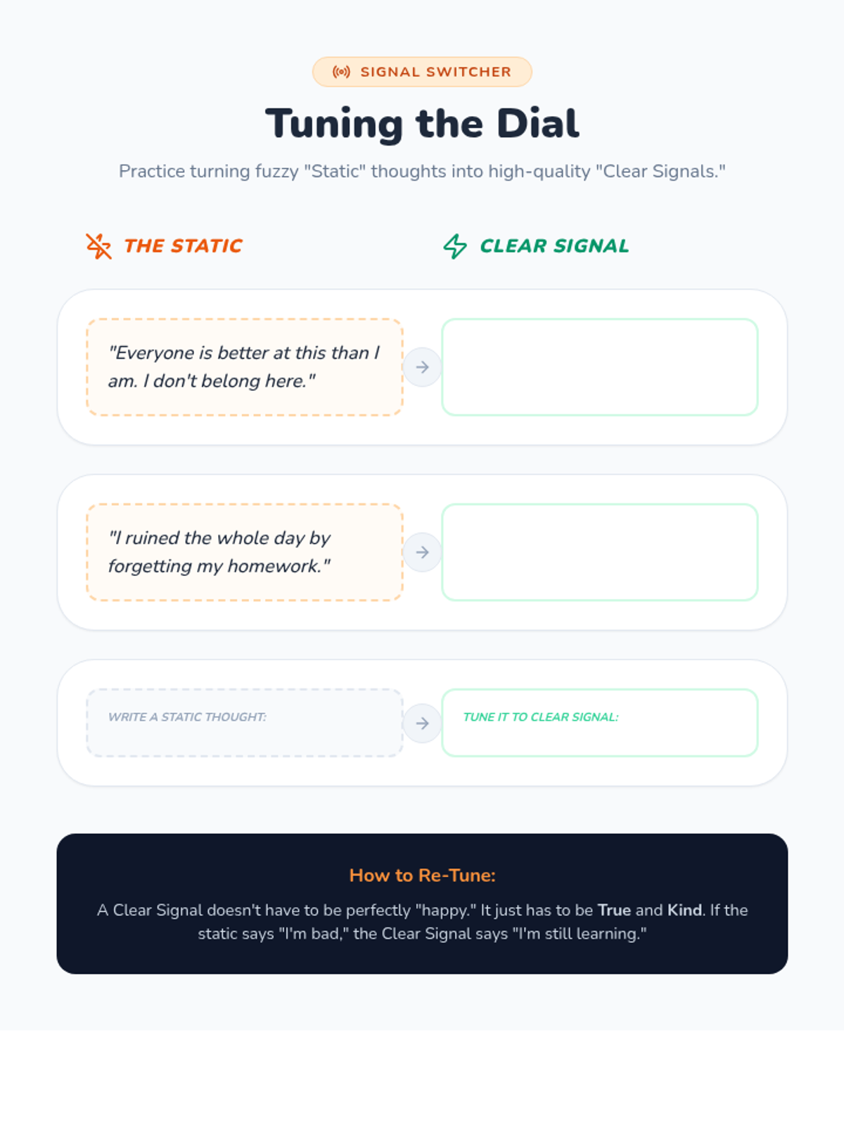 Application of positive self-talk strategies in challenging situations. Students practice 're-tuning' their internal radio to build resilience and confidence.