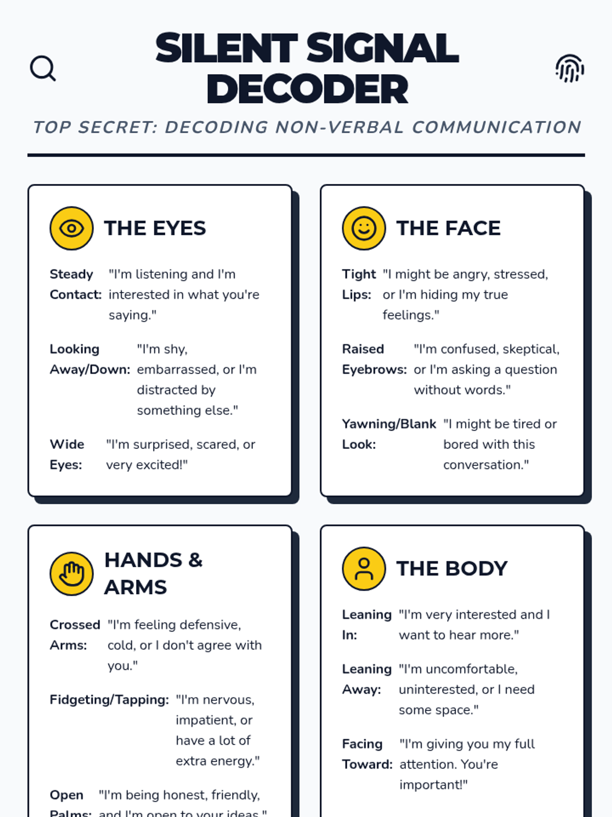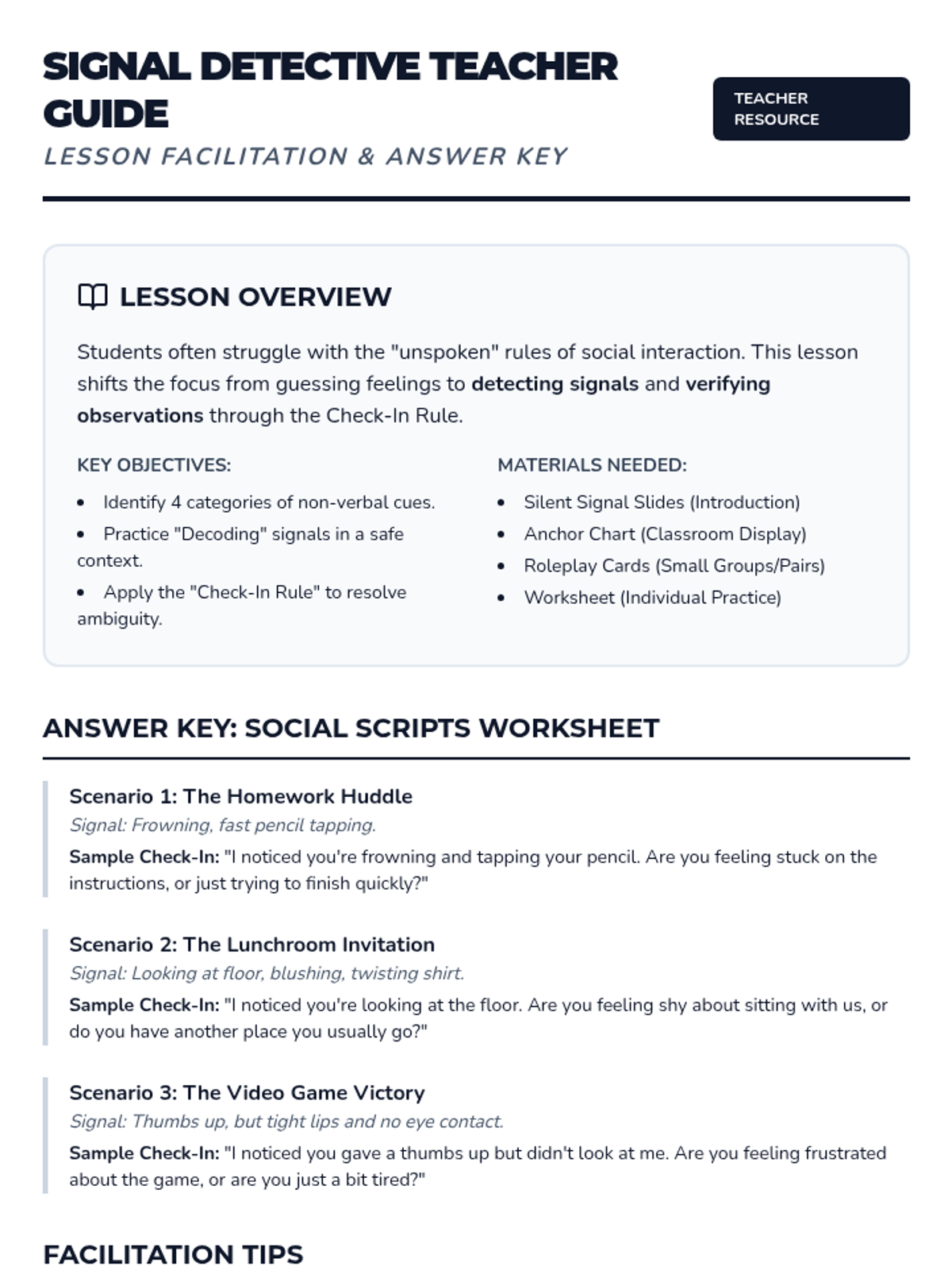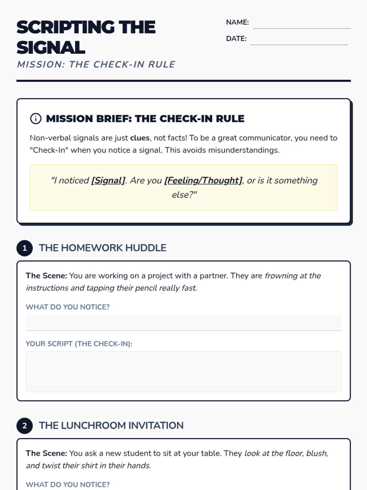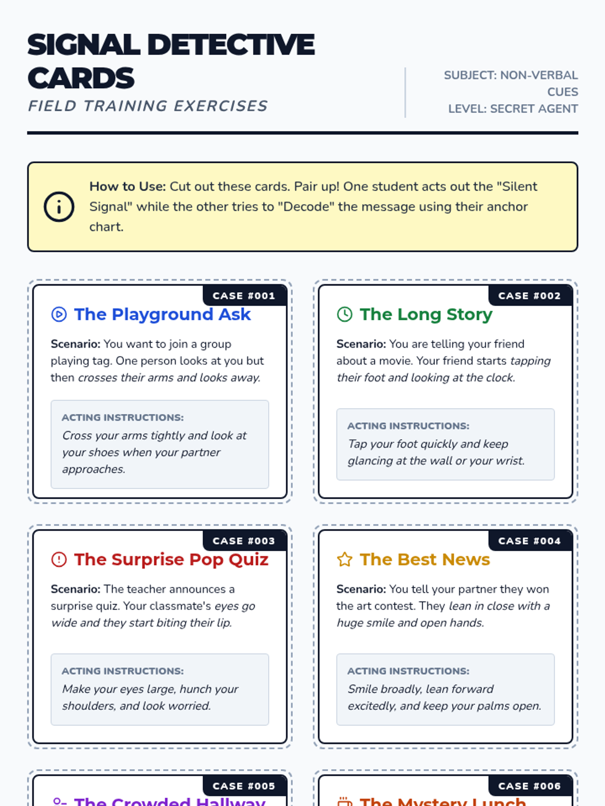 This lesson teaches students to identify and interpret non-verbal social cues—such as body language, facial expressions, and tone of voice—to improve their social interactions and empathy. Students will practice decoding these 'silent signals' through role-play and guided scripts.