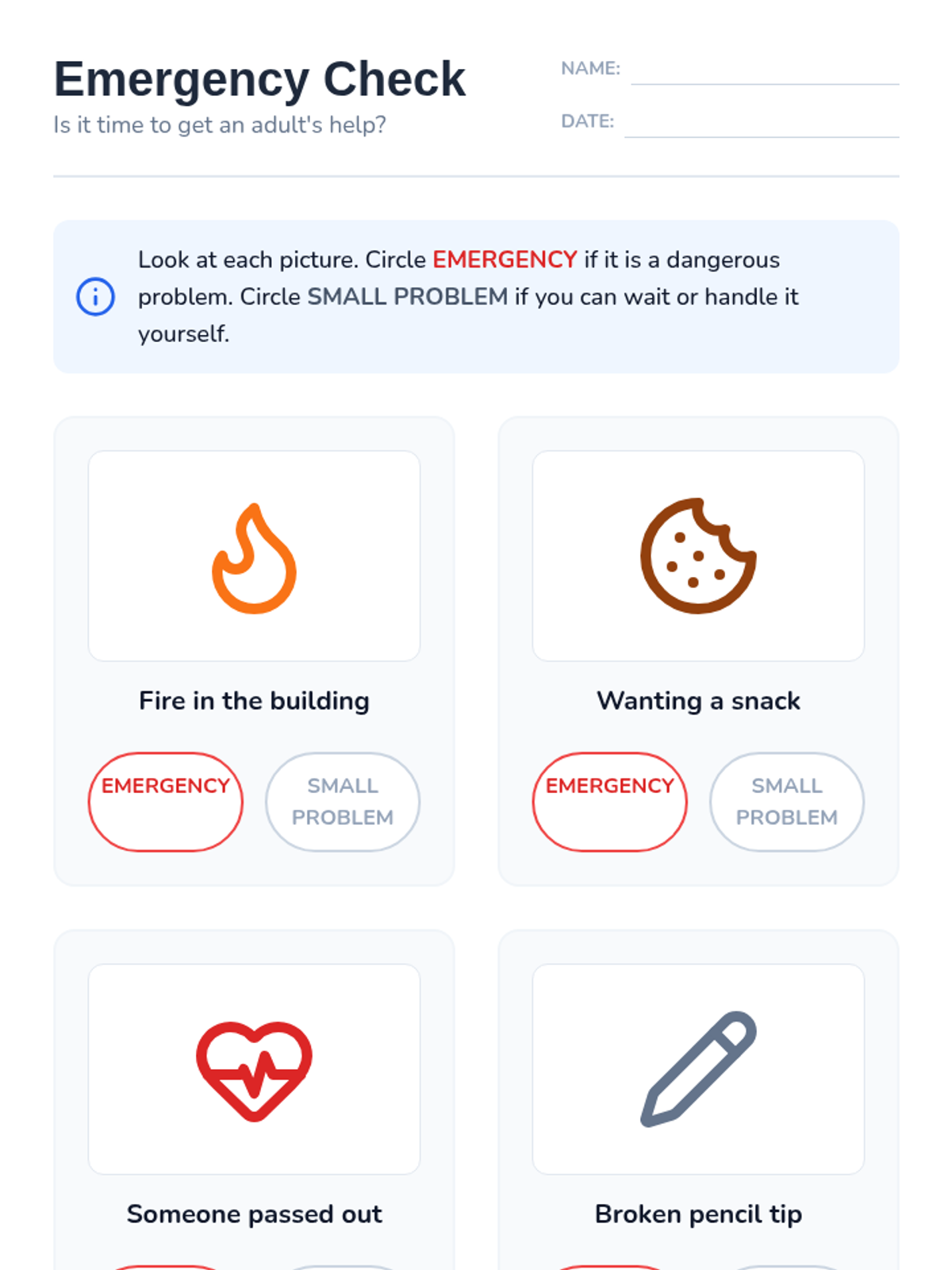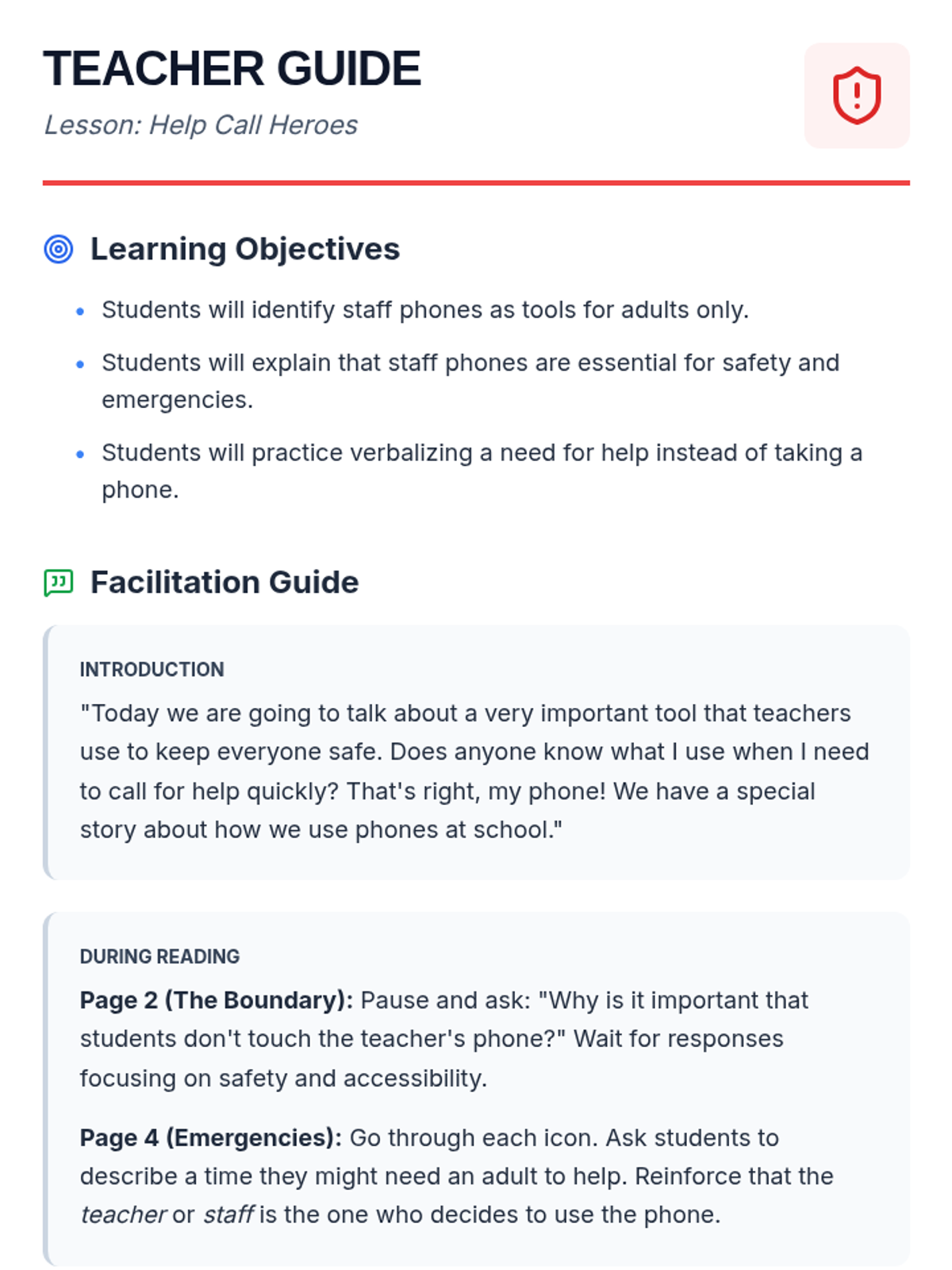 A lesson focused on teaching students the appropriate boundaries for using staff phones and understanding the correct procedures for emergency calls. Students learn why staff phones are off-limits and how to seek help effectively during emergencies.