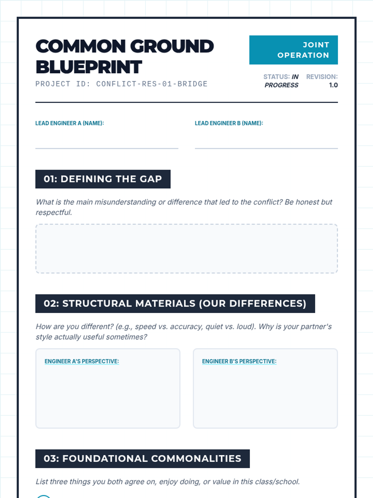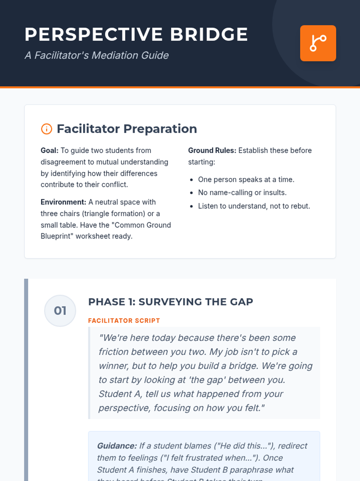 A targeted mediation session designed to help two students navigate interpersonal conflict by exploring their differences, finding commonalities, and building mutual respect through guided dialogue.