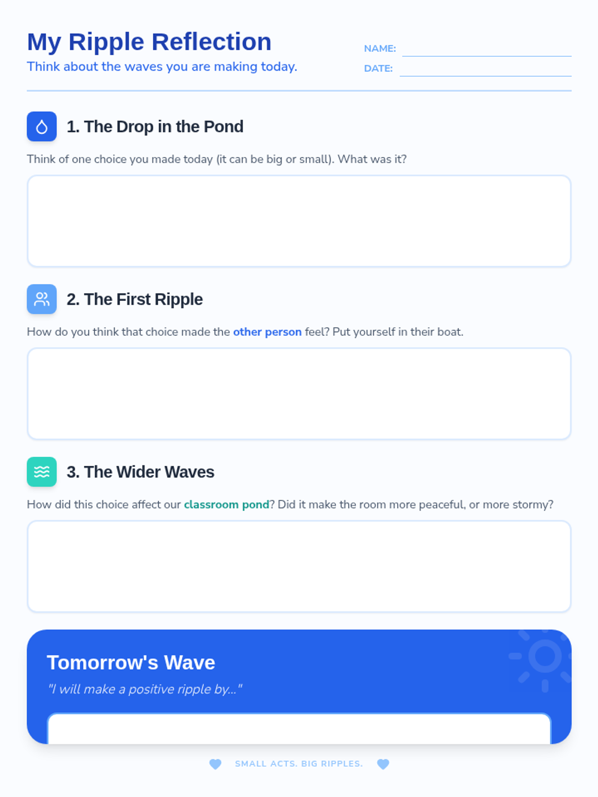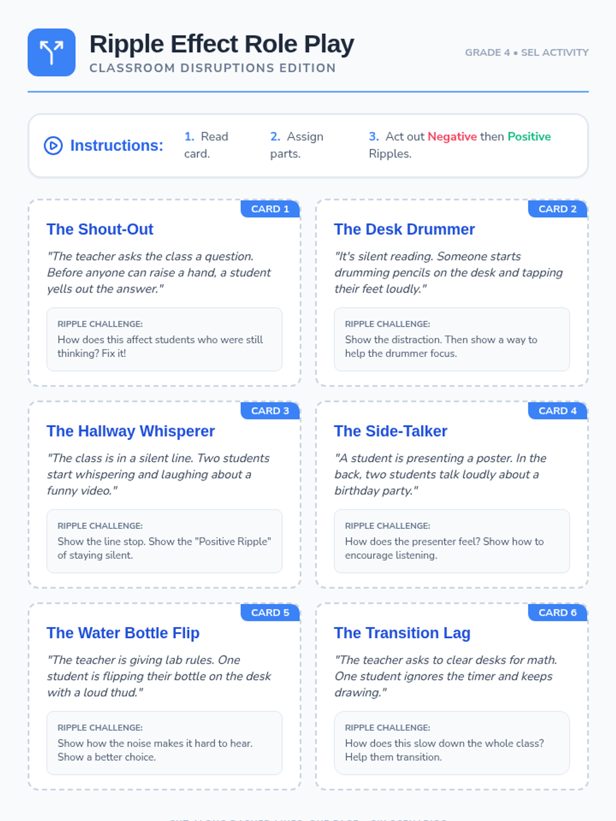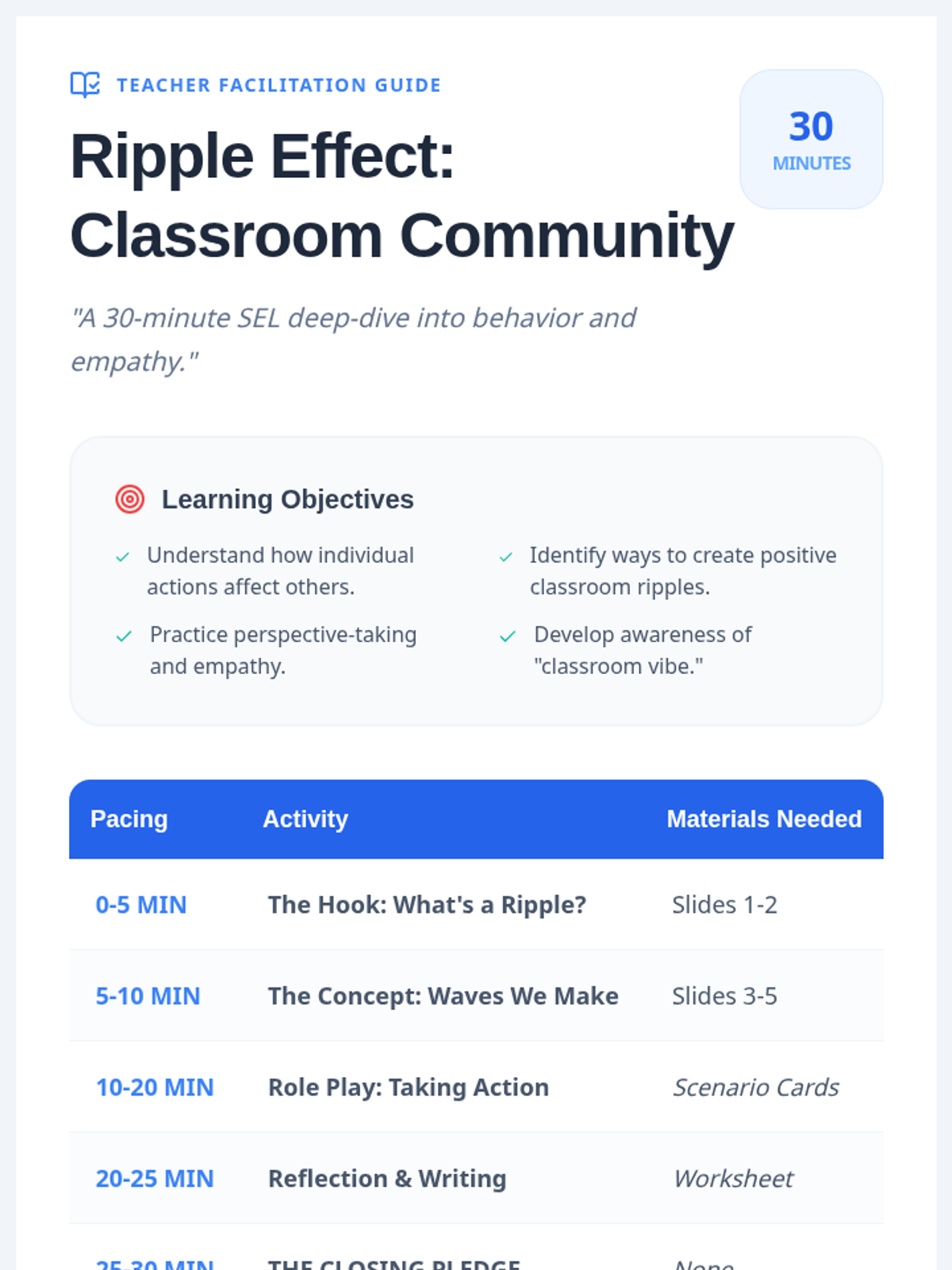 A 30-minute social-emotional learning lesson for 4th graders focused on the 'ripple effect' of words and actions, emphasizing empathy and classroom community.