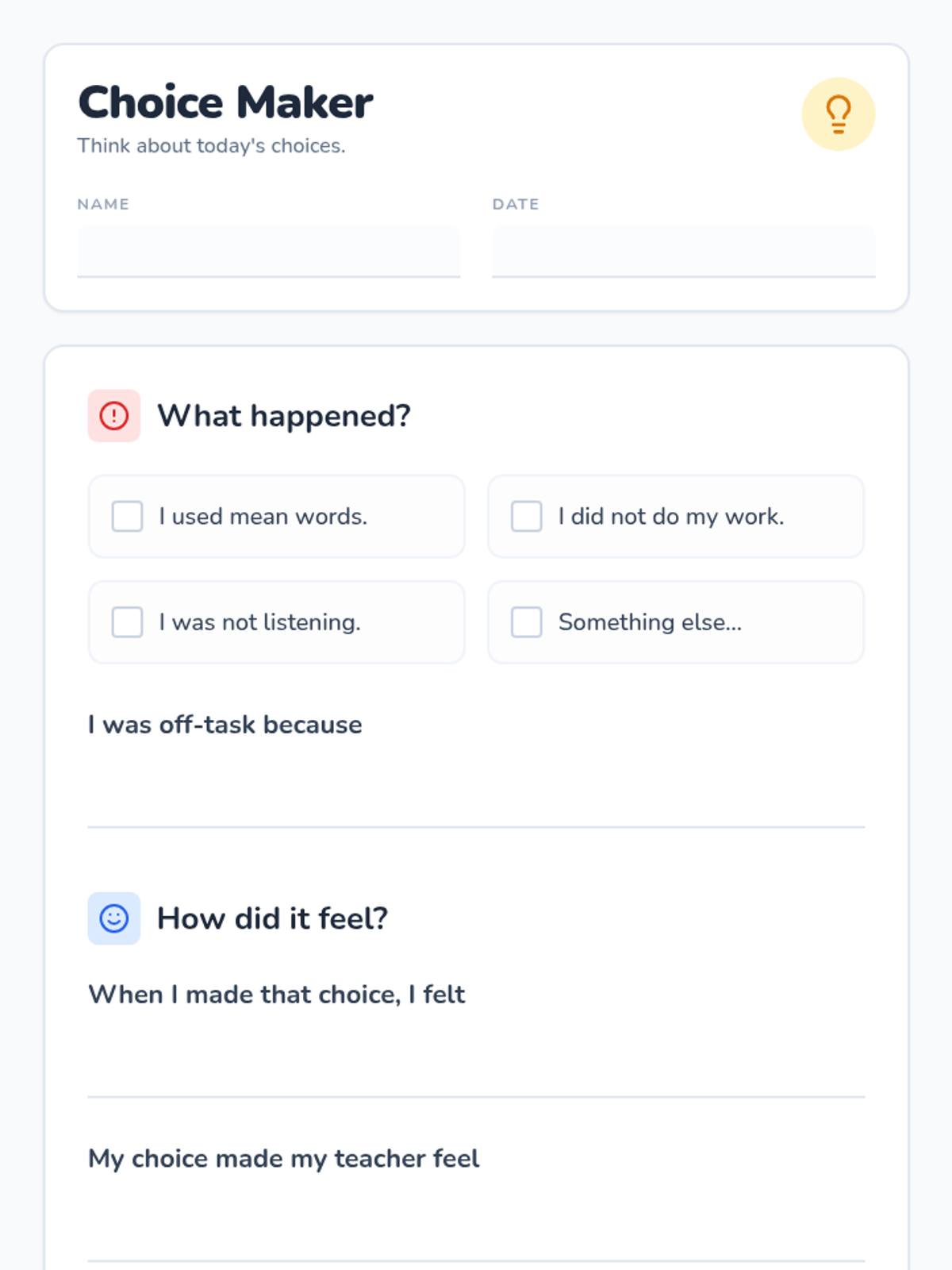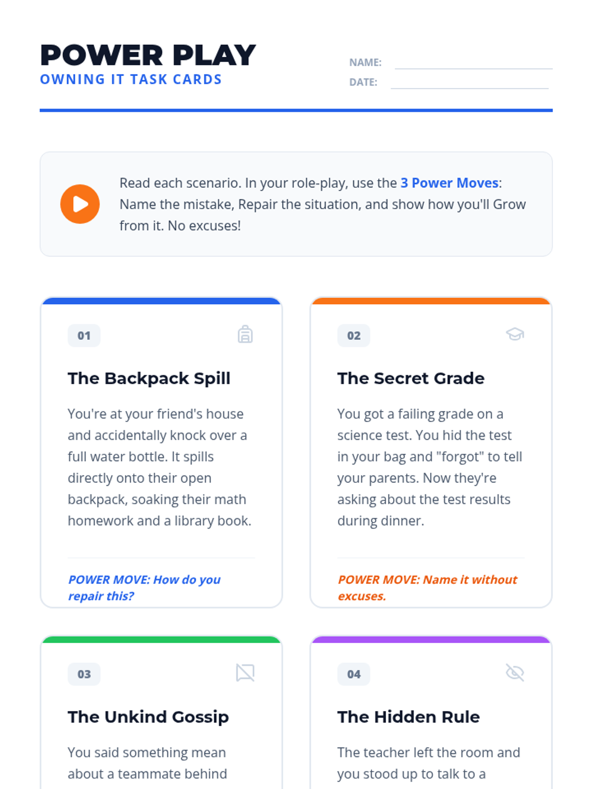 A 20-minute targeted intervention focused on taking responsibility through role-play. Students use 'I' statements and feeling identification to practice 'owning up' to their specific part in a shared incident.