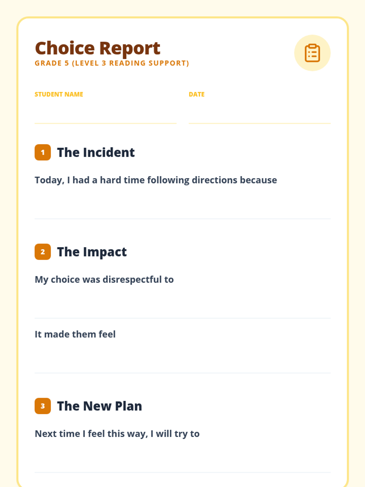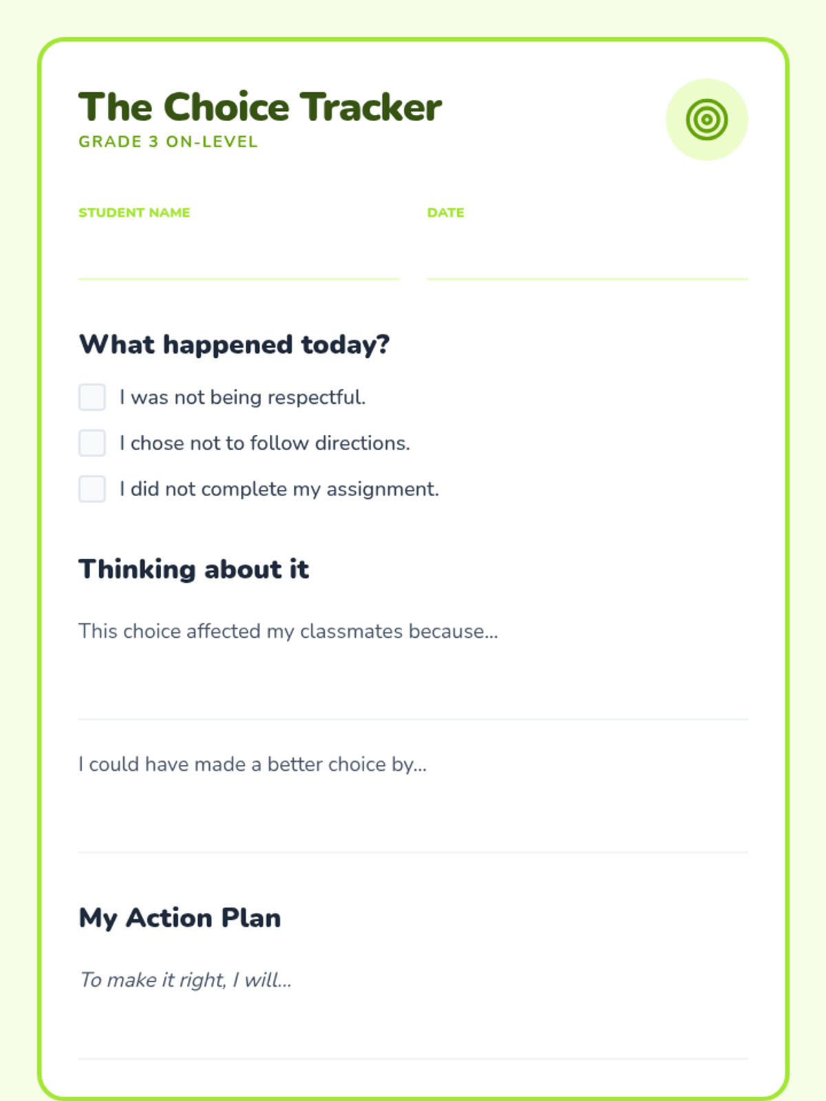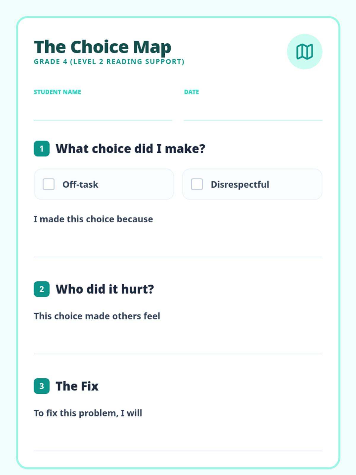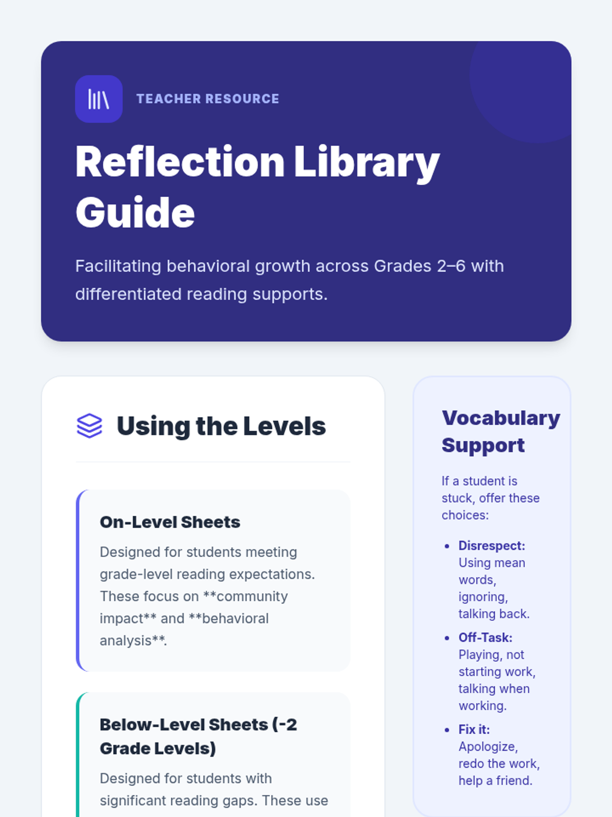 A comprehensive library of behavior reflection sheets for grades 2-6, differentiated with on-grade level and below-grade level reading supports. Each sheet focuses on disrespectful behavior and off-task choices using a restorative approach.