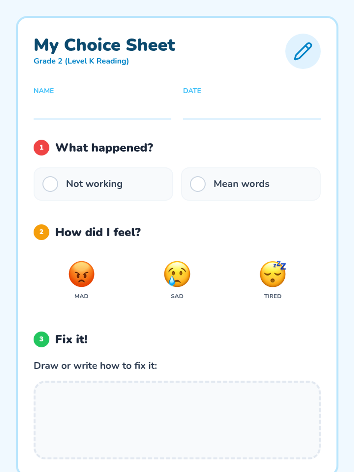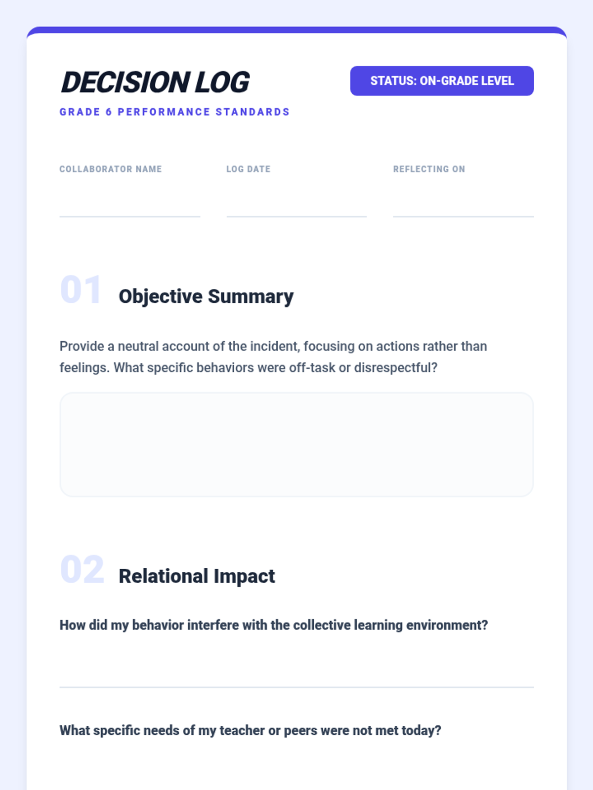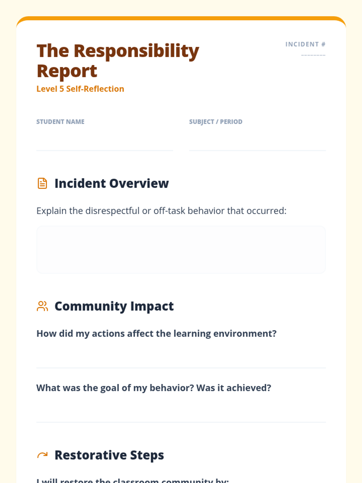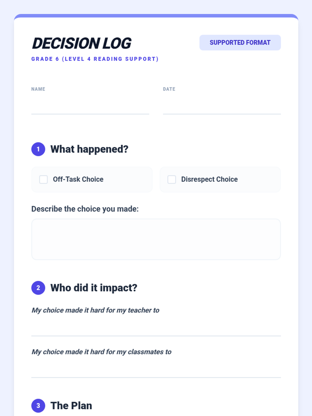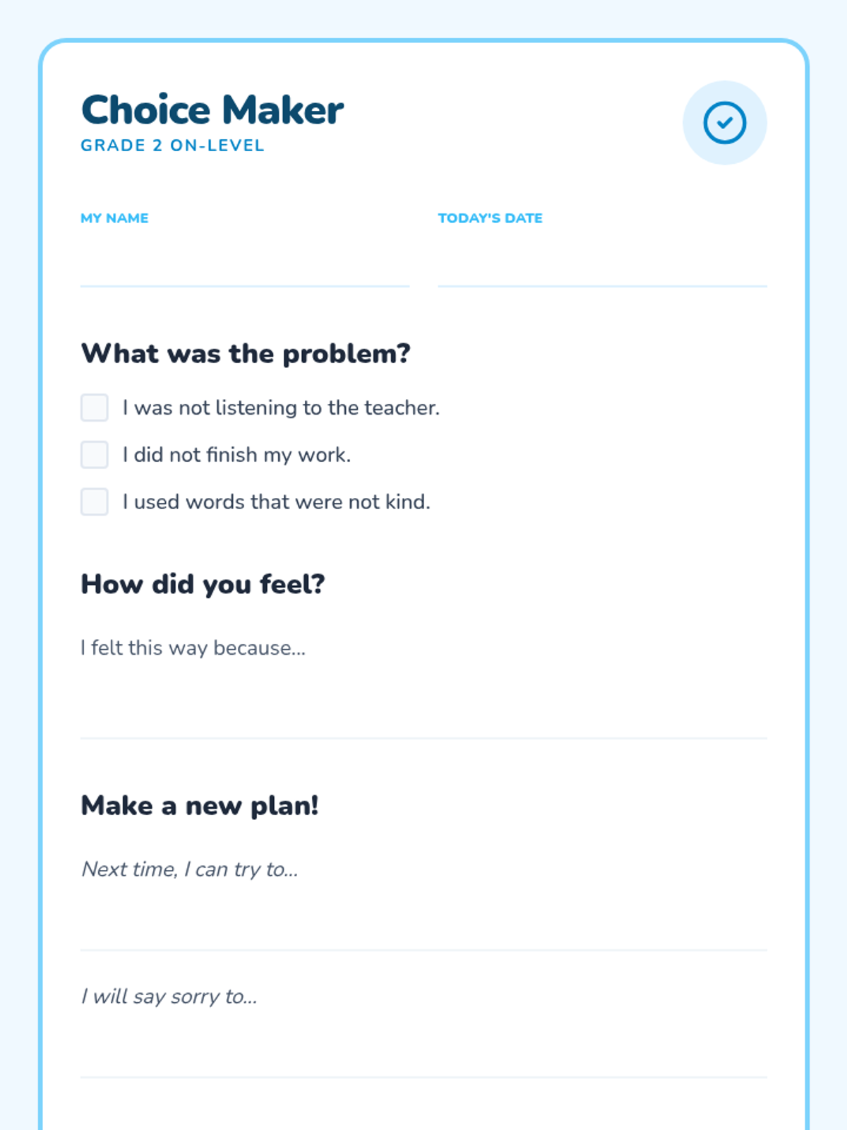 A comprehensive library of behavior reflection sheets for grades 2-6, differentiated with on-grade level and below-grade level reading supports. Each sheet focuses on disrespectful behavior and off-task choices using a restorative approach.