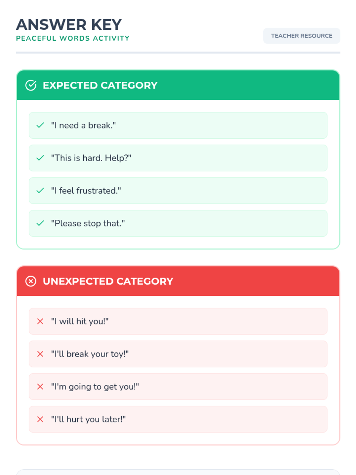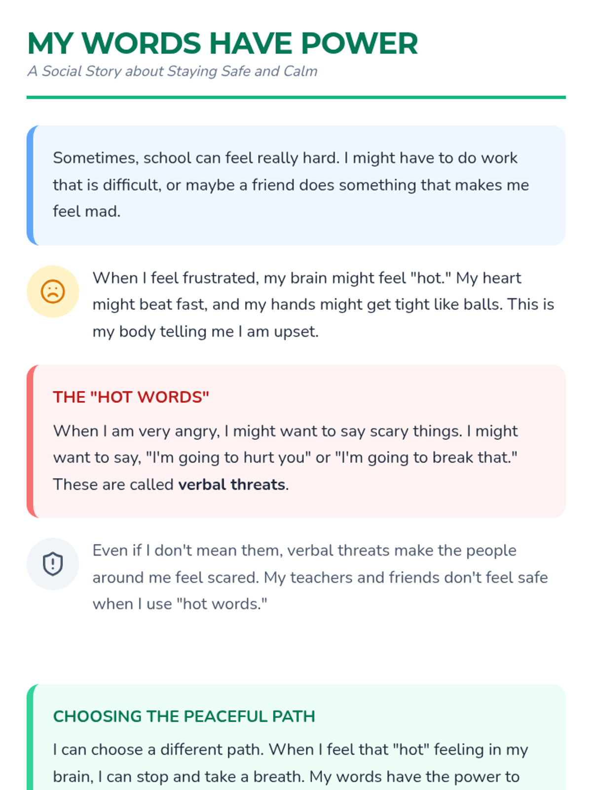 This lesson helps students understand the impact of verbal threats when feeling frustrated at school and provides concrete replacement phrases and self-regulation strategies.
