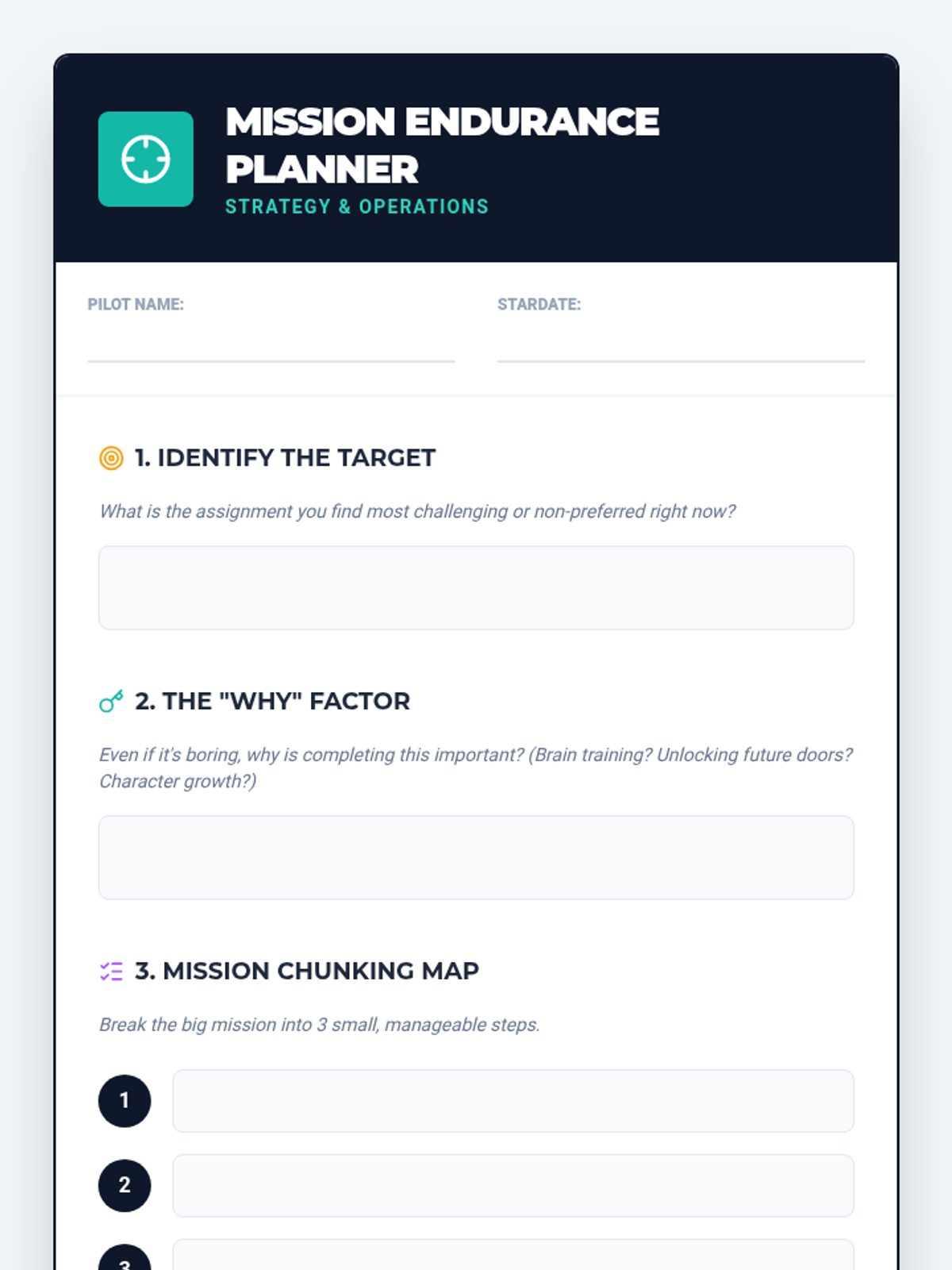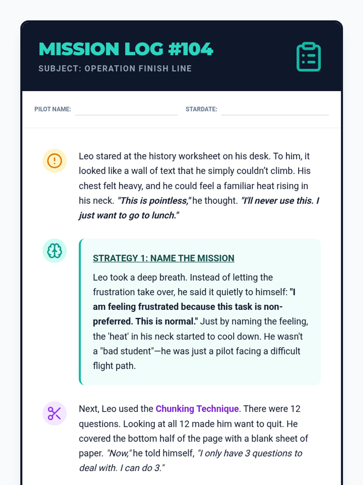 This lesson equips students with strategies to tackle non-preferred tasks, understand the purpose of their assignments, and manage the frustration that comes with challenging content. It uses a 'Mission Control' theme to frame task completion as a critical operation requiring focus and endurance.