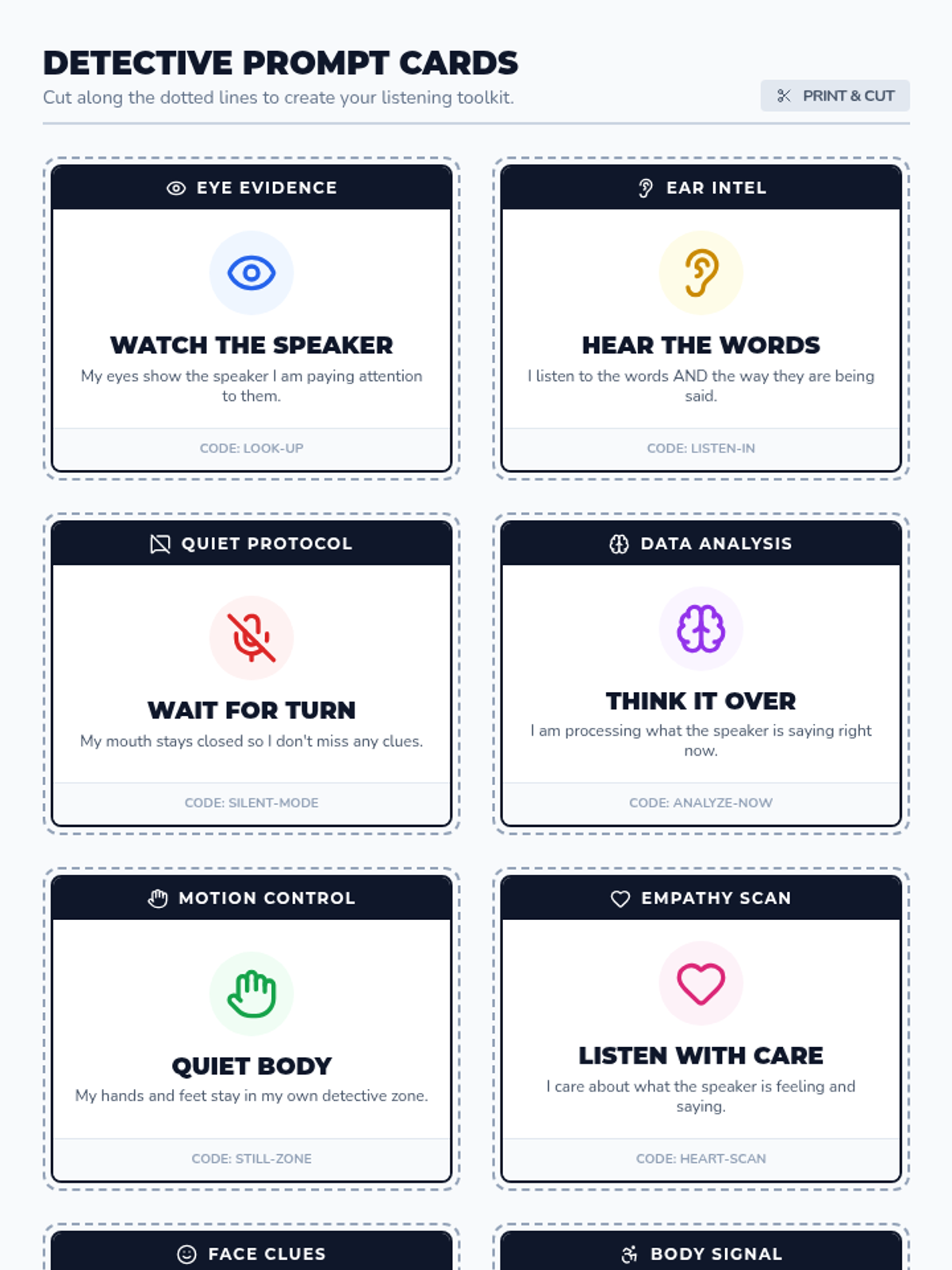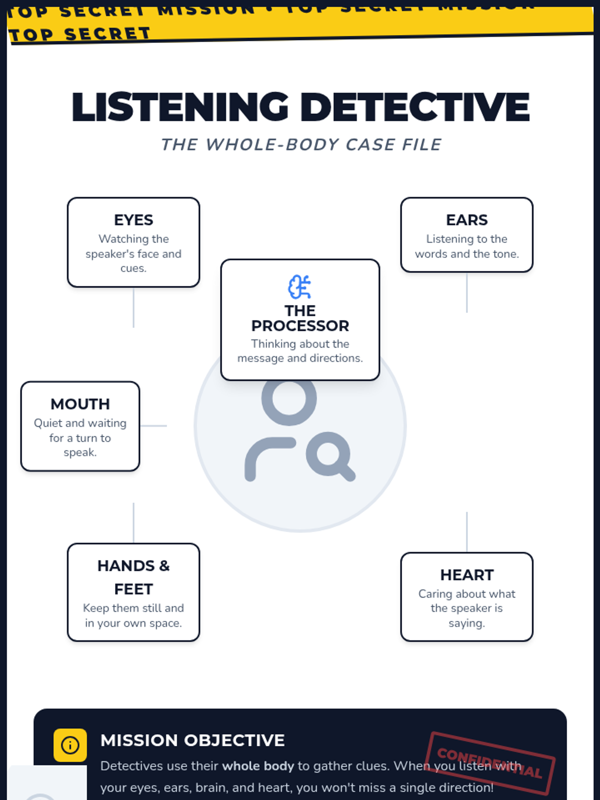 A lesson focused on teaching whole-body listening and recognizing social cues through a 'Listening Detective' theme. Students learn to use their entire bodies to listen and decode social signals during interactions.