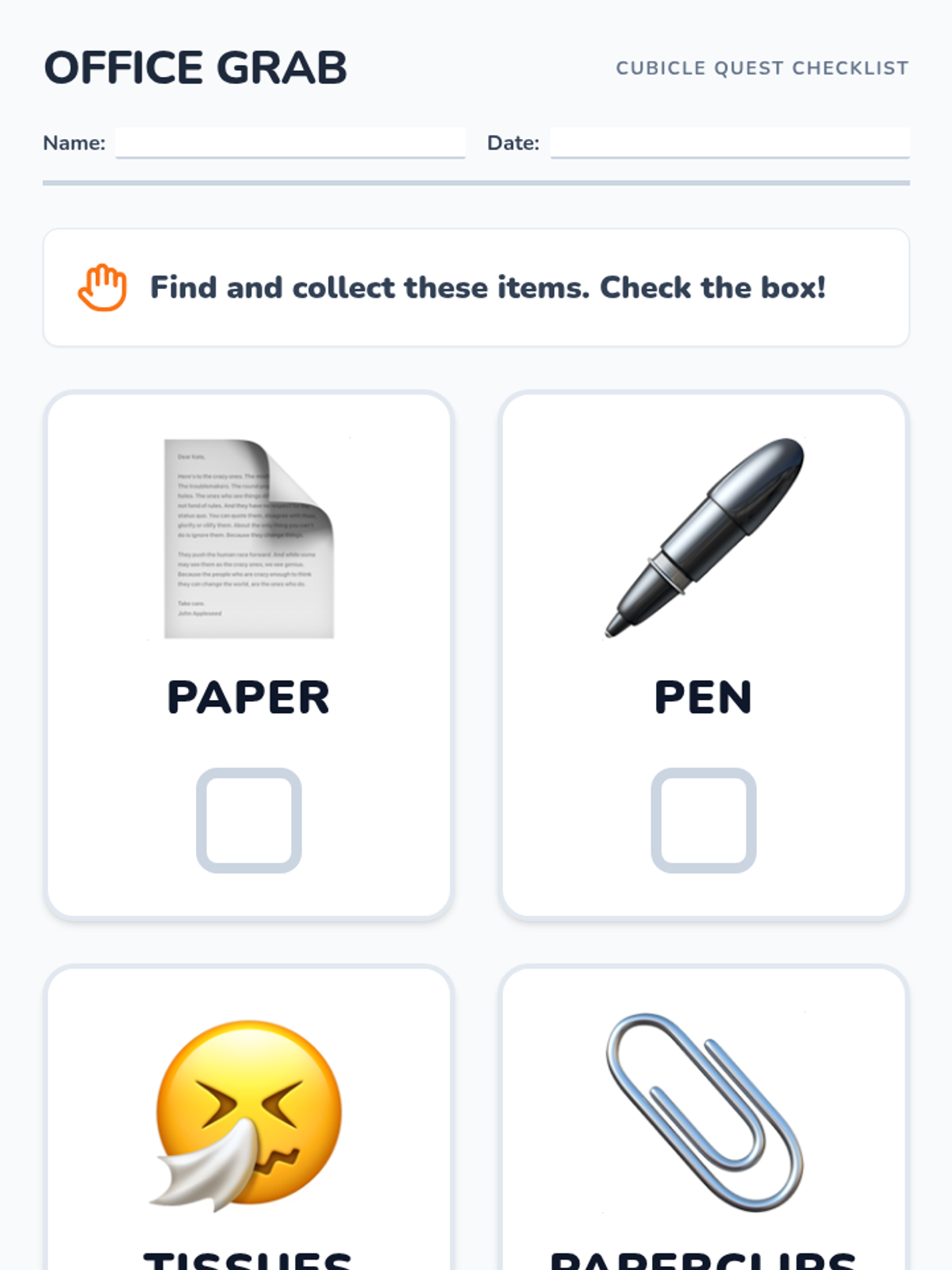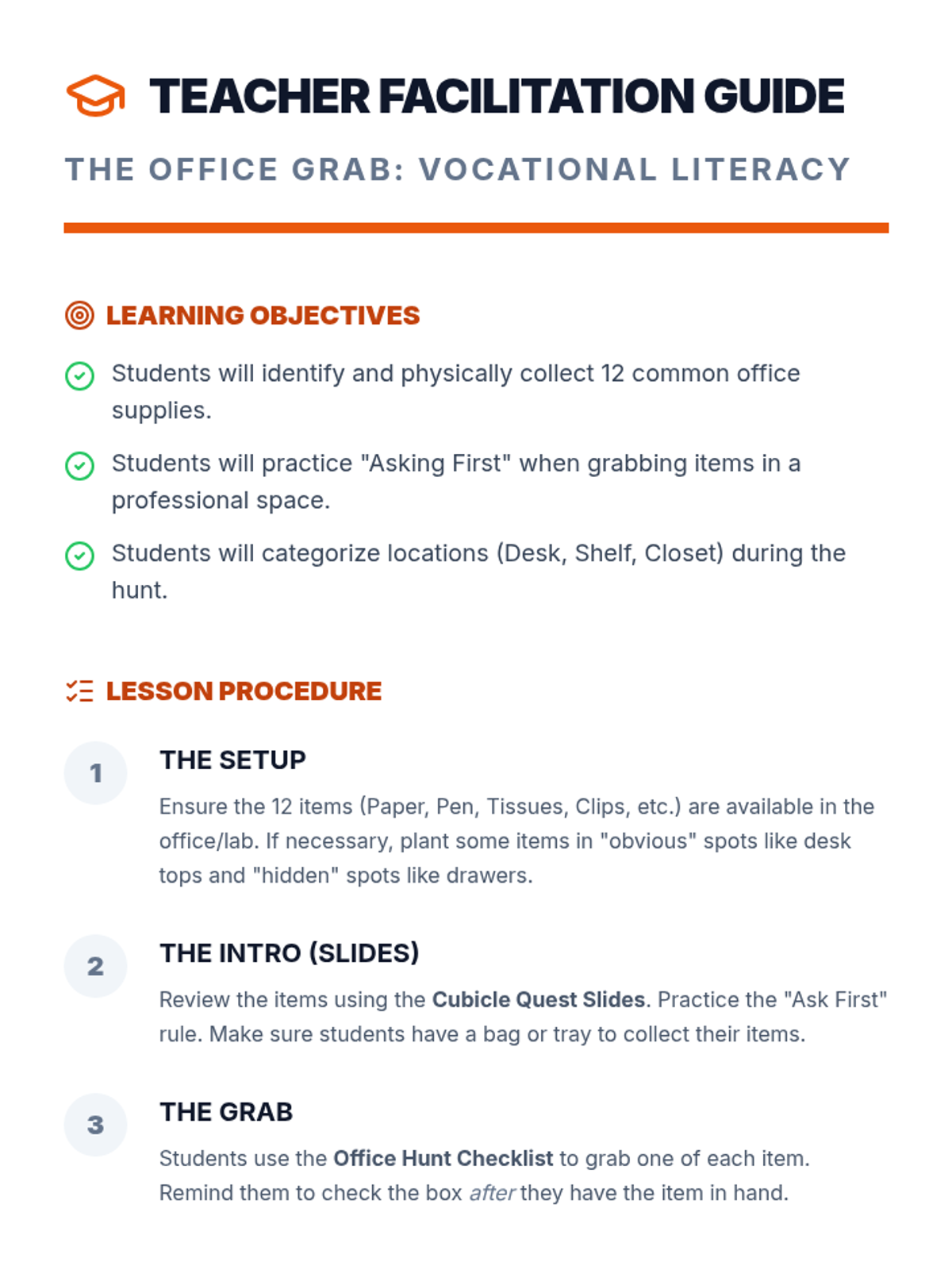 A vocational literacy lesson where students identify and locate common office supplies in professional and lab settings using visual and text-based clues.