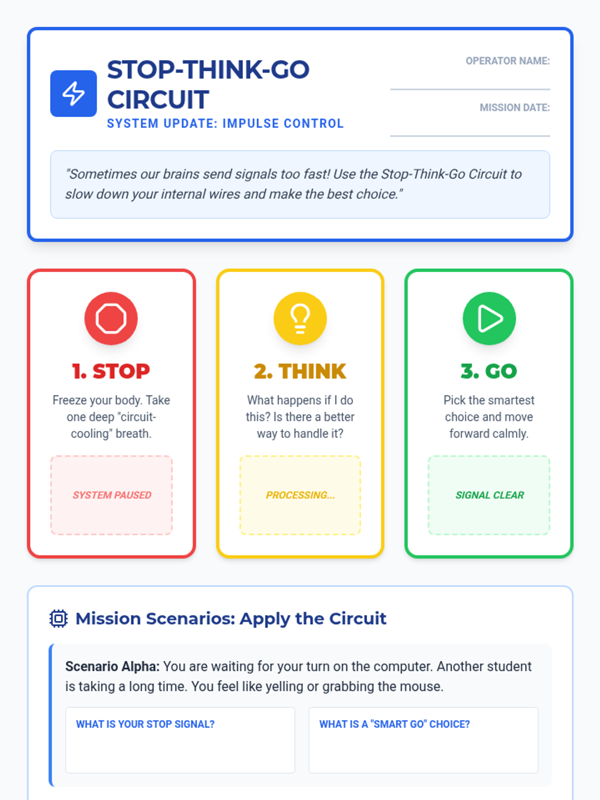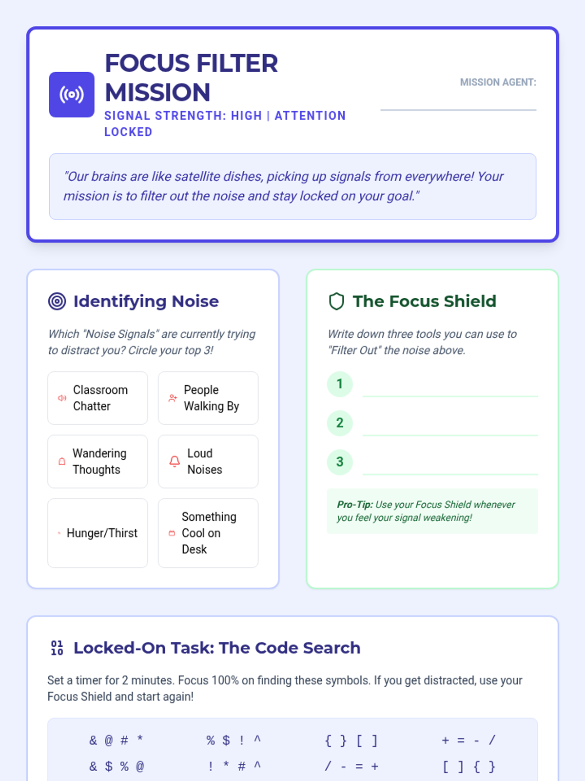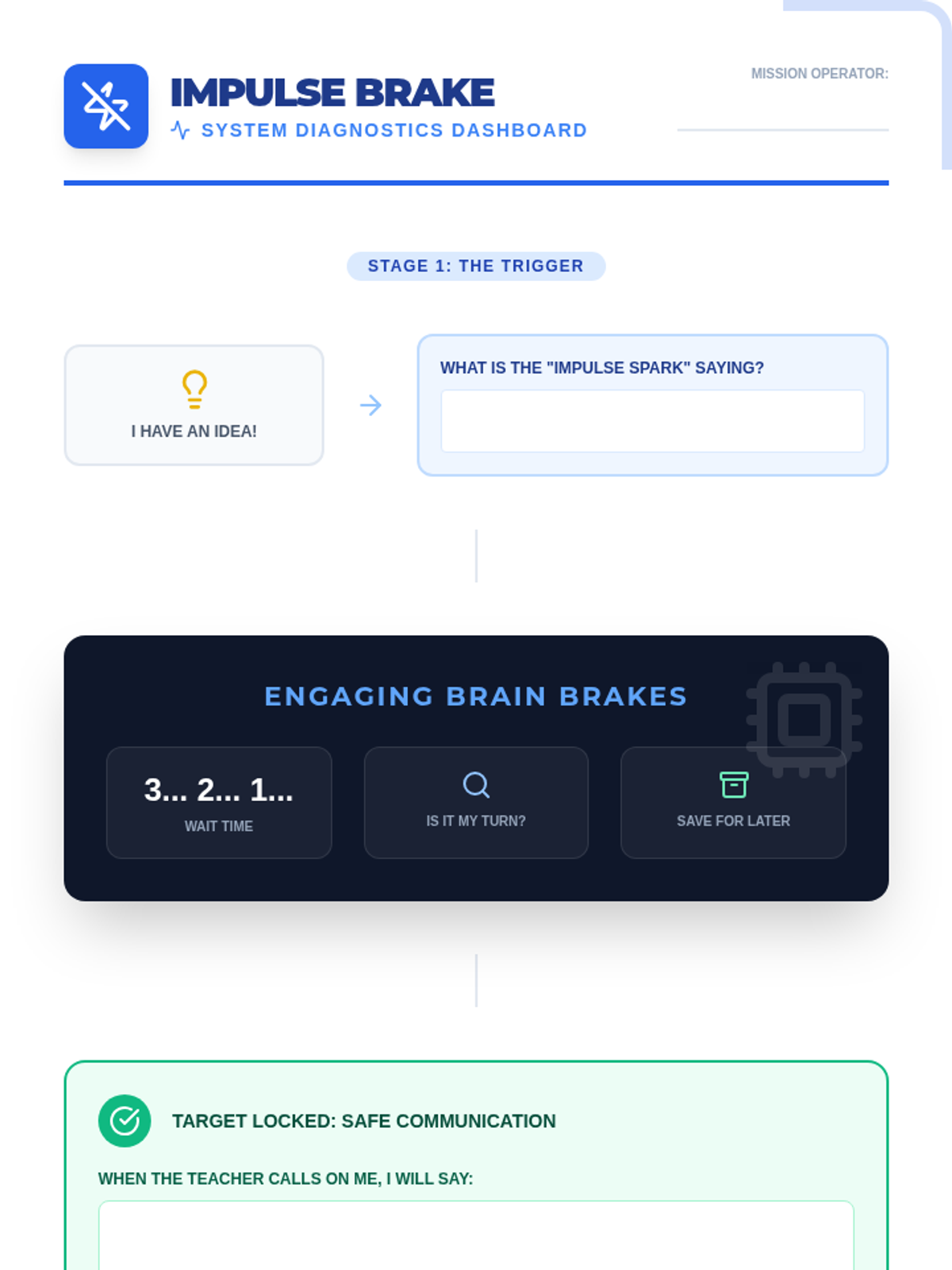 A set of interactive worksheets and tools designed for 4th-grade students to master impulse control and sustained attention through the metaphor of a 'Brain Command Center'. Students learn to 'filter' distractions and 'pause' their internal circuits before acting.