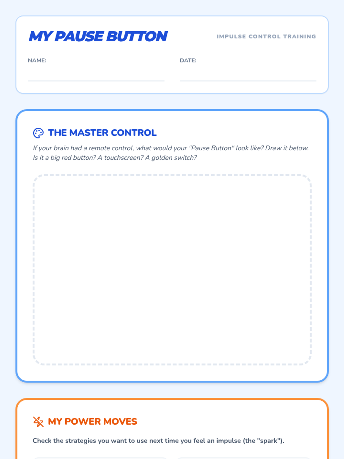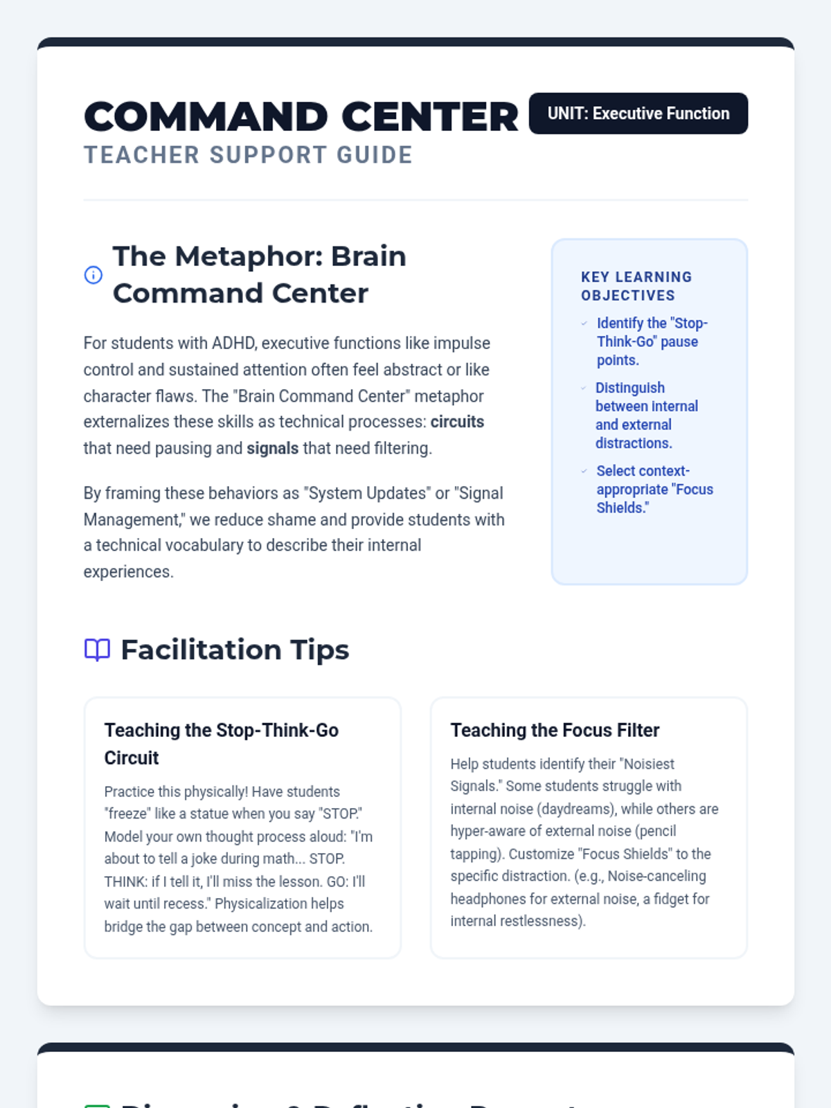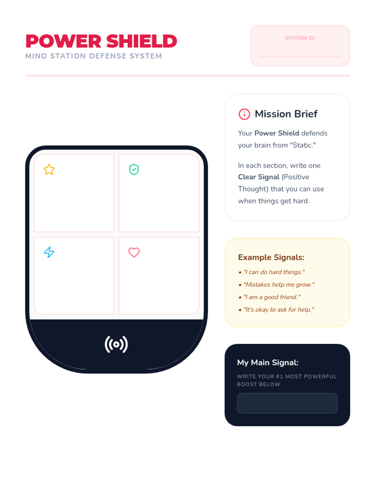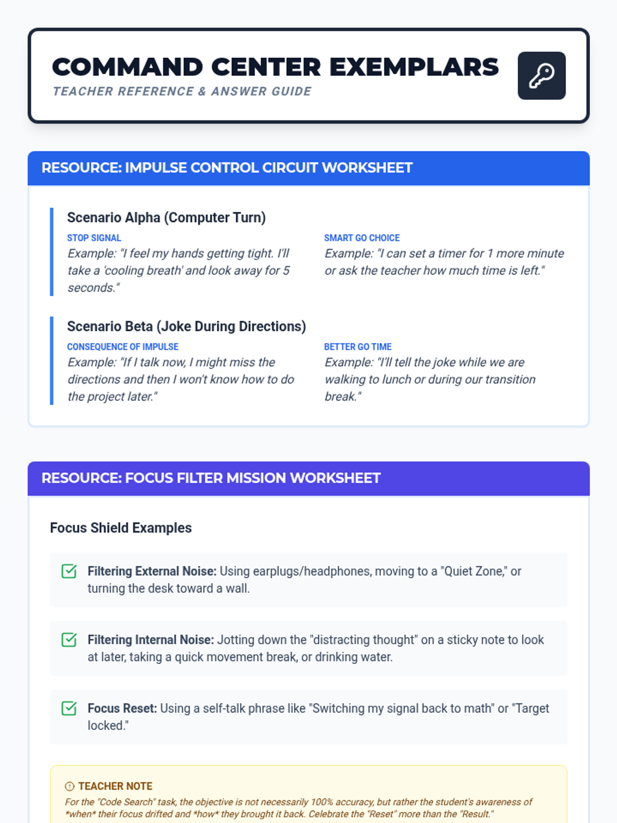 A set of interactive worksheets and tools designed for 4th-grade students to master impulse control and sustained attention through the metaphor of a 'Brain Command Center'. Students learn to 'filter' distractions and 'pause' their internal circuits before acting.