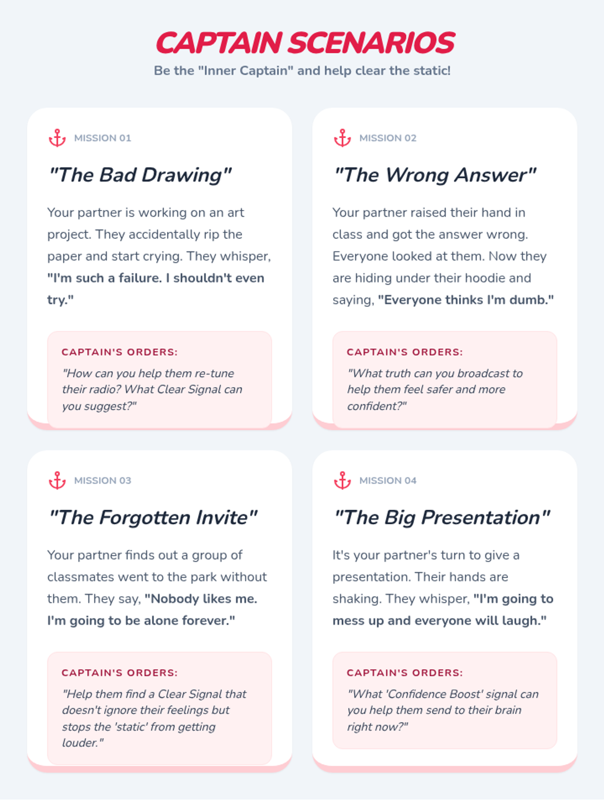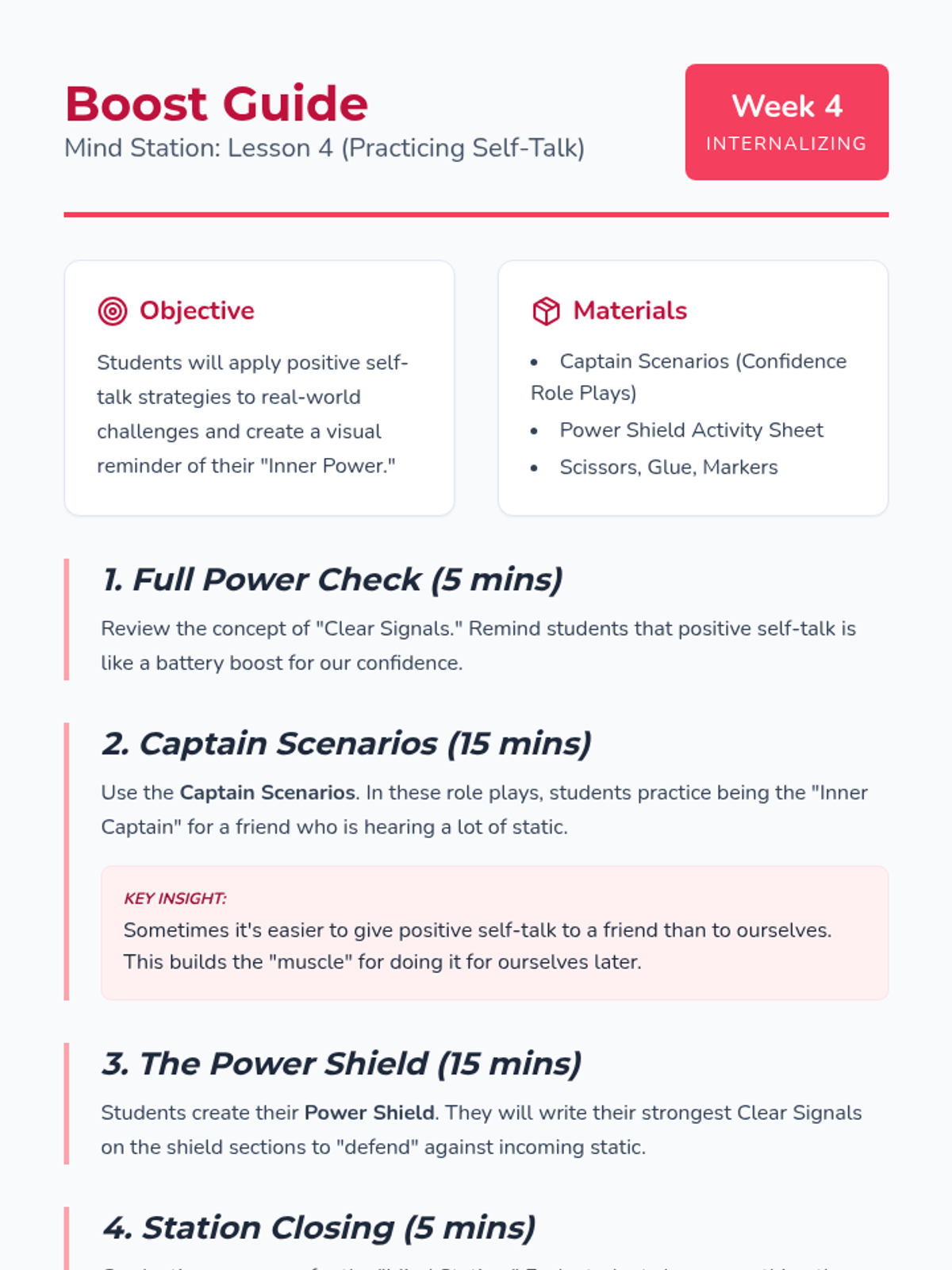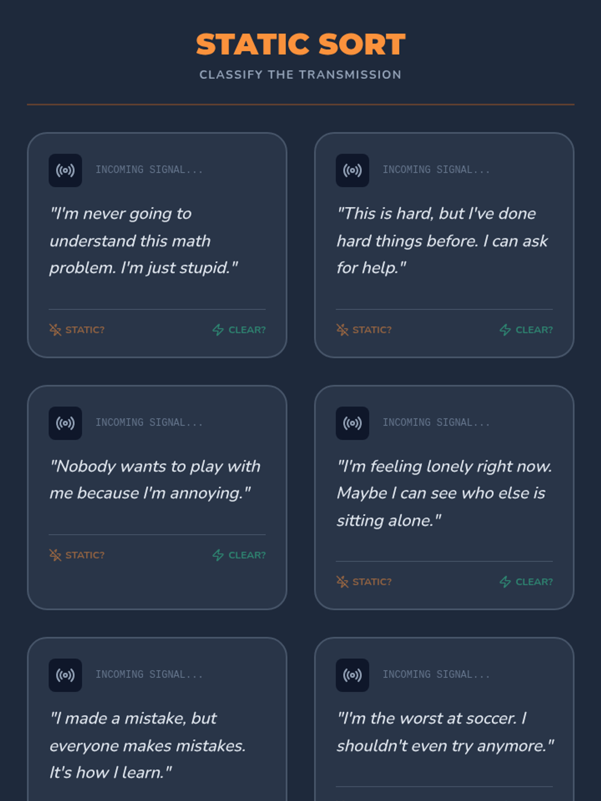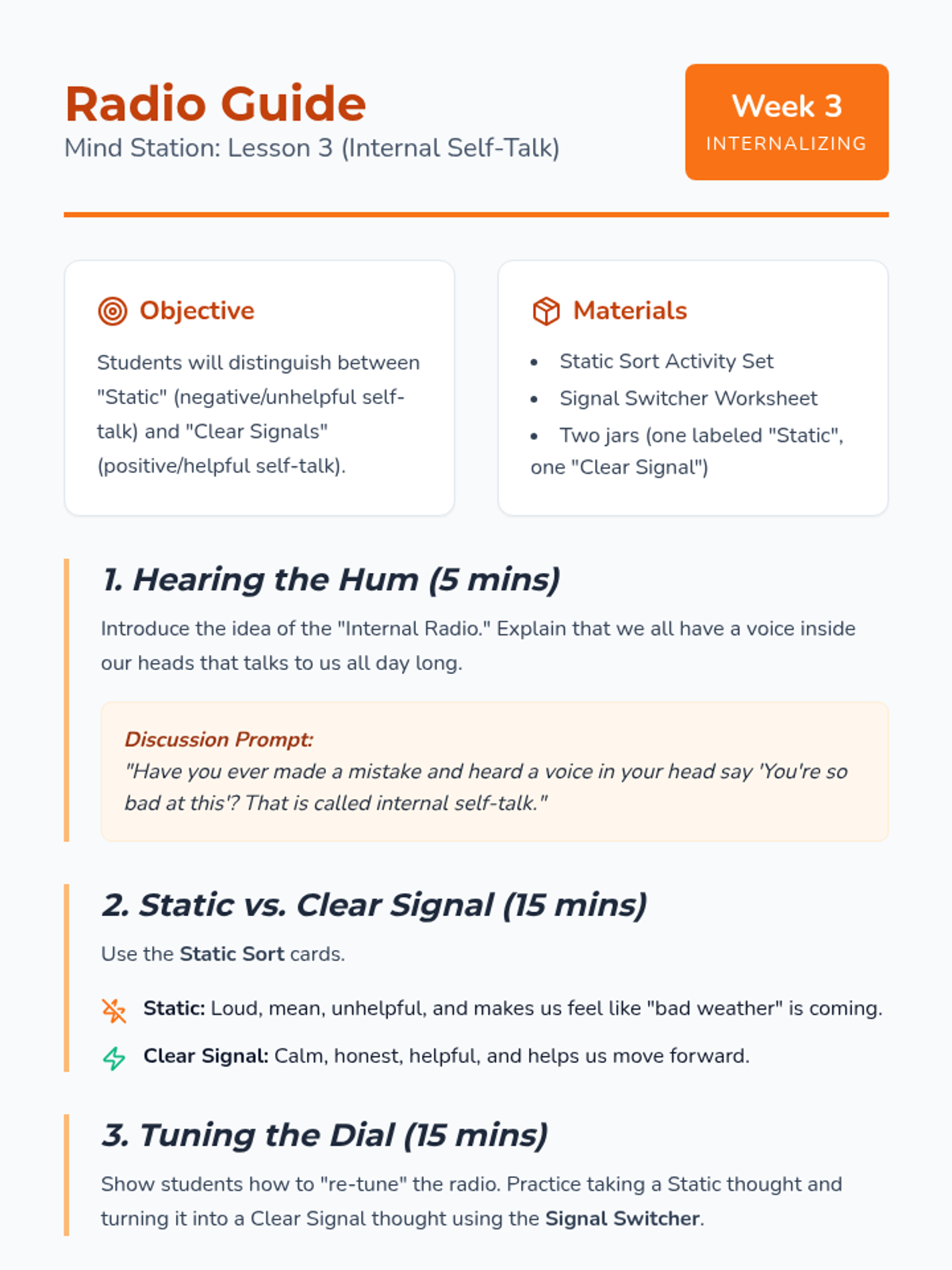 Introduction to the concept of internal dialogue. Students learn to distinguish between 'static' (negative self-talk) and 'clear signals' (positive self-talk).