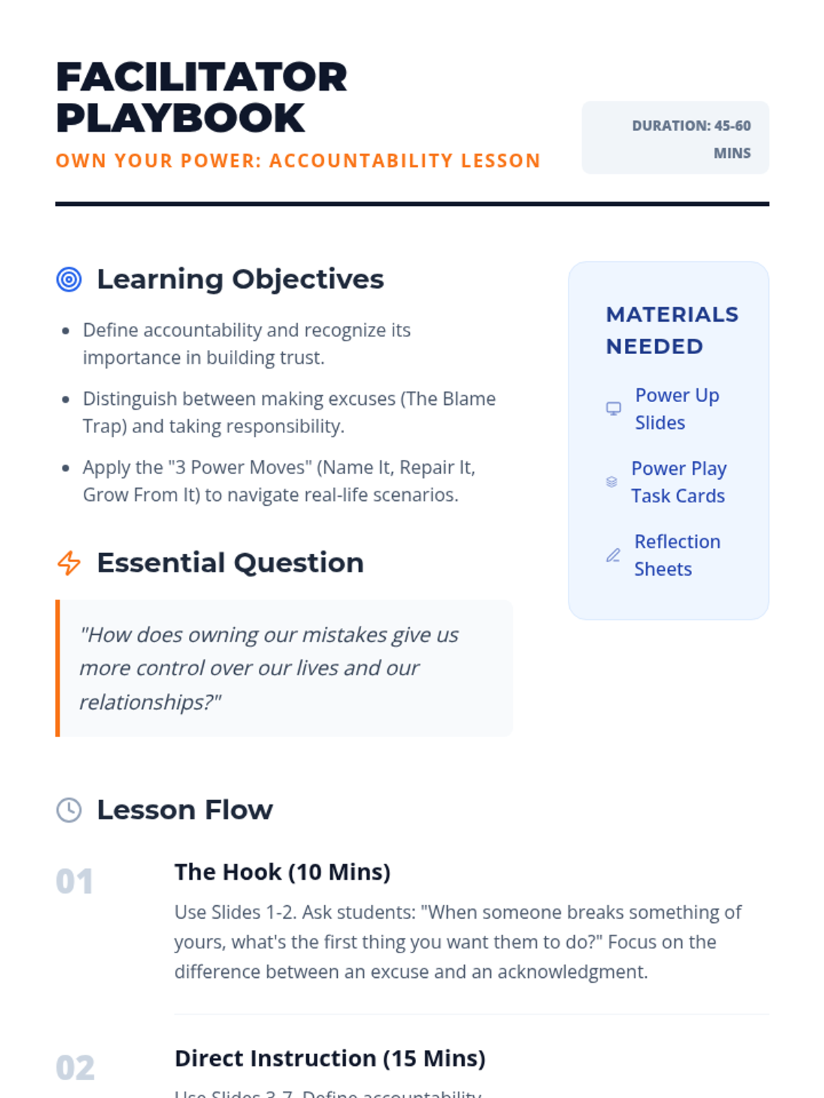A dynamic lesson on self-management and relationship skills focusing on the concept of 'owning it'—taking accountability for one's actions to build trust and personal growth.