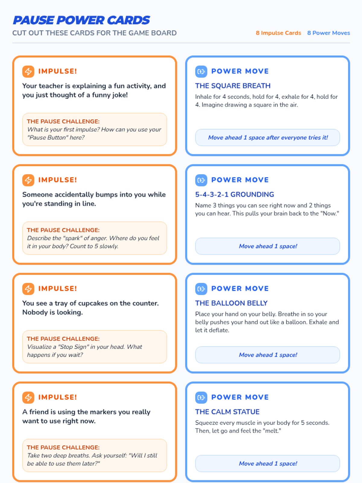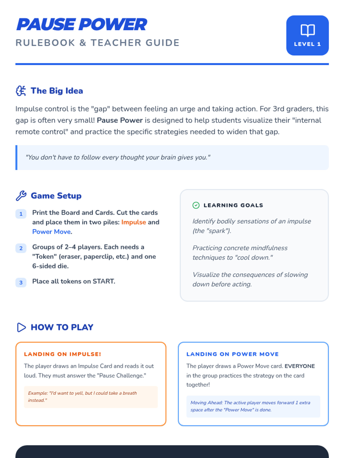 A lesson focused on developing impulse control through a collaborative board game. Students learn to recognize impulsive urges and apply 'pause' strategies to make thoughtful choices.