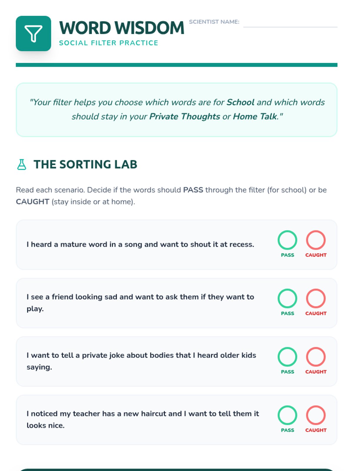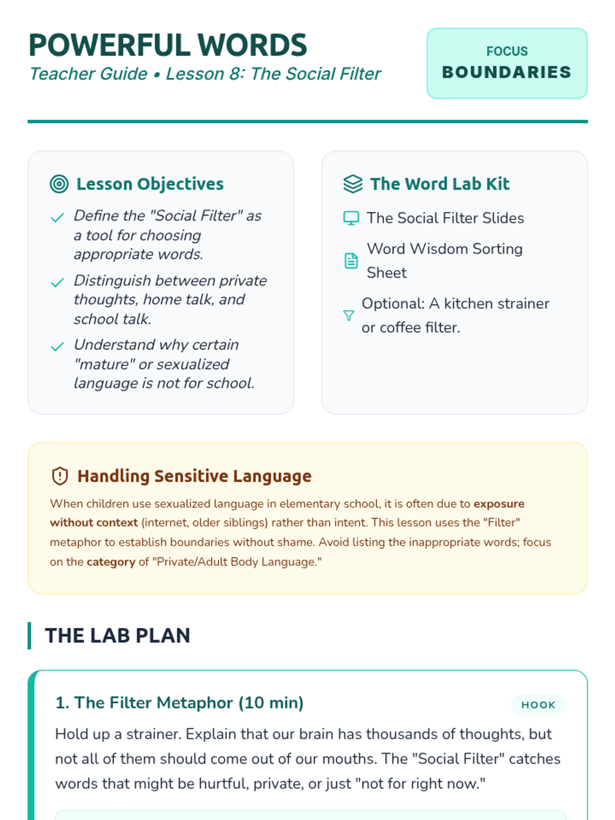 A sensitive but clear lesson on understanding social boundaries and appropriate language in a school setting. It introduces the 'Social Filter' metaphor to help students distinguish between private thoughts, home talk, and school/public language.
