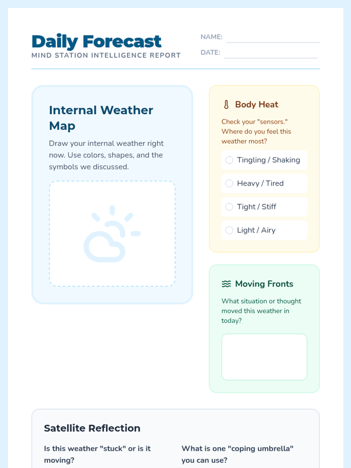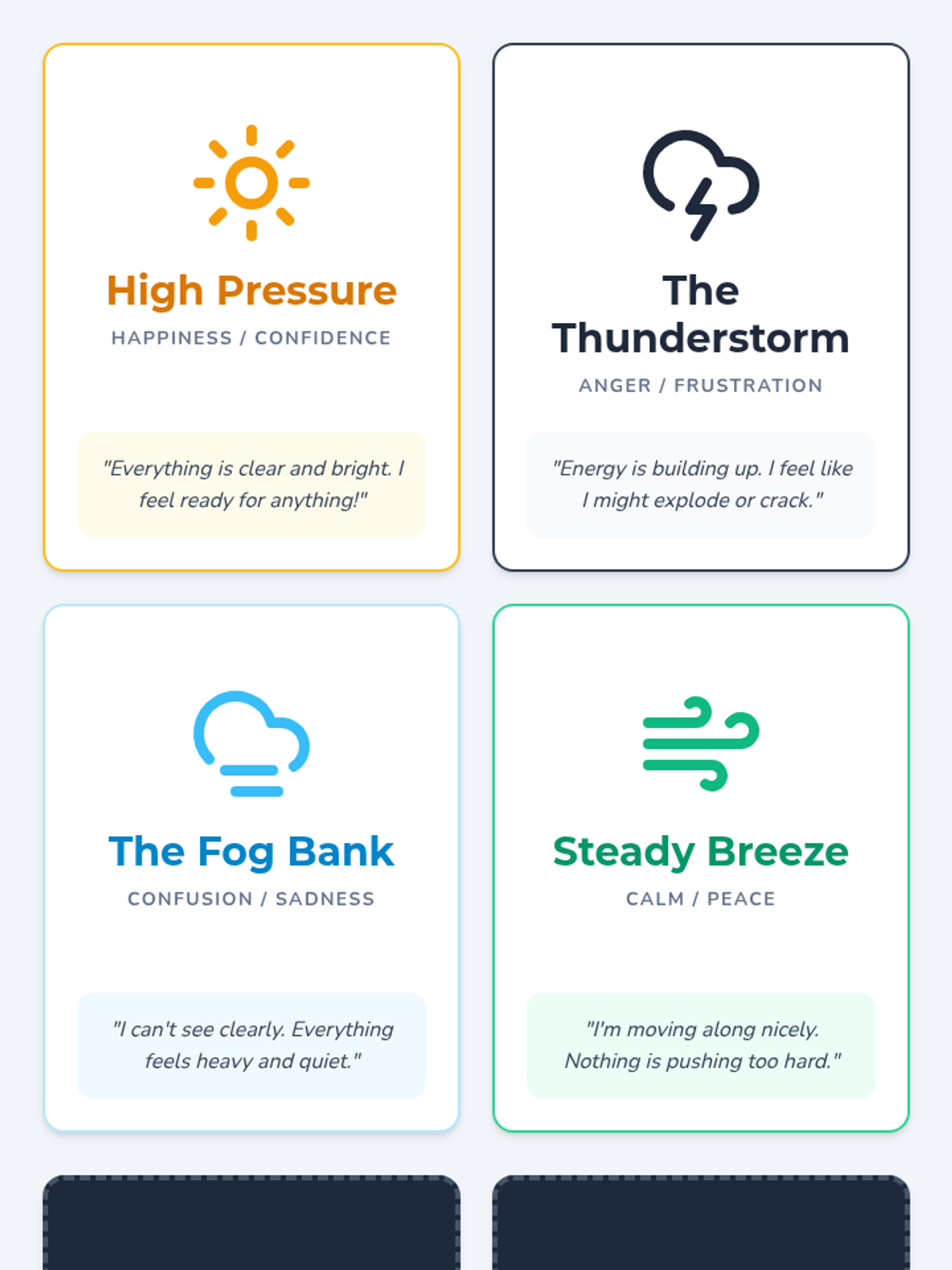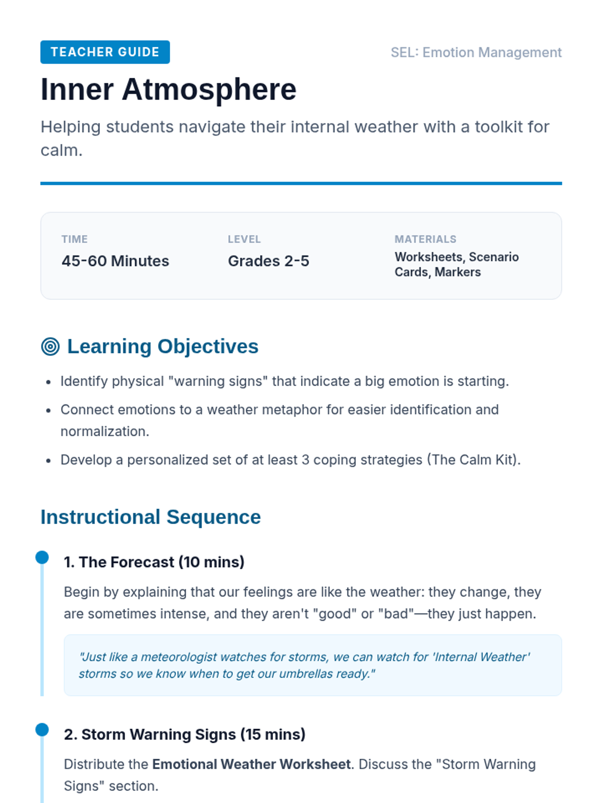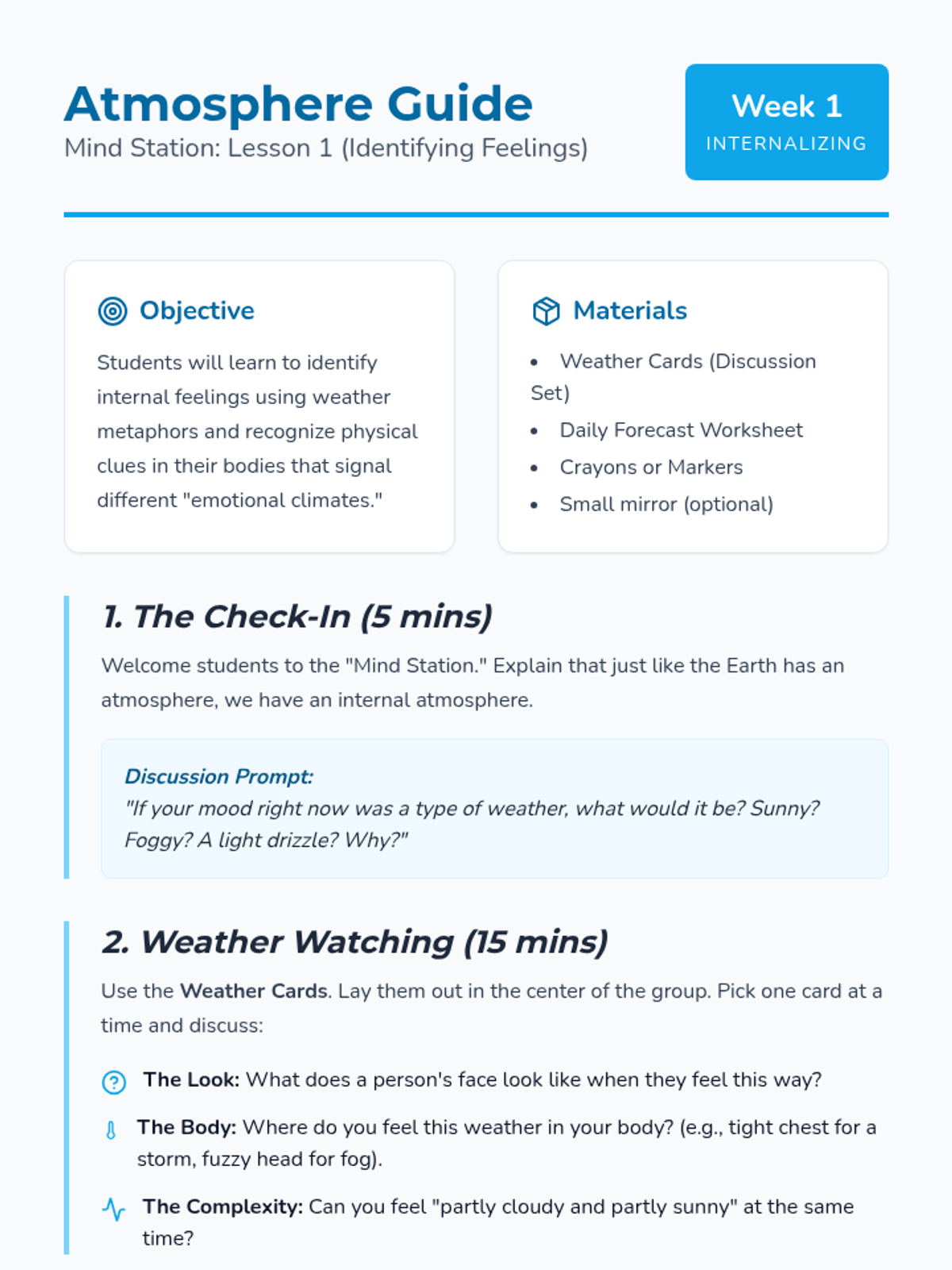 Introduction to identifying internal feelings using weather metaphors. Students explore the spectrum of emotions and how they manifest physically and mentally.