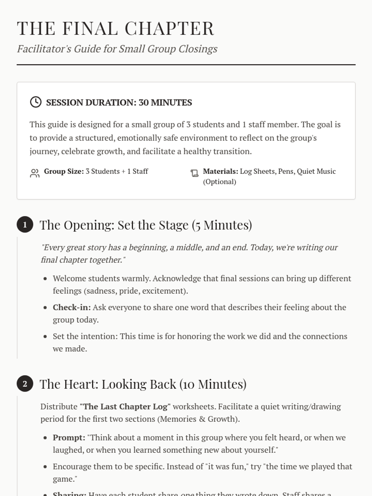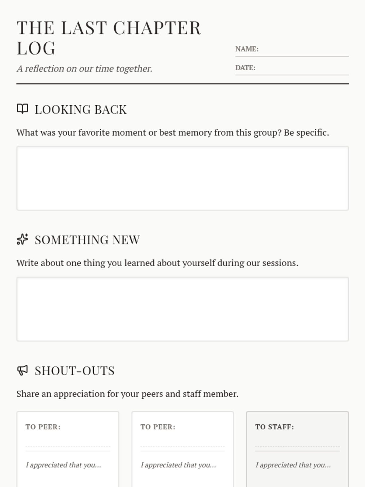 A reflective final session designed for a small group of three students and one staff member to process their time together, celebrate achievements, and transition forward.