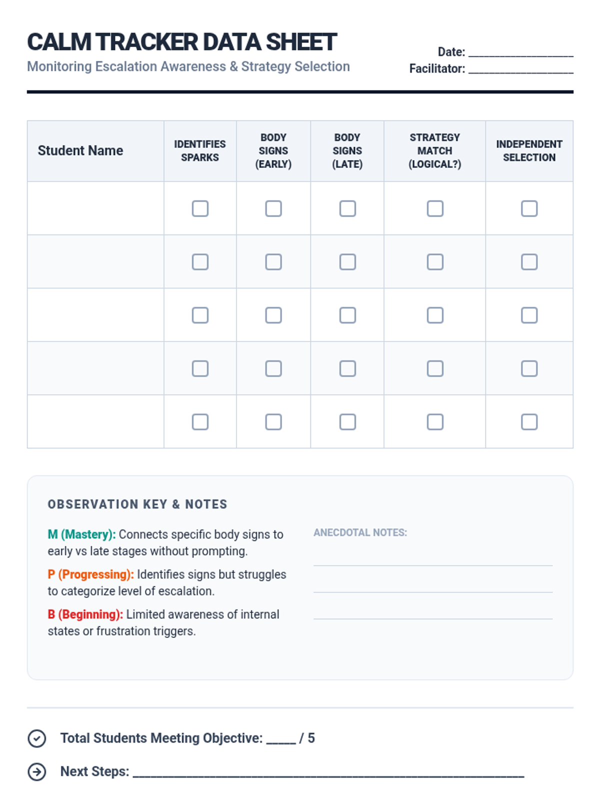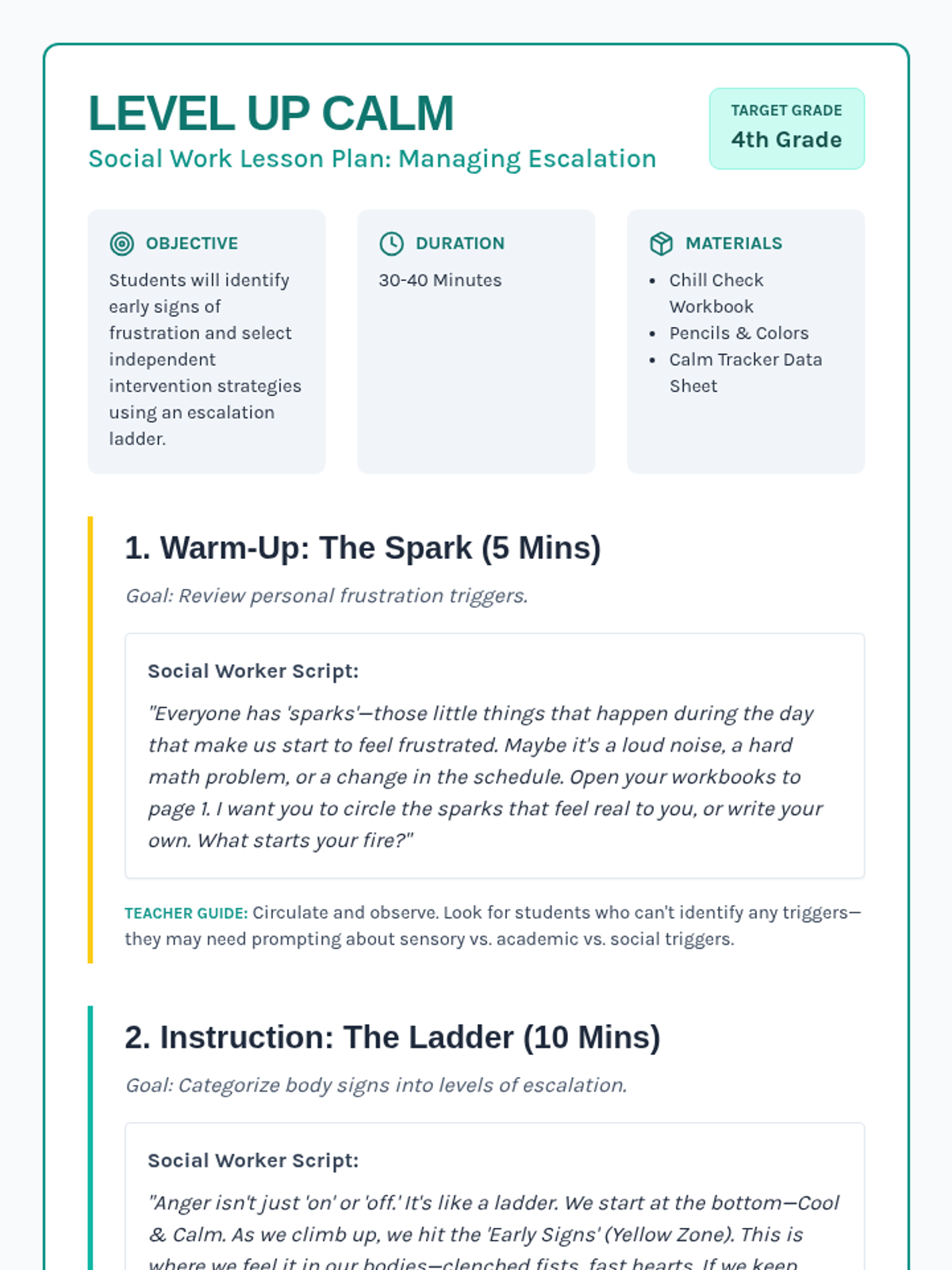 A comprehensive 4th-grade social work lesson focused on identifying early signs of frustration and selecting independent coping strategies using an escalation ladder model.