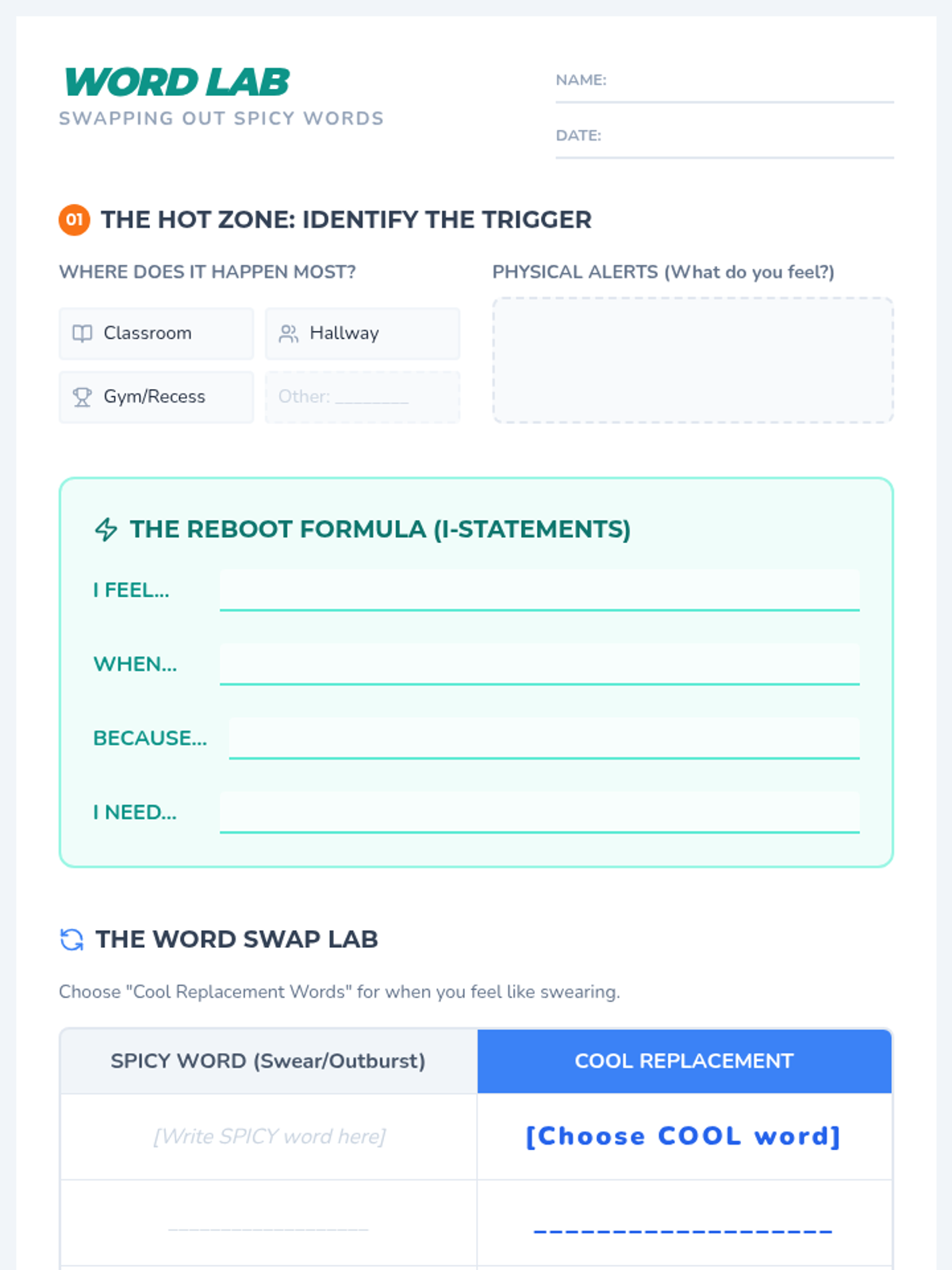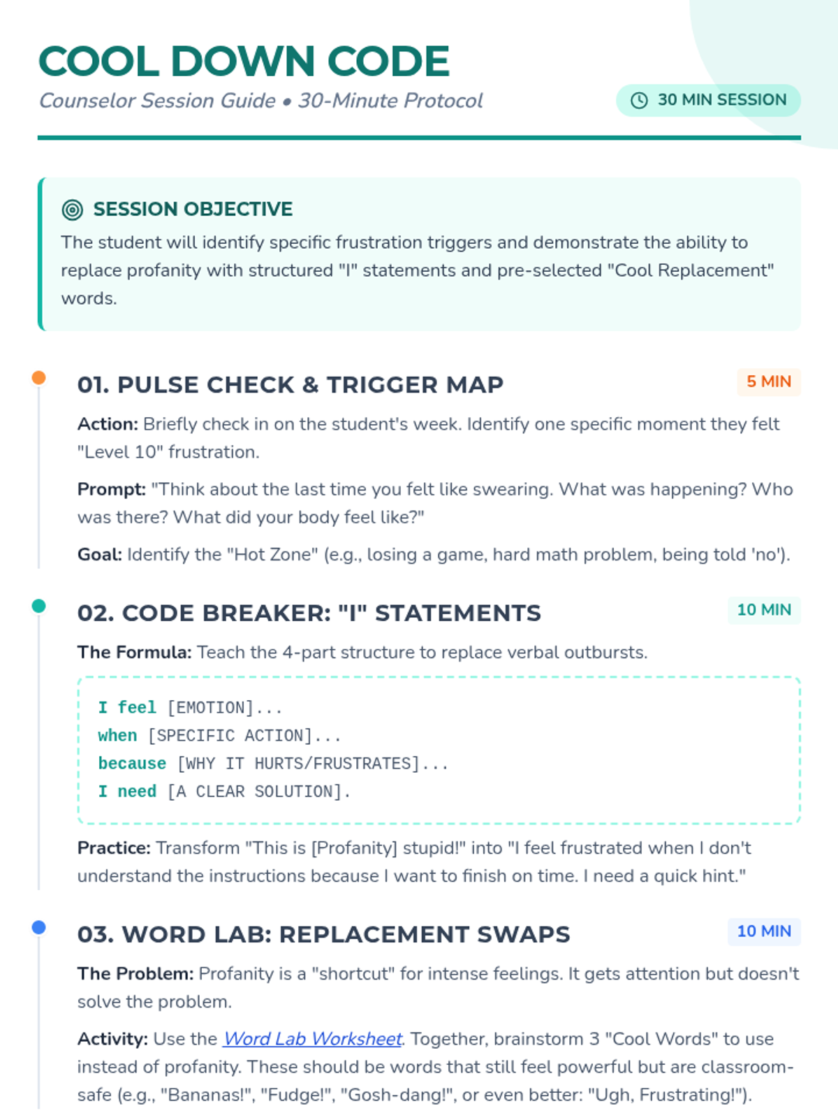 A 30-minute counseling session focused on replacing profanity with 'I' statements and clean replacement words during moments of frustration. Students learn to identify triggers and practice self-regulation through structured communication.