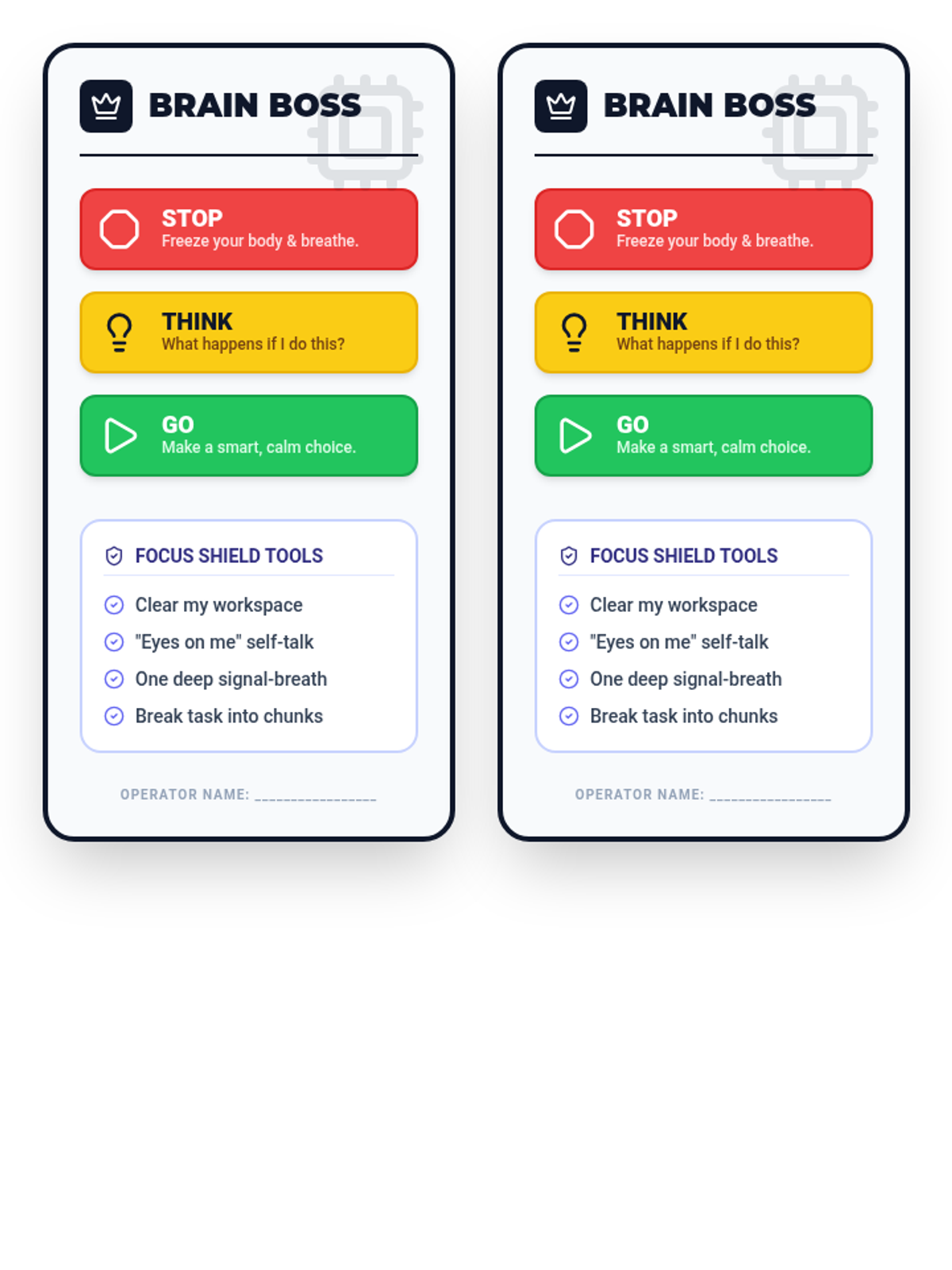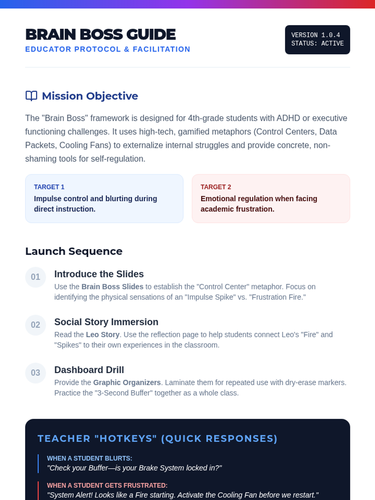 A set of tools and stories designed to help 4th-grade students master impulse control and navigate academic frustration using 'Brain Boss' strategies.