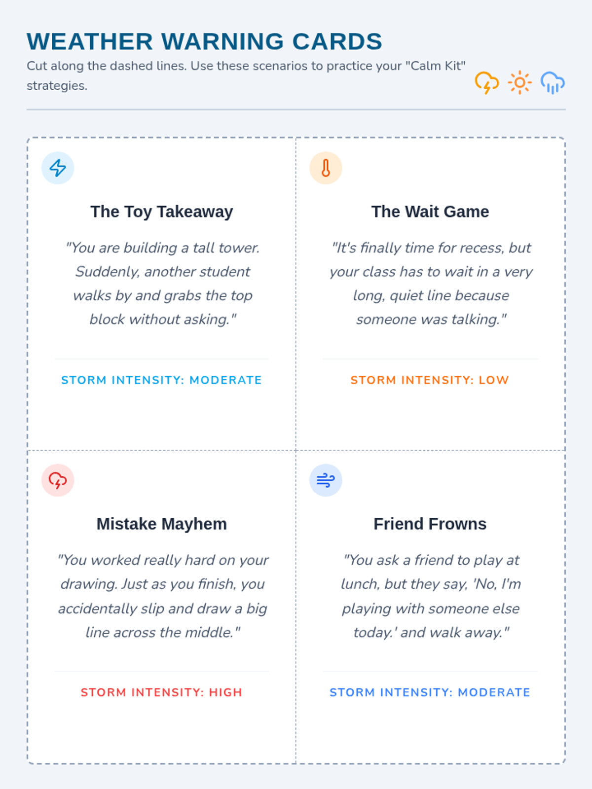 A comprehensive lesson for mixed-age elementary students to identify the 'size' of different problems using a weather-themed 5-point scale and learn to match their reactions accordingly.