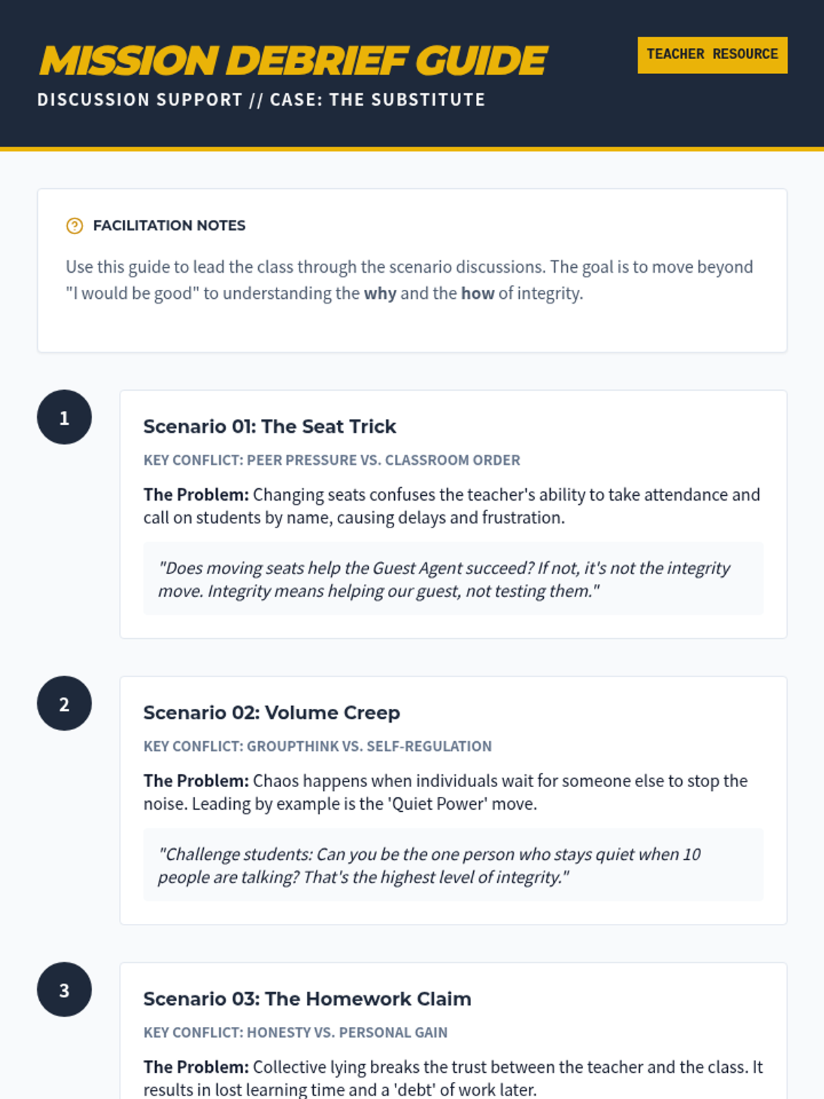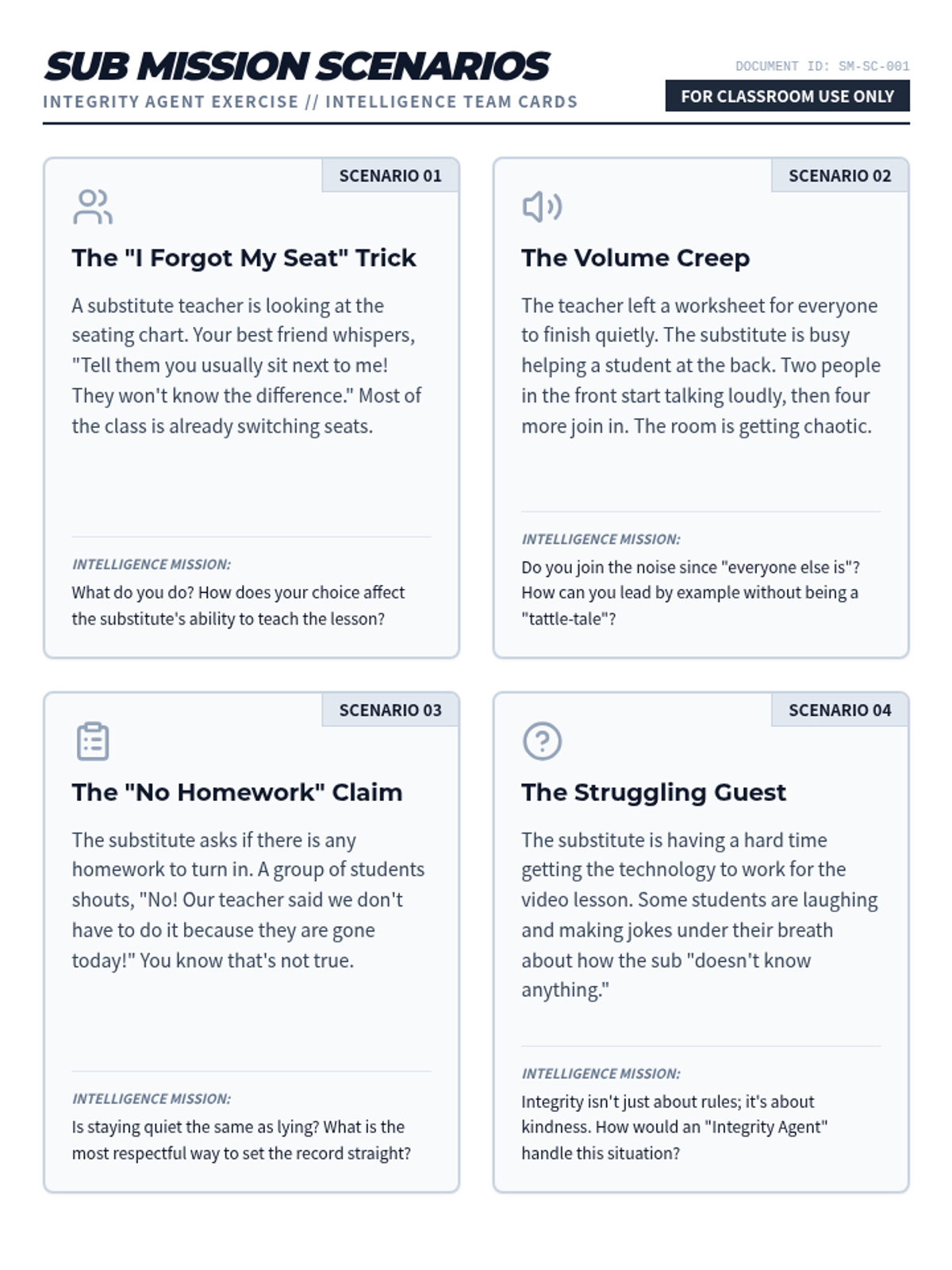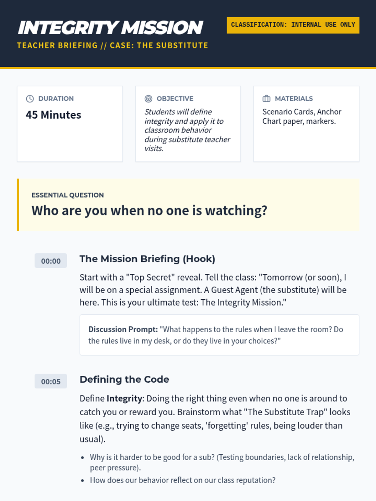 A 45-minute lesson focused on maintaining high behavioral standards and integrity when a substitute teacher is in the classroom. Students explore the concept of integrity through scenario-based discussions and personal reflection.