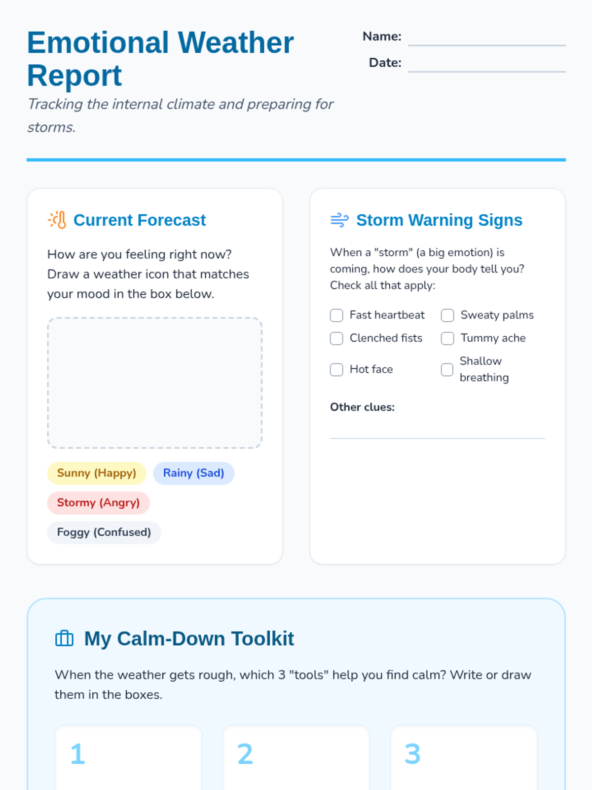 A social-emotional learning lesson focused on identifying physical cues of big emotions and developing a personalized 'calm down' toolkit. Students use a weather metaphor to understand and manage their internal states.