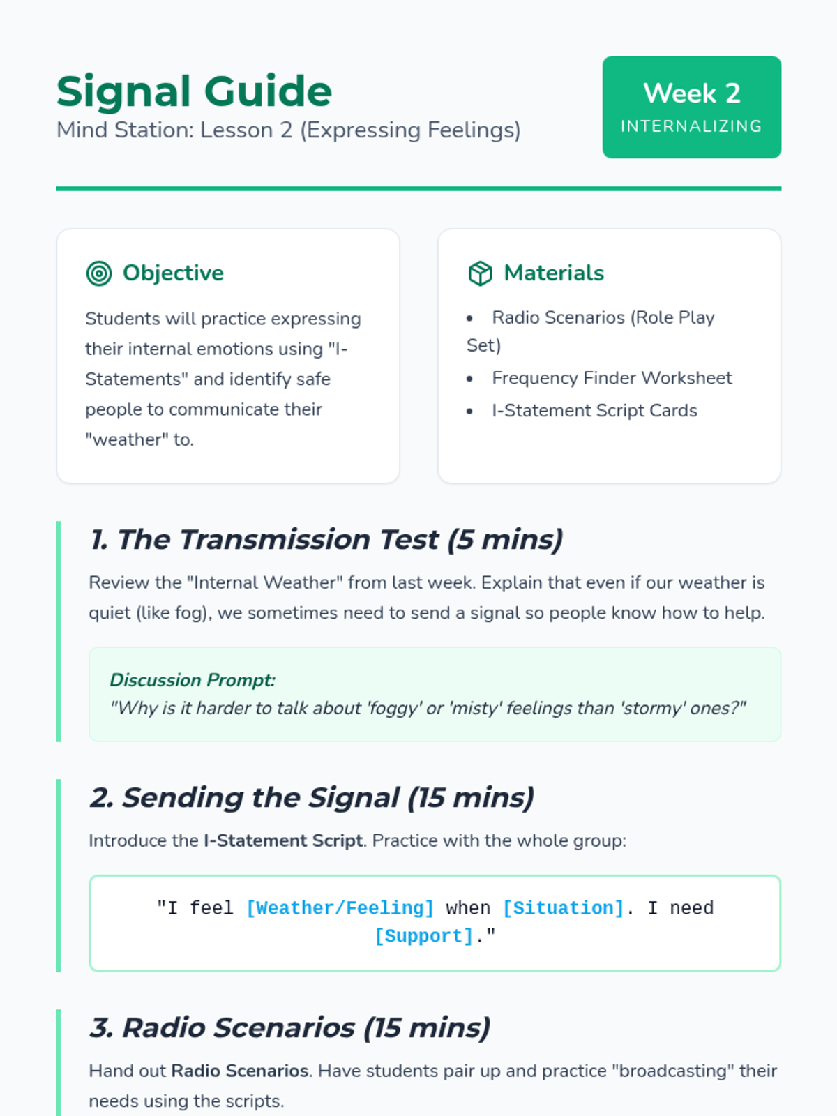 Focus on expressing internal feelings effectively to others. Students practice using I-statements and identifying appropriate times and ways to share their 'internal weather'.