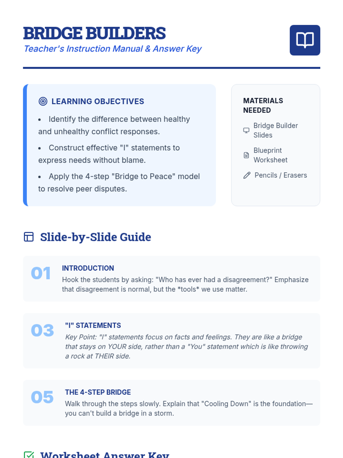 A lesson focused on teaching students the 4-step 'Bridge to Peace' conflict resolution model, featuring 'I' statements and active listening techniques through interactive scenarios.