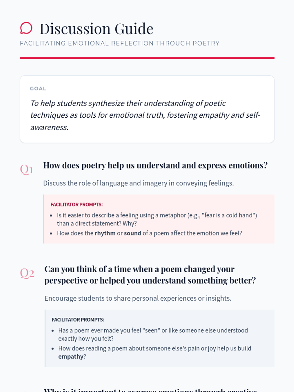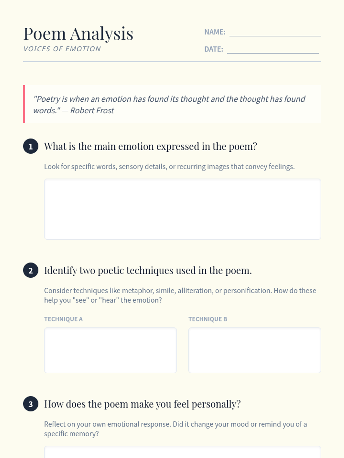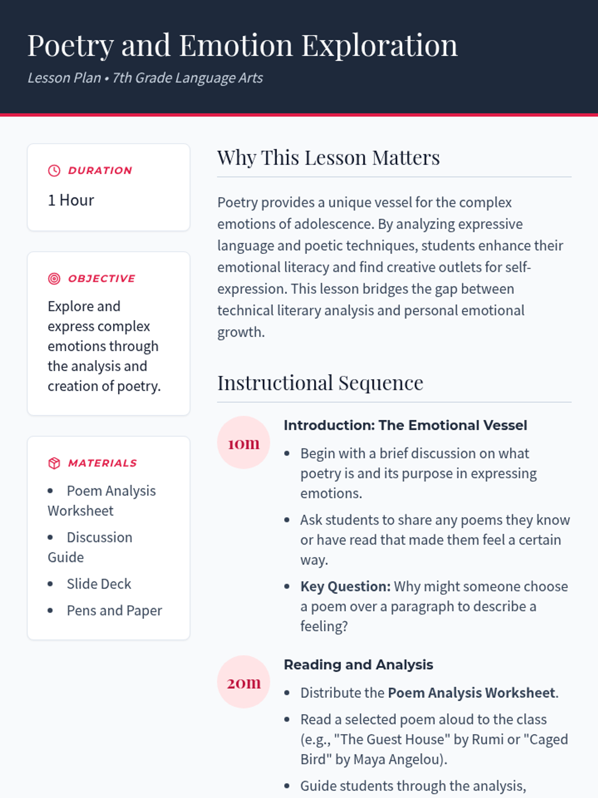 A comprehensive lesson for 7th grade students to explore emotional expression through poetry, featuring analysis of techniques and creative writing exercises.
