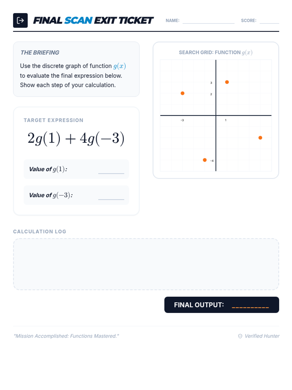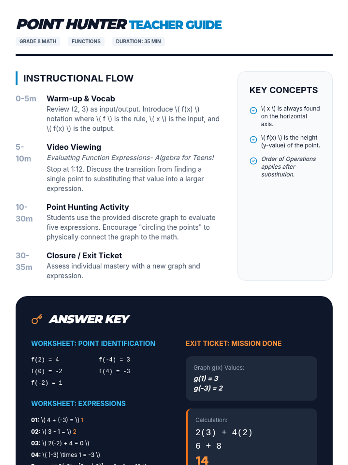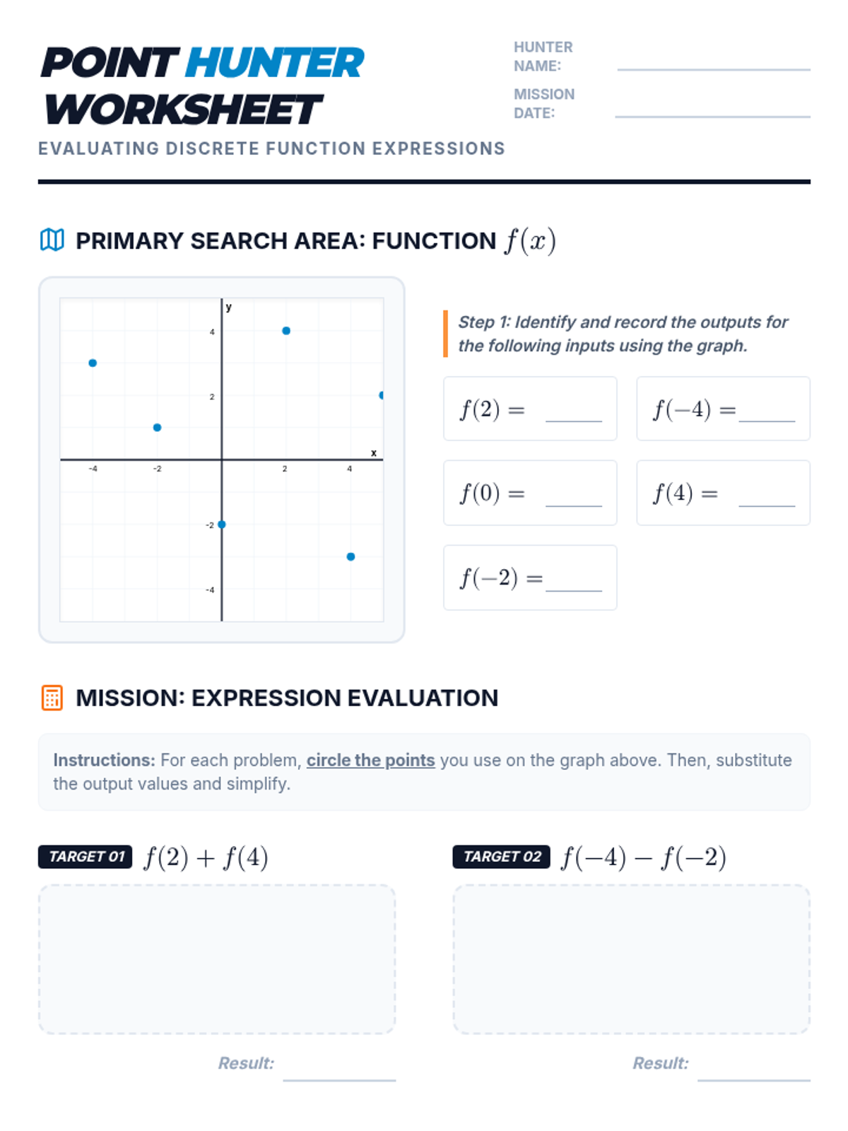 Students will learn to evaluate numerical expressions involving function notation by identifying outputs from discrete graphs. This lesson uses a scavenger hunt theme ('Point Hunting') to engage students in finding specific coordinates and performing substitution.