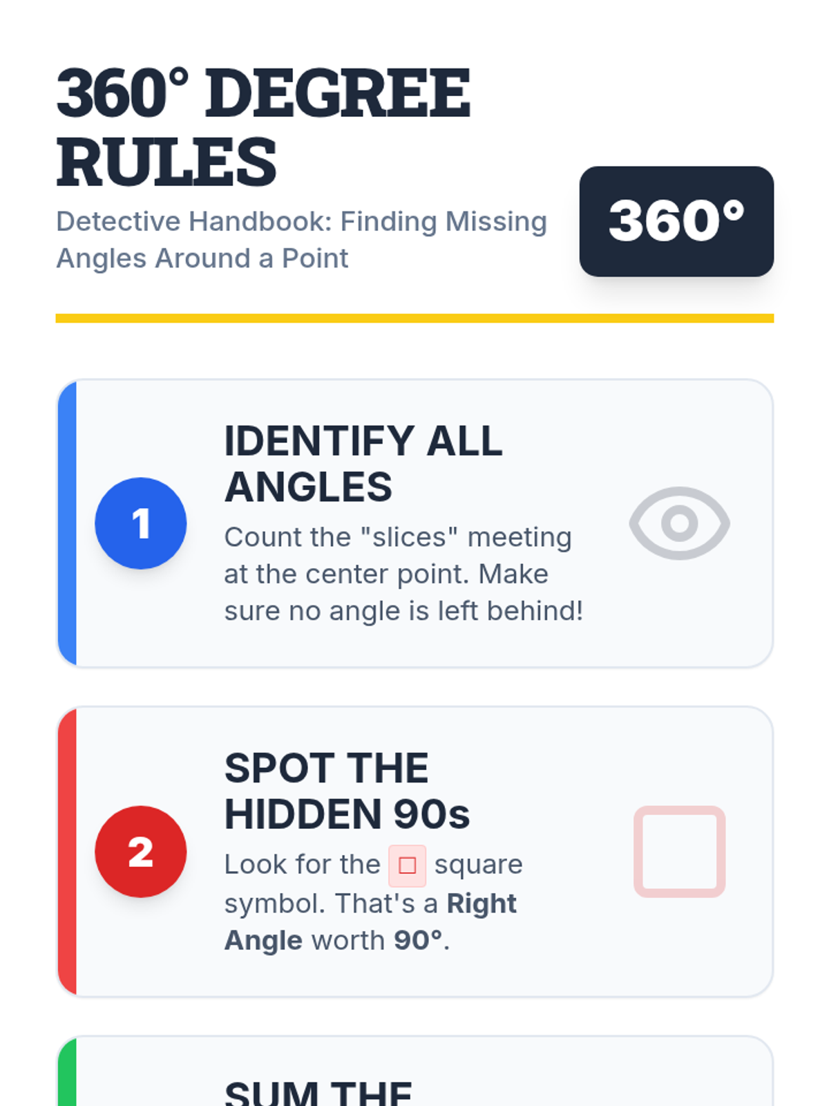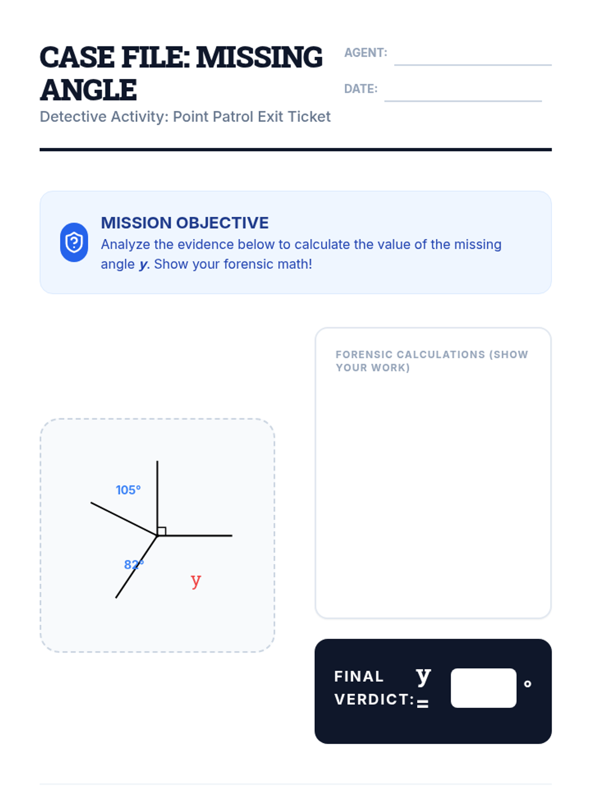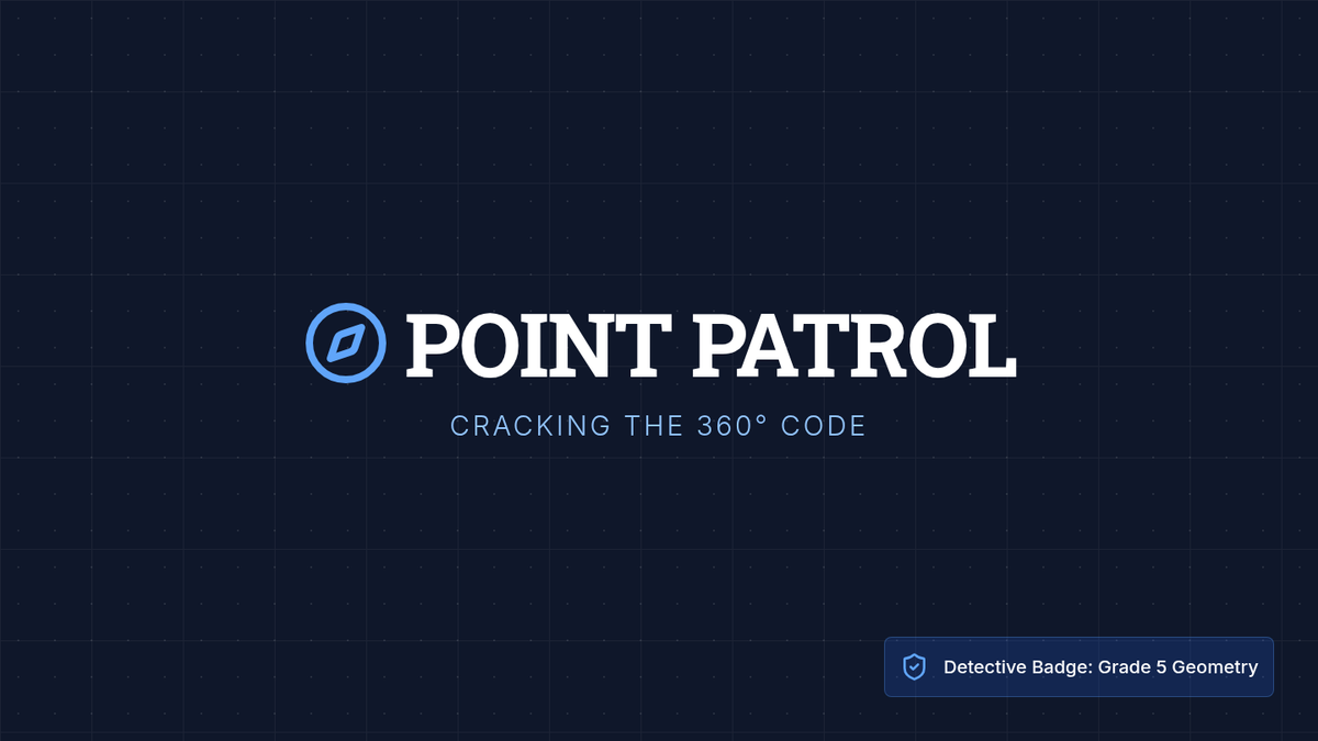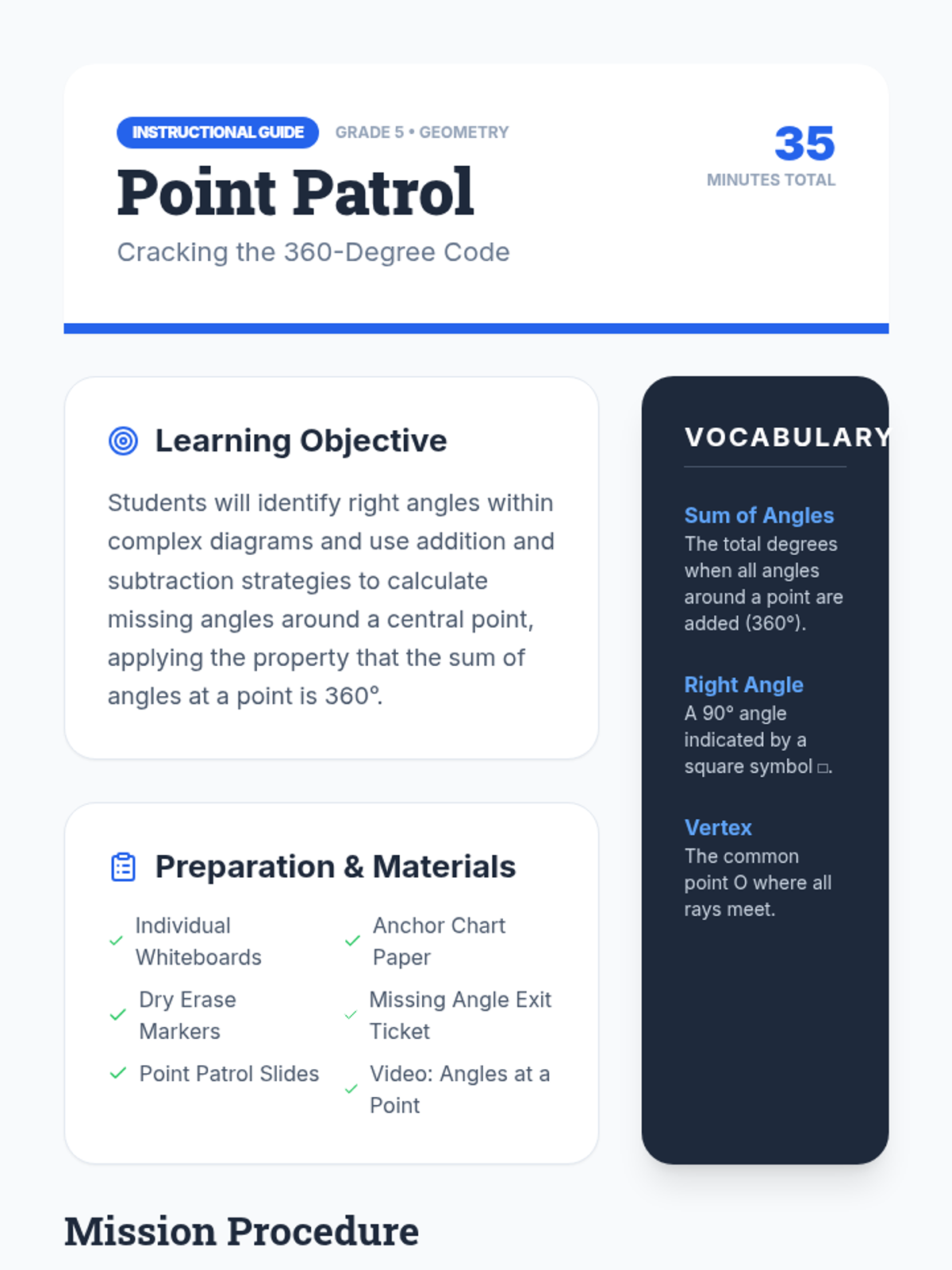 A 5th-grade geometry lesson where students become 'Angle Detectives' to identify right angles and calculate missing angles around a central point using the 360-degree rule.