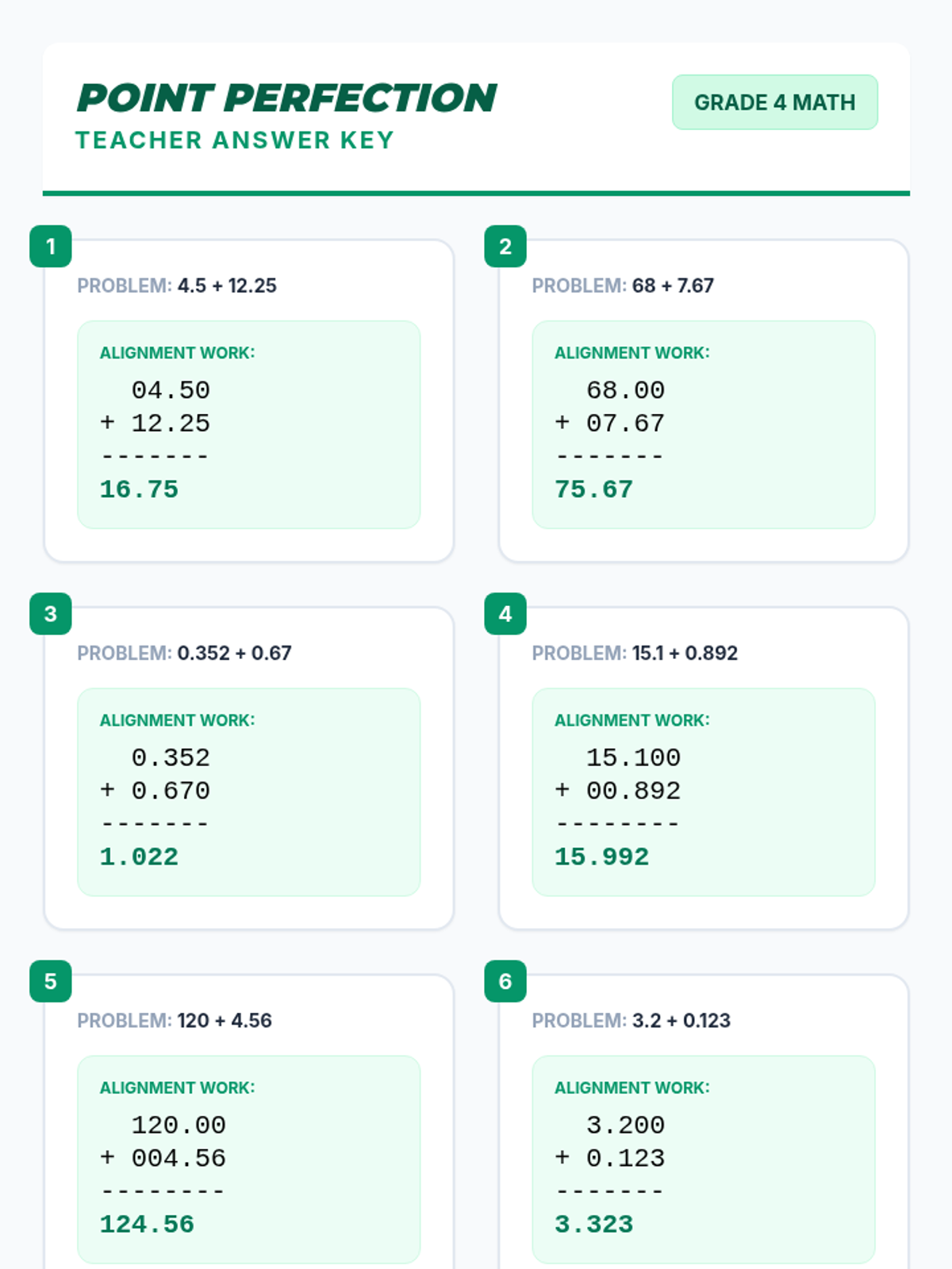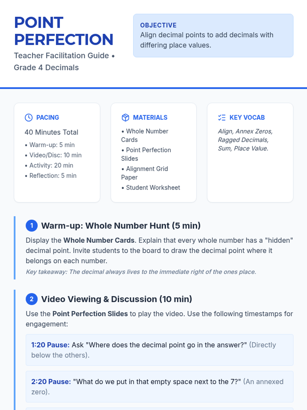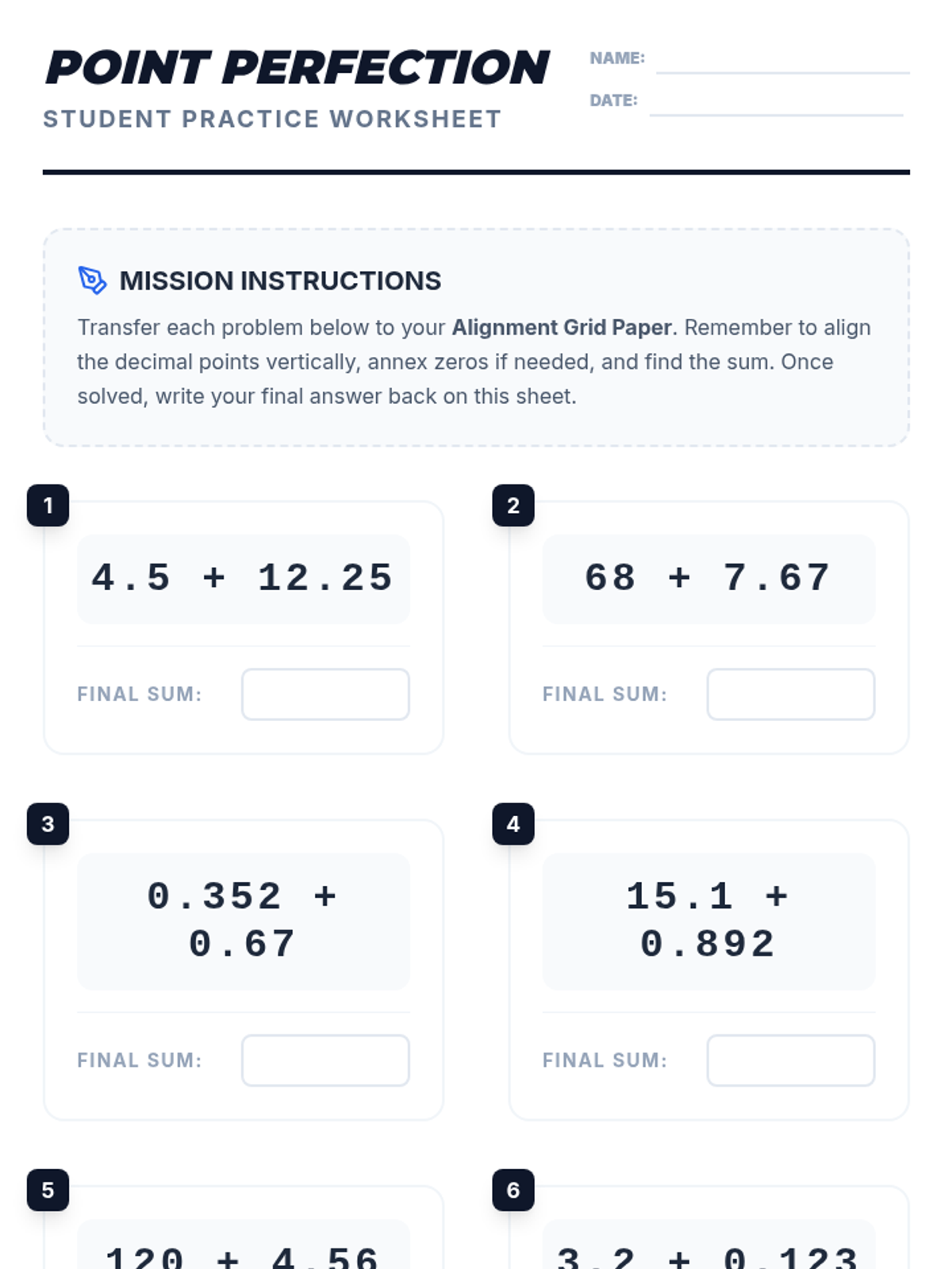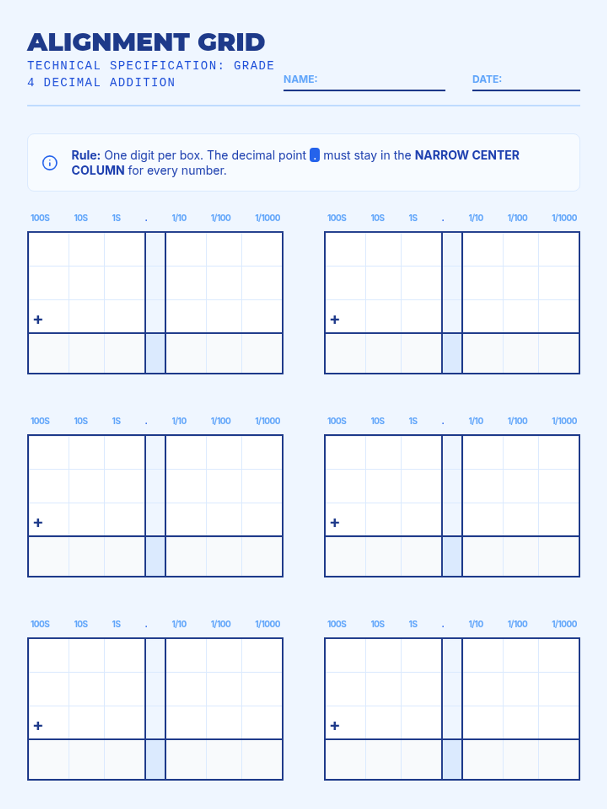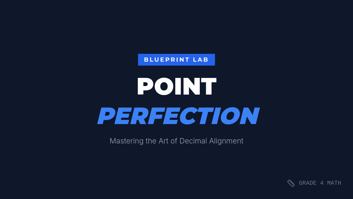 A 4th-grade math lesson focused on the critical skill of aligning decimal points when adding numbers with varying place values, featuring a 'blueprint' theme to emphasize structural precision.