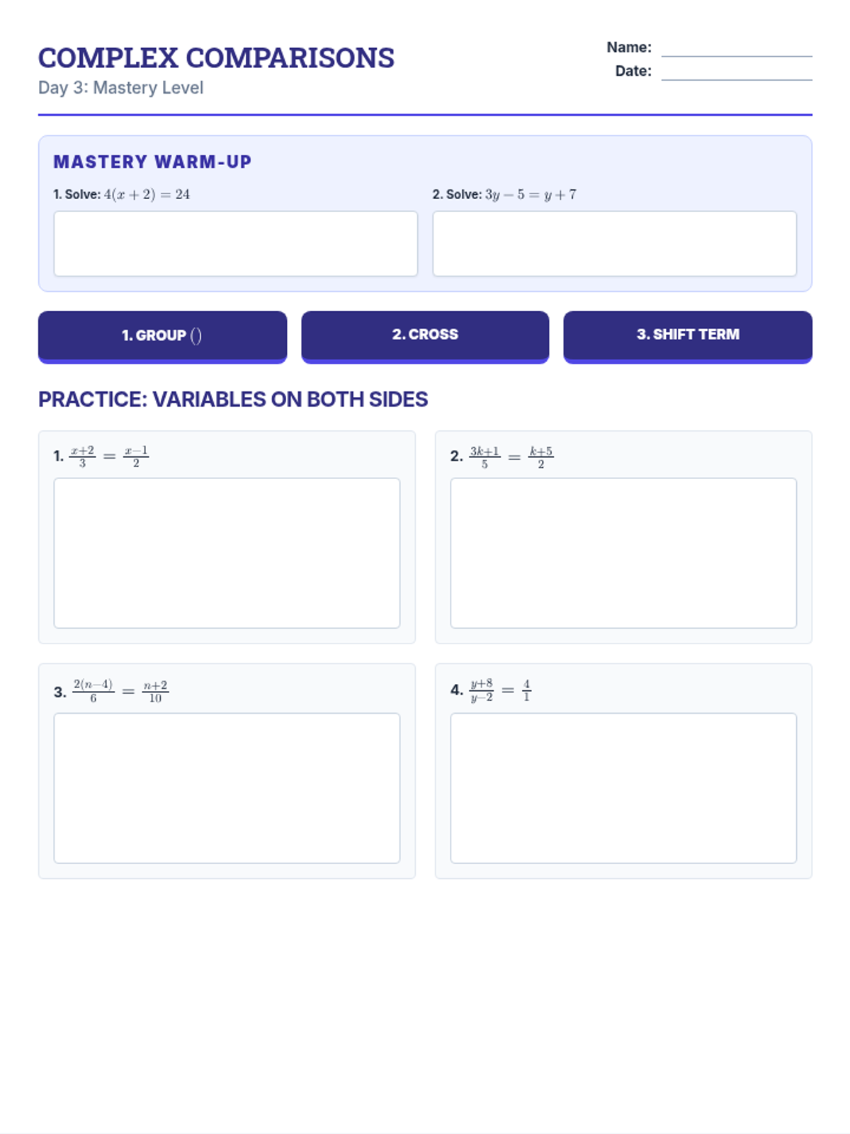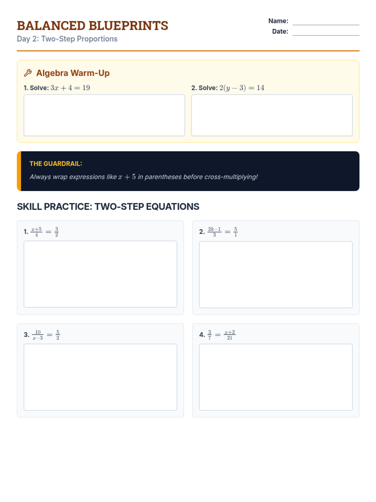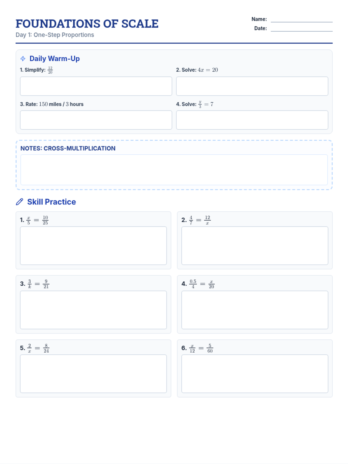 Introduction to proportions and solving one-step equations through cross-multiplication. Real-world contexts include recipe scaling and unit rates.