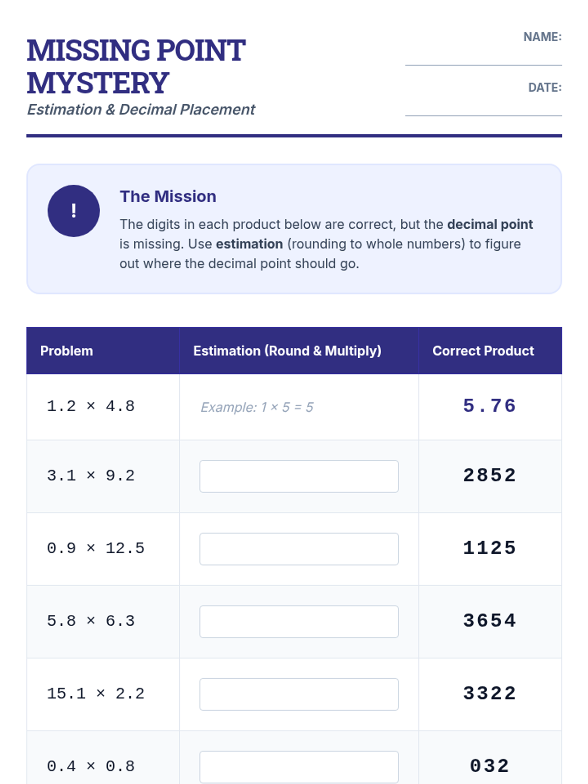 Use estimation to predict the placement of the decimal point in products, bridging the gap between whole numbers and decimals.