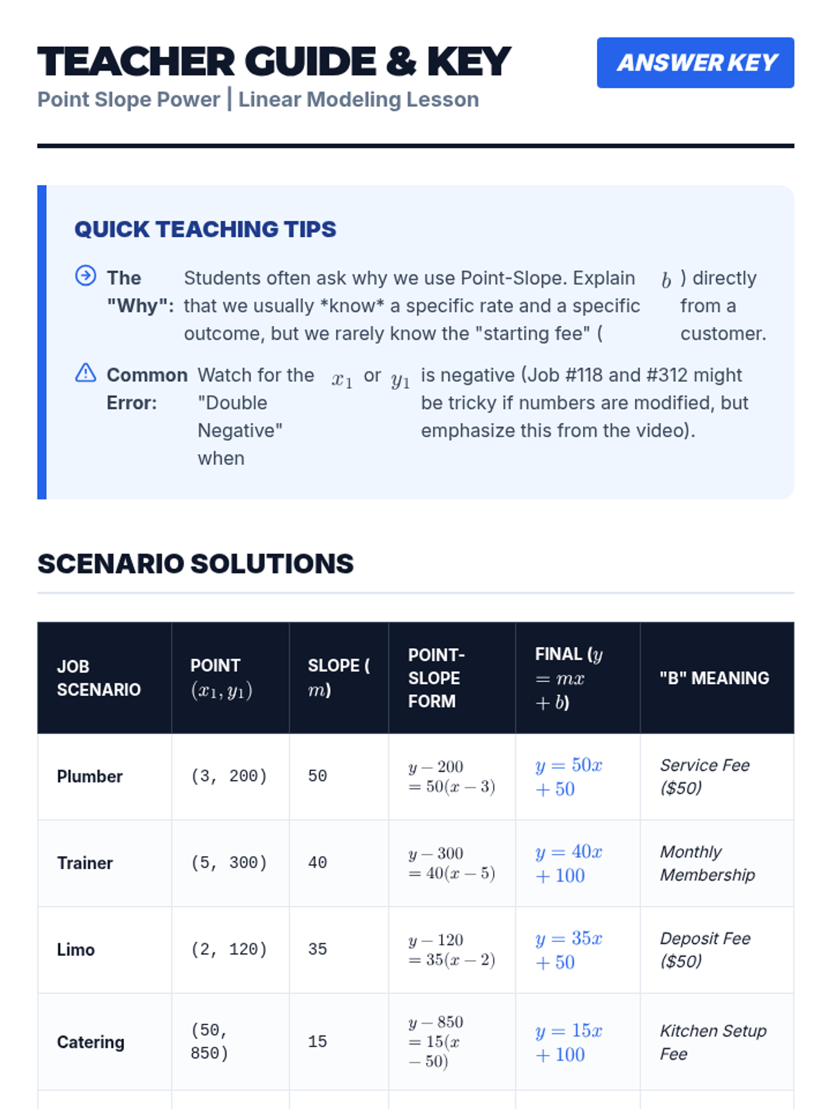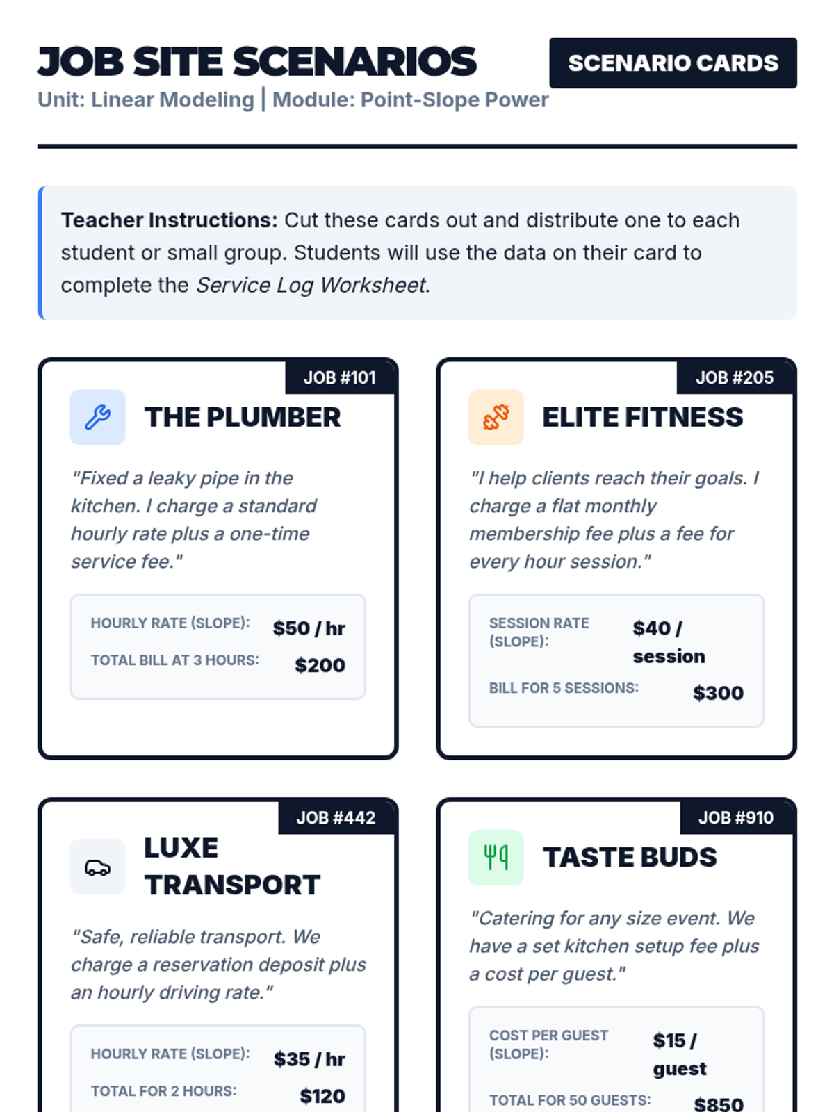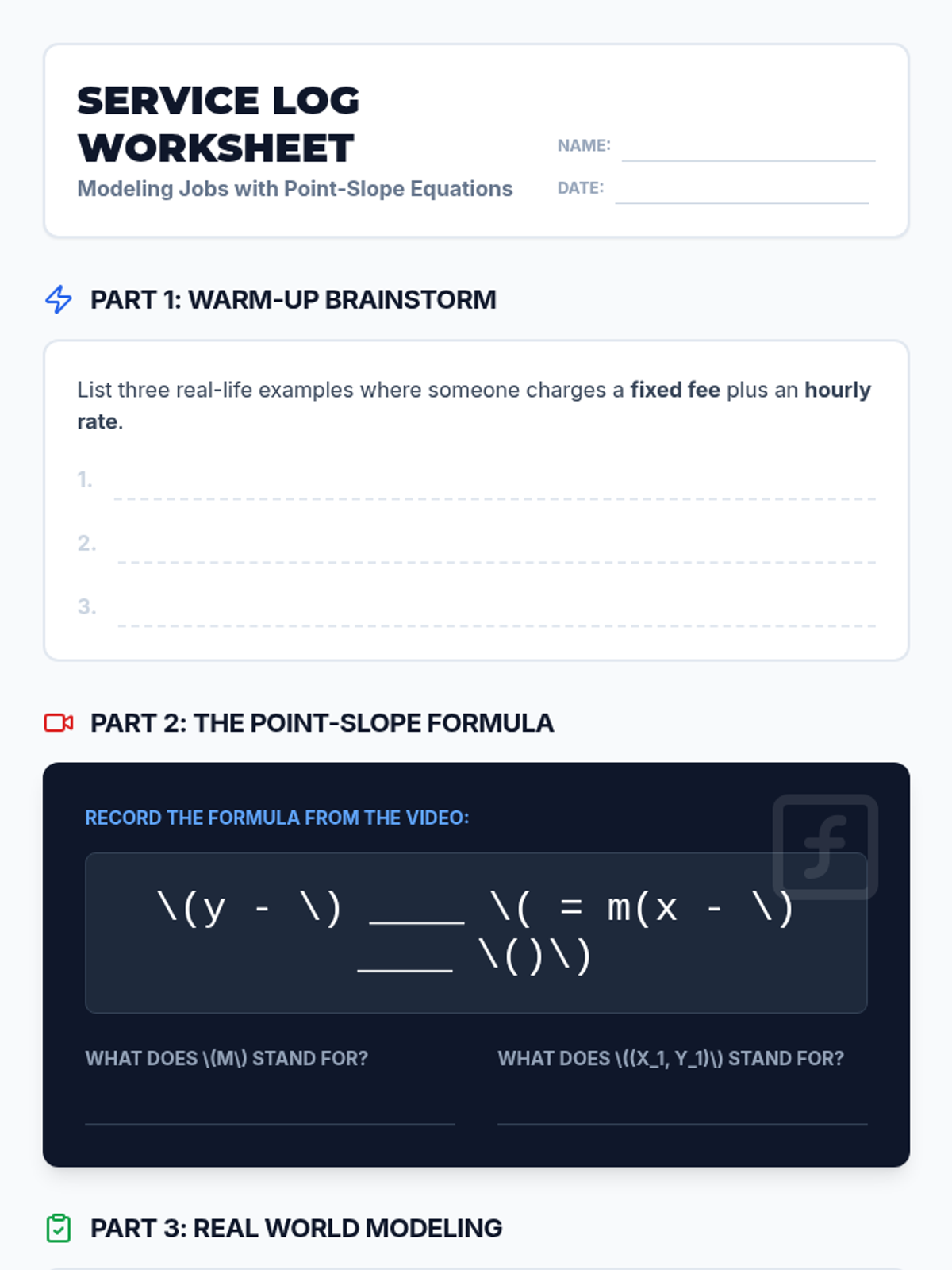 Students learn to model real-world linear relationships using the point-slope formula, translating service call data (time and cost) into mathematical equations.