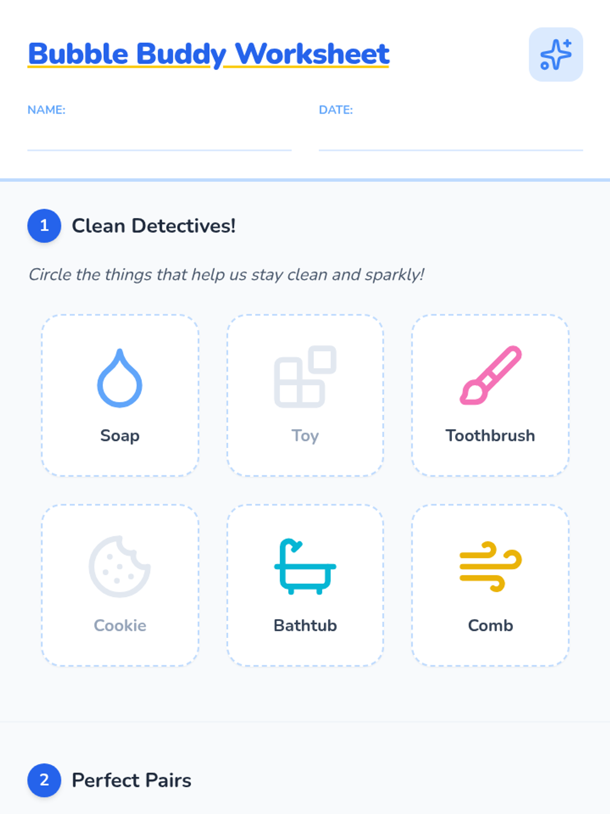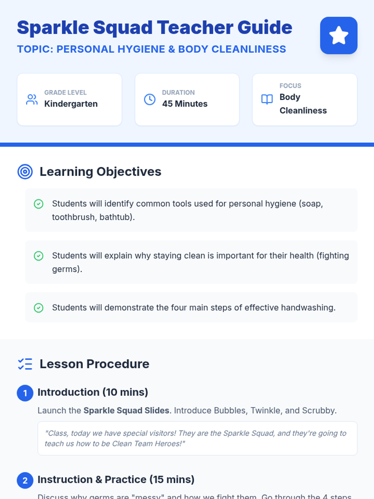 A fun and engaging lesson for kindergarteners about the importance of body cleanliness, featuring the Sparkle Squad characters. Students learn about handwashing, bathing, and brushing teeth through visual aids and interactive activities.